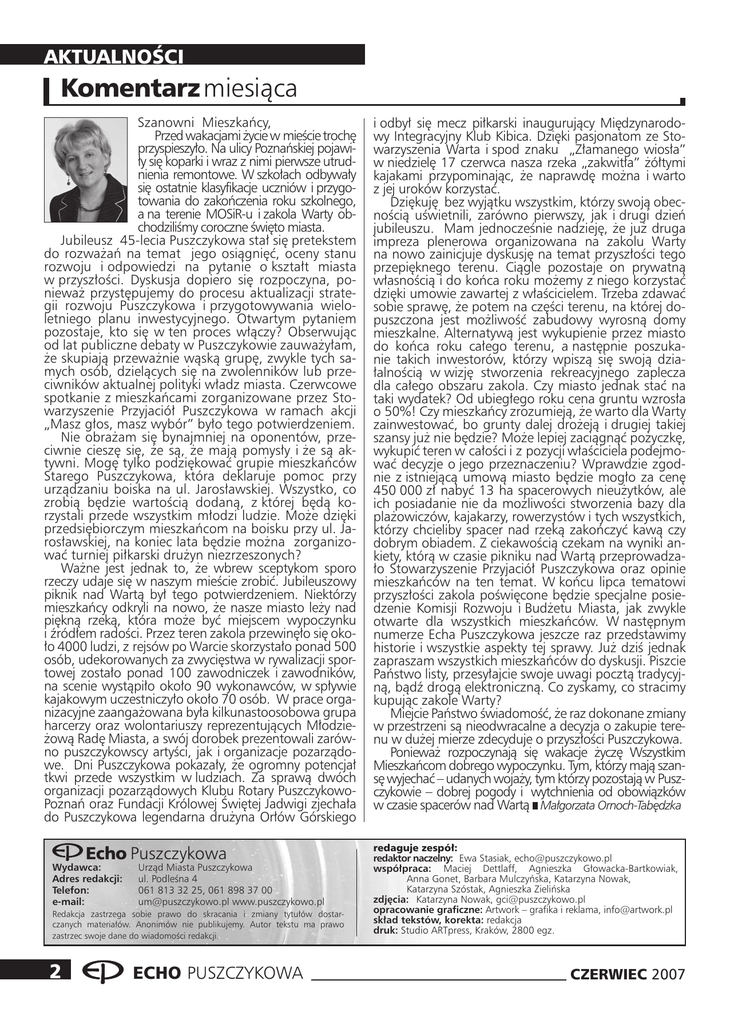 AKTUALNOŚCI Komentarz miesiąca Szanowni Mieszkańcy, Przed wakacjami życie w mieście trochę przyspieszyło. Na ulicy Poznańskiej pojawiły się koparki i wraz z nimi pierwsze utrudnienia remontowe. W szkołach odbywały się ostatnie klasyfikacje uczniów i przygotowania do zakończenia roku szkolnego, a na terenie MOSiR-u i zakola Warty obchodziliśmy coroczne święto miasta. Jubileusz 45-lecia Puszczykowa stał się pretekstem do rozważań na temat jego osiągnięć, oceny stanu rozwoju i odpowiedzi na pytanie o kształt miasta w przyszłości. Dyskusja dopiero się rozpoczyna, ponieważ przystępujemy do procesu aktualizacji strategii rozwoju Puszczykowa i przygotowywania wieloletniego planu inwestycyjnego. Otwartym pytaniem pozostaje, kto się w ten proces włączy? Obserwując od lat publiczne debaty w Puszczykowie zauważyłam, że skupiają przeważnie wąską grupę, zwykle tych samych osób, dzielących się na zwolenników lub przeciwników aktualnej polityki władz miasta. Czerwcowe spotkanie z mieszkańcami zorganizowane przez Stowarzyszenie Przyjaciół Puszczykowa w ramach akcji „Masz głos, masz wybór” było tego potwierdzeniem. Nie obrażam się bynajmniej na oponentów, przeciwnie cieszę się, że są, że mają pomysły i że są aktywni. Mogę tylko podziękować grupie mieszkańców Starego Puszczykowa, która deklaruje pomoc przy urządzaniu boiska na ul. Jarosławskiej. Wszystko, co zrobią będzie wartością dodaną, z której będą korzystali przede wszystkim młodzi ludzie. Może dzięki przedsiębiorczym mieszkańcom na boisku przy ul. Jarosławskiej, na koniec lata będzie można zorganizować turniej piłkarski drużyn niezrzeszonych? Ważne jest jednak to, że wbrew sceptykom sporo rzeczy udaje się w naszym mieście zrobić. Jubileuszowy piknik nad Wartą był tego potwierdzeniem. Niektórzy mieszkańcy odkryli na nowo, że nasze miasto leży nad piękną rzeką, która może być miejscem wypoczynku i źródłem radości. Przez teren zakola przewinęło się około 4000 ludzi, z rejsów po Warcie skorzystało ponad 500 osób, udekorowanych za zwycięstwa w rywalizacji sportowej zostało ponad 100 zawodniczek i zawodników, na scenie wystąpiło około 90 wykonawców, w spływie kajakowym uczestniczyło około 70 osób. W prace organizacyjne zaangażowana była kilkunastoosobowa grupa harcerzy oraz wolontariuszy reprezentujących Młodzieżową Radę Miasta, a swój dorobek prezentowali zarówno puszczykowscy artyści, jak i organizacje pozarządowe. Dni Puszczykowa pokazały, że ogromny potencjał tkwi przede wszystkim w ludziach. Za sprawą dwóch organizacji pozarządowych Klubu Rotary PuszczykowoPoznań oraz Fundacji Królowej Świętej Jadwigi zjechała do Puszczykowa legendarna drużyna Orłów Górskiego Echo Puszczykowa Wydawca: Adres redakcji: Telefon: e-mail: Urząd Miasta Puszczykowa ul. Podleśna 4 061 813 32 25, 061 898 37 00 [email protected] www.puszczykowo.pl Redakcja zastrzega sobie prawo do skracania i zmiany tytułów dostarczanych materiałów. Anonimów nie publikujemy. Autor tekstu ma prawo zastrzec swoje dane do wiadomości redakcji. 2 ECHO PUSZCZYKOWA i odbył się mecz piłkarski inaugurujący Międzynarodowy Integracyjny Klub Kibica. Dzięki pasjonatom ze Stowarzyszenia Warta i spod znaku „Złamanego wiosła” w niedzielę 17 czerwca nasza rzeka „zakwitła” żółtymi kajakami przypominając, że naprawdę można i warto z jej uroków korzystać. Dziękuję bez wyjątku wszystkim, którzy swoją obecnością uświetnili, zarówno pierwszy, jak i drugi dzień jubileuszu. Mam jednocześnie nadzieję, że już druga impreza plenerowa organizowana na zakolu Warty na nowo zainicjuje dyskusję na temat przyszłości tego przepięknego terenu. Ciągle pozostaje on prywatną własnością i do końca roku możemy z niego korzystać dzięki umowie zawartej z właścicielem. Trzeba zdawać sobie sprawę, że potem na części terenu, na której dopuszczona jest możliwość zabudowy wyrosną domy mieszkalne. Alternatywą jest wykupienie przez miasto do końca roku całego terenu, a następnie poszukanie takich inwestorów, którzy wpiszą się swoją działalnością w wizję stworzenia rekreacyjnego zaplecza dla całego obszaru zakola. Czy miasto jednak stać na taki wydatek? Od ubiegłego roku cena gruntu wzrosła o 50%! Czy mieszkańcy zrozumieją, że warto dla Warty zainwestować, bo grunty dalej drożeją i drugiej takiej szansy już nie będzie? Może lepiej zaciągnąć pożyczkę, wykupić teren w całości i z pozycji właściciela podejmować decyzje o jego przeznaczeniu? Wprawdzie zgodnie z istniejącą umową miasto będzie mogło za cenę 450 000 zł nabyć 13 ha spacerowych nieużytków, ale ich posiadanie nie da możliwości stworzenia bazy dla plażowiczów, kajakarzy, rowerzystów i tych wszystkich, którzy chcieliby spacer nad rzeką zakończyć kawą czy dobrym obiadem. Z ciekawością czekam na wyniki ankiety, którą w czasie pikniku nad Wartą przeprowadzało Stowarzyszenie Przyjaciół Puszczykowa oraz opinie mieszkańców na ten temat. W końcu lipca tematowi przyszłości zakola poświęcone będzie specjalne posiedzenie Komisji Rozwoju i Budżetu Miasta, jak zwykle otwarte dla wszystkich mieszkańców. W następnym numerze Echa Puszczykowa jeszcze raz przedstawimy historie i wszystkie aspekty tej sprawy. Już dziś jednak zapraszam wszystkich mieszkańców do dyskusji. Piszcie Państwo listy, przesyłajcie swoje uwagi pocztą tradycyjną, bądź drogą elektroniczną. Co zyskamy, co stracimy kupując zakole Warty? Miejcie Państwo świadomość, że raz dokonane zmiany w przestrzeni są nieodwracalne a decyzja o zakupie terenu w dużej mierze zdecyduje o przyszłości Puszczykowa. Ponieważ rozpoczynają się wakacje życzę Wszystkim Mieszkańcom dobrego wypoczynku. Tym, którzy mają szansę wyjechać – udanych wojaży, tym którzy pozostają w Puszczykowie – dobrej pogody i wytchnienia