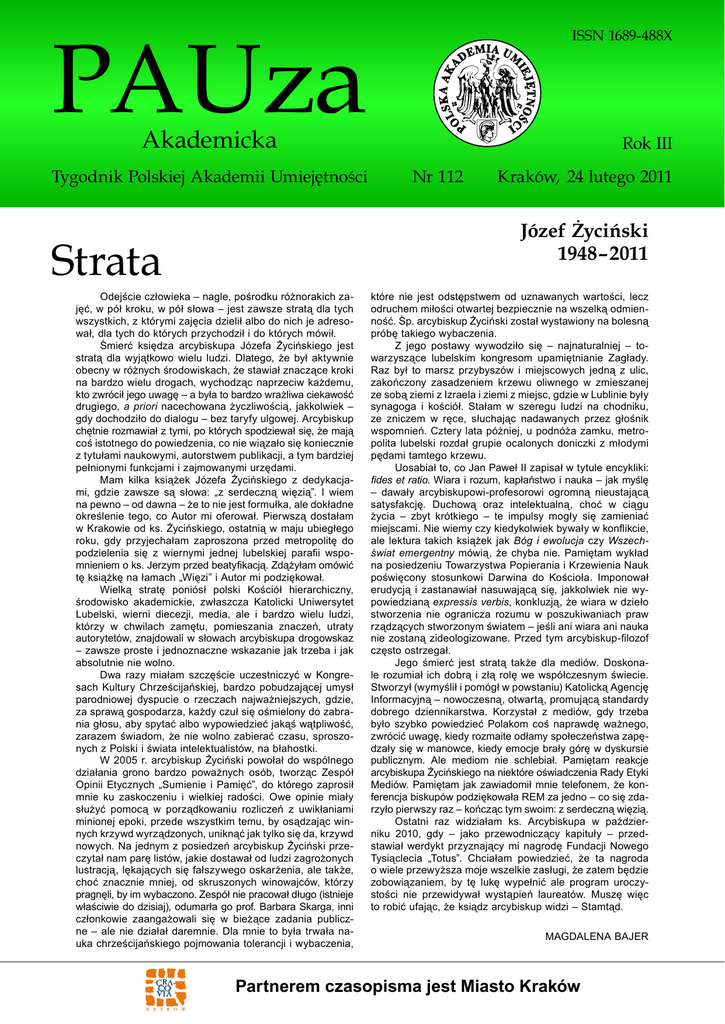 PAUza ISSN 1689-488X Akademicka Tygodnik Polskiej Akademii Umiejętności Rok III Nr 112 Kraków, 24 lutego 2011 Józef Życiński 1948–2011 Strata Odejście człowieka – nagle, pośrodku różnorakich zajęć, w pół kroku, w pół słowa – jest zawsze stratą dla tych wszystkich, z którymi zajęcia dzielił albo do nich je adresował, dla tych do których przychodził i do których mówił. Śmierć księdza arcybiskupa Józefa Życińskiego jest stratą dla wyjątkowo wielu ludzi. Dlatego, że był aktywnie obecny w różnych środowiskach, że stawiał znaczące kroki na bardzo wielu drogach, wychodząc naprzeciw każdemu, kto zwrócił jego uwagę – a była to bardzo wrażliwa ciekawość drugiego, a priori nacechowana życzliwością, jakkolwiek – gdy dochodziło do dialogu – bez taryfy ulgowej. Arcybiskup chętnie rozmawiał z tymi, po których spodziewał się, że mają coś istotnego do powiedzenia, co nie wiązało się koniecznie z tytułami naukowymi, autorstwem publikacji, a tym bardziej pełnionymi funkcjami i zajmowanymi urzędami. Mam kilka książek Józefa Życińskiego z dedykacjami, gdzie zawsze są słowa: „z serdeczną więzią”. I wiem na pewno – od dawna – że to nie jest formułka, ale dokładne określenie tego, co Autor mi oferował. Pierwszą dostałam w Krakowie od ks. Życińskiego, ostatnią w maju ubiegłego roku, gdy przyjechałam zaproszona przed metropolitę do podzielenia się z wiernymi jednej lubelskiej parafii wspomnieniem o ks. Jerzym przed beatyfikacją. Zdążyłam omówić tę książkę na łamach „Więzi” i Autor mi podziękował. Wielką stratę poniósł polski Kościół hierarchiczny, środowisko akademickie, zwłaszcza Katolicki Uniwersytet Lubelski, wierni diecezji, media, ale i bardzo wielu ludzi, którzy w chwilach zamętu, pomieszania znaczeń, utraty autorytetów, znajdowali w słowach arcybiskupa drogowskaz – zawsze proste i jednoznaczne wskazanie jak trzeba i jak absolutnie nie wolno. Dwa razy miałam szczęście uczestniczyć w Kongresach Kultury Chrześcijańskiej, bardzo pobudzającej umysł parodniowej dyspucie o rzeczach najważniejszych, gdzie, za sprawą gospodarza, każdy czuł się ośmielony do zabrania głosu, aby spytać albo wypowiedzieć jakąś wątpliwość, zarazem świadom, że nie wolno zabierać czasu, sproszonych z Polski i świata intelektualistów, na błahostki. W 2005 r. arcybiskup Życiński powołał do wspólnego działania grono bardzo poważnych osób, tworząc Zespół Opinii Etycznych „Sumienie i Pamięć”, do którego zaprosił mnie ku zaskoczeniu i wielkiej radości. Owe opinie miały służyć pomocą w porządkowaniu rozliczeń z uwikłaniami minionej epoki, przede wszystkim temu, by osądzając winnych krzywd wyrządzonych, uniknąć jak tylko się da, krzywd nowych. Na jednym z posiedzeń arcybiskup Życiński przeczytał nam parę listów, jakie dostawał od ludzi zagrożonych lustracją, lękających się fałszywego oskarżenia, ale także, choć znacznie mniej, od skruszonych winowajców, którzy pragnęli, by im wybaczono. Zespół nie pracował długo (istnieje właściwie do dzisiaj), odumarła go prof. Barbara Skarga, inni członkowie zaangażowali się w bieżące zadania publiczne – ale nie działał daremnie. Dla mnie to była trwała nauka chrześcijańskiego pojmowania tolerancji i wybaczenia, które nie jest odstępstwem od uznawanych wartości, lecz odruchem miłości otwartej bezpiecznie na wszelką odmienność. Śp. arcybiskup Życiński został wystawiony na bolesną próbę takiego wybaczenia. Z jego postawy wywodziło się – najnaturalniej – towarzyszące lubelskim kongresom upamiętnianie Zagłady. Raz był to marsz przybyszów i miejscowych jedną z ulic, zakończony zasadzeniem krzewu oliwnego w zmieszanej ze sobą ziemi z Izraela i ziemi z miejsc, gdzie w Lublinie były synagoga i kościół. Stałam w szeregu ludzi na chodniku, ze zniczem w ręce, słuchając nadawanych przez głośnik wspomnień. Cztery lata później, u podnóża zamku, metropolita lubelski rozdał grupie ocalonych doniczki z młodymi pędami tamtego krzewu. Uosabiał to, co Jan Paweł II zapisał w tytule encykliki: fides et ratio. Wiara i rozum, kapłaństwo i nauka – jak myślę – dawały arcybiskupowi-profesorowi ogromną nieustającą satysfakcję. Duchową oraz intelektualną, choć w ciągu życia – zbyt krótkiego – te impulsy mogły się zamieniać miejscami. Nie wiemy czy kiedykolwiek bywały w konflikcie, ale lektura takich książek jak Bóg i ewolucja czy Wszechświat emergentny mówią, że chyba nie. Pamiętam wykład na posiedzeniu Towarzystwa Popierania i Krzewienia Nauk poświęcony stosunkowi Darwina do Kościoła. Imponował erudycją i zastanawiał nasuwającą się, jakkolwiek nie wypowiedzianą expressis verbis, konkluzją, że wiara w dzieło stworzenia nie ogranicza rozumu w poszukiwaniach praw rządzących stworzonym światem – jeśli ani wiara ani nauka nie zostaną zideologizowane. Przed tym arcybiskup-filozof często ostrzegał. Jego śmierć jest stratą także dla mediów. Doskonale rozumiał ich dobrą i złą rolę we współczesnym świecie. Stworzył (wymyślił i pomógł w powstaniu) Katolicką Agencję Informacyjną – nowoczesną, otwartą, promującą standardy dobrego dziennikarstwa. Korzystał z mediów, gdy trzeba było szybko powiedzieć Polakom coś naprawdę ważnego, zwrócić uwagę, kiedy rozmaite odłamy społeczeństwa zapędzały się w manowce, kiedy emocje brały górę w dyskursie publicznym. Ale mediom nie schlebiał. Pamiętam reakcje arcybiskupa Życińskiego na niektóre oświadczenia Rady Etyki Mediów. Pamiętam jak zawiadomił mnie telefonem, że konferencja biskupów podziękowała REM za jedno – co się zdarzyło pierwszy raz – kończąc tym swoim: z serdeczną więzią. Ostatni raz widziałam ks. Arcybiskupa w październiku 2010, gdy – jako przewodniczący kapituły – przedstawia