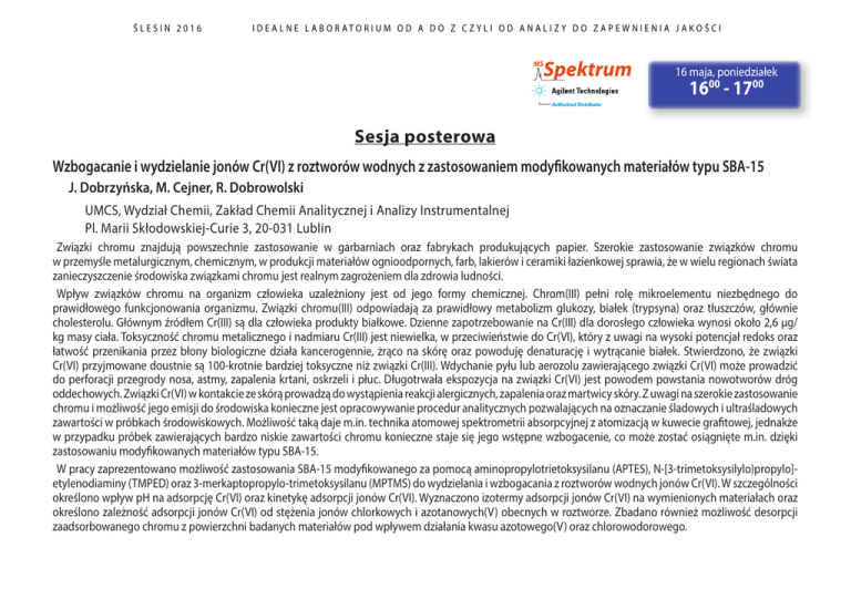 ŚLESIN 2016 I D E A L N E L A B O R ATO R I U M O D A D O Z C Z Y L I O D A N A L I Z Y D O Z A P E W N I E N I A J A K O Ś C I MS Spektrum 16 maja, poniedziałek 1600 - 1700 Sesja posterowa Wzbogacanie i wydzielanie jonów Cr(VI) z roztworów wodnych z zastosowaniem modyfikowanych materiałów typu SBA-15 J. Dobrzyńska, M. Cejner, R. Dobrowolski UMCS, Wydział Chemii, Zakład Chemii Analitycznej i Analizy Instrumentalnej Pl. Marii Skłodowskiej-Curie 3, 20-031 Lublin Związki chromu znajdują powszechnie zastosowanie w garbarniach oraz fabrykach produkujących papier. Szerokie zastosowanie związków chromu w przemyśle metalurgicznym, chemicznym, w produkcji materiałów ognioodpornych, farb, lakierów i ceramiki łazienkowej sprawia, że w wielu regionach świata zanieczyszczenie środowiska związkami chromu jest realnym zagrożeniem dla zdrowia ludności. Wpływ związków chromu na organizm człowieka uzależniony jest od jego formy chemicznej. Chrom(III) pełni rolę mikroelementu niezbędnego do prawidłowego funkcjonowania organizmu. Związki chromu(III) odpowiadają za prawidłowy metabolizm glukozy, białek (trypsyna) oraz tłuszczów, głównie cholesterolu. Głównym źródłem Cr(III) są dla człowieka produkty białkowe. Dzienne zapotrzebowanie na Cr(III) dla dorosłego człowieka wynosi około 2,6 µg/ kg masy ciała. Toksyczność chromu metalicznego i nadmiaru Cr(III) jest niewielka, w przeciwieństwie do Cr(VI), który z uwagi na wysoki potencjał redoks oraz łatwość przenikania przez błony biologiczne działa kancerogennie, żrąco na skórę oraz powoduję denaturację i wytrącanie białek. Stwierdzono, że związki Cr(VI) przyjmowane doustnie są 100-krotnie bardziej toksyczne niż związki Cr(III). Wdychanie pyłu lub aerozolu zawierającego związki Cr(VI) może prowadzić do perforacji przegrody nosa, astmy, zapalenia krtani, oskrzeli i płuc. Długotrwała ekspozycja na związki Cr(VI) jest powodem powstania nowotworów dróg oddechowych. Związki Cr(VI) w kontakcie ze skórą prowadzą do wystąpienia reakcji alergicznych, zapalenia oraz martwicy skóry. Z uwagi na szerokie zastosowanie chromu i możliwość jego emisji do środowiska konieczne jest opracowywanie procedur analitycznych pozwalających na oznaczanie śladowych i ultraśladowych zawartości w próbkach środowiskowych. Możliwość taką daje m.in. technika atomowej spektrometrii absorpcyjnej z atomizacją w kuwecie grafitowej, jednakże w przypadku próbek zawierających bardzo niskie zawartości chromu konieczne staje się jego wstępne wzbogacenie, co może zostać osiągnięte m.in. dzięki zastosowaniu modyfikowanych materiałów typu SBA-15. W pracy zaprezentowano możliwość zastosowania SBA-15 modyfikowanego za pomocą aminopropylotrietoksysilanu (APTES), N-[3-trimetoksysilylo)propylo]etylenodiaminy (TMPED) oraz 3-merkaptopropylo-trimetoksysilanu (MPTMS) do wydzielania i wzbogacania z roztworów wodnych jonów Cr(VI). W szczególności określono wpływ pH na adsorpcję Cr(VI) oraz kinetykę adsorpcji jonów Cr(VI). Wyznaczono izotermy adsorpcji jonów Cr(VI) na wymienionych materiałach oraz określono zależność adsorpcji jonów Cr(VI) od stężenia jonów chlorkowych i azotanowych(V) obecnych w roztworze. Zbadano również możliwość desorpcji zaadsorbowanego chromu z powierzchni badanych materiałów pod wpływem działania kwasu azotowego(V) oraz chlorowodorowego.