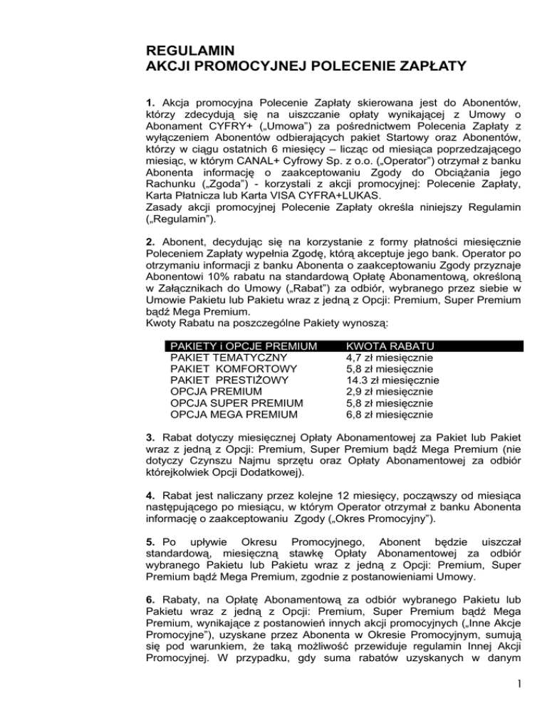 REGULAMIN AKCJI PROMOCYJNEJ POLECENIE ZAPŁATY 1. Akcja promocyjna Polecenie Zapłaty skierowana jest do Abonentów, którzy zdecydują się na uiszczanie opłaty wynikającej z Umowy o Abonament CYFRY+ („Umowa”) za pośrednictwem Polecenia Zapłaty z wyłączeniem Abonentów odbierających pakiet Startowy oraz Abonentów, którzy w ciągu ostatnich 6 miesięcy – licząc od miesiąca poprzedzającego miesiąc, w którym CANAL+ Cyfrowy Sp. z o.o. („Operator”) otrzymał z banku Abonenta informację o zaakceptowaniu Zgody do Obciążania jego Rachunku („Zgoda”) - korzystali z akcji promocyjnej: Polecenie Zapłaty, Karta Płatnicza lub Karta VISA CYFRA+LUKAS. Zasady akcji promocyjnej Polecenie Zapłaty określa niniejszy Regulamin („Regulamin”). 2. Abonent, decydując się na korzystanie z formy płatności miesięcznie Poleceniem Zapłaty wypełnia Zgodę, którą akceptuje jego bank. Operator po otrzymaniu informacji z banku Abonenta o zaakceptowaniu Zgody przyznaje Abonentowi 10% rabatu na standardową Opłatę Abonamentową, określoną w Załącznikach do Umowy („Rabat”) za odbiór, wybranego przez siebie w Umowie Pakietu lub Pakietu wraz z jedną z Opcji: Premium, Super Premium bądź Mega Premium. Kwoty Rabatu na poszczególne Pakiety wynoszą: PAKIETY i OPCJE PREMIUM PAKIET TEMATYCZNY PAKIET KOMFORTOWY PAKIET PRESTIŻOWY OPCJA PREMIUM OPCJA SUPER PREMIUM OPCJA MEGA PREMIUM KWOTA RABATU 4,7 zł miesięcznie 5,8 zł miesięcznie 14.3 zł miesięcznie 2,9 zł miesięcznie 5,8 zł miesięcznie 6,8 zł miesięcznie 3. Rabat dotyczy miesięcznej Opłaty Abonamentowej za Pakiet lub Pakiet wraz z jedną z Opcji: Premium, Super Premium bądź Mega Premium (nie dotyczy Czynszu Najmu sprzętu oraz Opłaty Abonamentowej za odbiór którejkolwiek Opcji Dodatkowej). 4. Rabat jest naliczany przez kolejne 12 miesięcy, począwszy od miesiąca następującego po miesiącu, w którym Operator otrzymał z banku Abonenta informację o zaakceptowaniu Zgody („Okres Promocyjny”). 5. Po upływie Okresu Promocyjnego, Abonent będzie uiszczał standardową, miesięczną stawkę Opłaty Abonamentowej za odbiór wybranego Pakietu lub Pakietu wraz z jedną z Opcji: Premium, Super Premium bądź Mega Premium, zgodnie z postanowieniami Umowy. 6. Rabaty, na Opłatę Abonamentową za odbiór wybranego Pakietu lub Pakietu wraz z jedną z Opcji: Premium, Super Premium bądź Mega Premium, wynikające z postanowień innych akcji promocyjnych („Inne Akcje Promocyjne”), uzyskane przez Abonenta w Okresie Promocyjnym, sumują się pod warunkiem, że taką możliwość przewiduje regulamin Innej Akcji Promocyjnej. W przypadku, gdy suma rabatów uzyskanych w danym 1 miesiącu kalendarzowym na podstawie niniejszego Regulaminu oraz Innych Akcji Promocyjnych, przekracza kwotę standardowej stawki Opłaty Abonamentowej za Pakiet lub Opcje: Premium, Super Premium bądź Mega Premium, Abonent otrzymuje w danym miesiącu maksymalnie 100% rabatu na standardową, miesięczną stawkę Opłaty Abonamentowej za odbiór wybranego Pakietu lub Opcji: Premium, Super Premium bądź Mega Premium, określone w Załącznikach do Umowy. 7. W przypadku, gdy Abonent odwoła Zgodę, zgodnie z treścią ust. 7 Regulaminu Polecenia Zapłaty lub bank Abonenta odrzuci płatność, zgodnie z treścią ust. 5 lub 6 Regulaminu Polecenia Zapłaty, forma płatności zostaje zmieniona na miesięcznie Formularzem Zapłaty. 8. Zmiana formy płatności, zgodnie z pkt. 7 niniejszego Regulaminu, skutkuje utratą Rabatu, począwszy od miesiąca następującego po miesiącu, w którym nastąpiło jedno ze zdarzeń wymienionych w pkt. 7. 9. Abonentowi, któremu w okresie nie przekraczającym 6 miesięcy kalendarzowych, od zmiany formy płatności, zgodnie z pkt. 7 niniejszego Regulaminu, zostanie ponownie zatwierdzona Zgoda, nie przysługuje Rabat. 10. Abonent odbierający pakiet Startowy, który w Okresie Promocyjnym, dokona jego zmiany, nabywa prawo do Rabatu, zgodnie z niniejszym Regulaminem. Rabat będzie naliczany od miesiąca, następującego po miesiącu, w którym Abonent dokona powyższej zmiany do końca Okresu Promocyjnego lub zmiany pakietu na pakiet Startowy. 11. W przypadku zmiany pakietu w Okresie Promocyjnym na pakiet Startowy, Abonent traci prawo do Rabatu. Od miesiąca następującego po miesiącu, w którym została dokonana zmiana pakietu na pakiet Startowy, Abonent będzie uiszczał standardową stawkę Opłaty Abonamentowej, określoną w Załączniku do Umowy. 12. Reklamacje dotyczące akcji promocyjnej Polecenie Zapłaty będą rozpatrywane na zasadach określonych w Regulaminie Umowy. 13. Regulamin akcji promocyjnej Polecenie Zapłaty jest udostępniony w siedzibie Operatora oraz na stronie: www.cyfraplus.com.pl. 14. Zasady realizacji płatności miesięcznie Poleceniem Zapłaty określa Regulamin Polecenia Zapłaty, dostępny w siedzibie Operatora oraz na stronie: www.cyfraplus.com.pl. 15. Regulamin wchodzi w życie z dniem 1 listopada 2005 roku i obowiązuje do odwołania przez Operatora. Operator zastrzega sobie prawo do odwołania Regulaminu w każdym czasie. 2