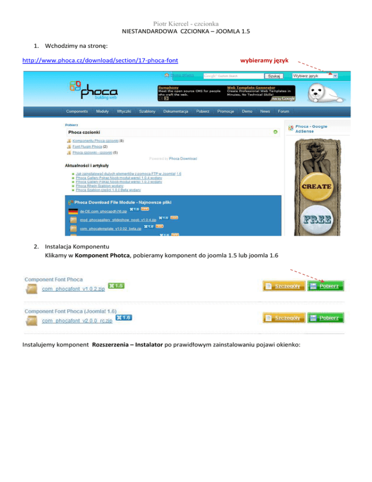 Piotr Kiercel - czcionka NIESTANDARDOWA CZCIONKA – JOOMLA 1.5 1. Wchodzimy na stronę: http://www.phoca.cz/download/section/17-phoca-font wybieramy język 2. Instalacja Komponentu Klikamy w Komponent Photca, pobieramy komponent do joomla 1.5 lub joomla 1.6 Instalujemy komponent Rozszerzenia – Instalator po prawidłowym zainstalowaniu pojawi okienko: Piotr Kiercel - czcionka Klikamy w Install Mamy prawidłowo zainstalowany komponent. 3. Instalacja Pluginu Klikamy w Plugin Photca, pobieramy plugin do joomla 1.5 lub joomla 1.6 Instalujemy plugin Rozszerzenia – Instalator (Pamiętaj aby go włączyć) Piotr Kiercel - czcionka 4. Ściągamy czcionki – Fonts Instalujemy czcionki Komponenty – Phoca Font - Fonts Piotr Kiercel - czcionka i mamy zmienioną czcionkę na naszej stronie