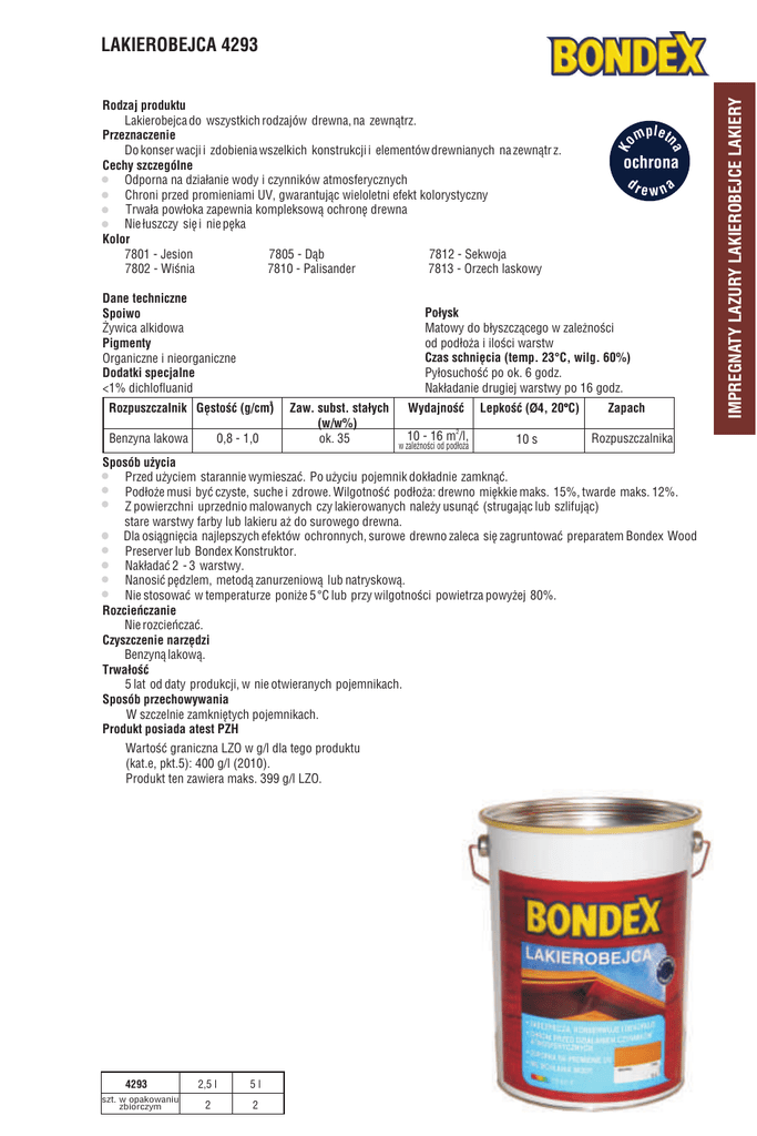 dr ewna Po³ysk Matowy do b³yszcz¹cego w zale¿noœci od pod³o¿a i iloœci warstw Czas schniêcia (temp. 23°C, wilg. 60%) Py³osuchoœæ po ok. 6 godz. Nak³adanie drugiej warstwy po 16 godz. Rozpuszczalnik Gêstoœæ (g/cm)3 Benzyna lakowa ochrona 0,8 - 1,0 Zaw. subst. sta³ych (w/w%) ok. 35 Wydajnoœæ 2 10 - 16 m /l, w zale¿noœci od pod³o¿a Lepkoœæ (Ø4, 20°C ° ) 10 s Zapach Rozpuszczalnika Sposób u¿ycia Przed u¿yciem starannie wymieszaæ. Po u¿yciu pojemnik dok³adnie zamkn¹æ. Pod³o¿e musi byæ czyste, suche i zdrowe. Wilgotnoœæ pod³o¿a: drewno miêkkie maks. 15%, twarde maks. 12%. Z powierzchni uprzednio malowanych czy lakierowanych nale¿y usun¹æ (strugaj¹c lub szlifuj¹c) stare warstwy farby lub lakieru a¿ do surowego drewna. Dla osi¹gniêcia najlepszych efektów ochronnych, surowe drewno zaleca siê zagruntowaæ preparatem Bondex Wood Preserver lub Bondex Konstruktor. Nak³adaæ 2 - 3 warstwy. Nanosiæ pêdzlem, metod¹ zanurzeniow¹ lub natryskow¹. Nie stosowaæ w temperaturze poni¿e 5°C lub przy wilgotnoœci powietrza powy¿ej 80%. Rozcieñczanie Nie rozcieñczaæ. Czyszczenie narzêdzi Benzyn¹ lakow¹. Trwa³oœæ 5 lat od daty produkcji, w nie otwieranych pojemnikach. Sposób przechowywania W szczelnie zamkniêtych pojemnikach. Produkt posiada atest PZH Wartoœæ graniczna LZO w g/l dla tego produktu (kat.e, pkt.5): 400 g/l (2010). Produkt ten zawiera maks. 399 g/l LZO. 4293 szt. w opakowaniu zbiorczym 2,5 l 5l 2 2 IMPREGNATY LAZURY LAKIEROBEJCE LAKIERY Dane techniczne Spoiwo ¯ywica alkidowa Pigmenty Organiczne i nieorganiczne Dodatki specjalne <1% dichlofluanid mplet na Rodzaj produktu Lakierobejca do wszystkich rodzajów drewna, na zewn¹trz. Przeznaczenie Do konser wacji i zdobienia wszelkich konstrukcji i elementów drewnianych na zewn¹tr z. Cechy szczególne Odporna na dzia³anie wody i czynników atmosferycznych Chroni przed promieniami UV, gwarantuj¹c wieloletni efekt kolorystyczny Trwa³a pow³oka zapewnia kompleksow¹ ochronê drewna Nie ³uszczy siê i nie pêka Kolor 7801 - Jesion 7805 - D¹b 7812 - Sekwoja 7802 - Wiœnia 7810 - Palisander 7813 - Orzech laskowy Ko LAKIEROBEJCA 4293