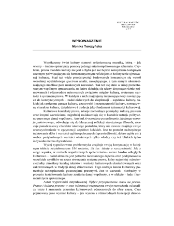 KULTURA I WARTOŚCI ISSN 2299-7806 NR 2 (6) /2013 s. 5–7 WPROWADZENIE Monika Torczyńska Współczesny świat kultury stanowi zróżnicowaną mozaikę, którą – jak wiemy – trudno opisać przy pomocy jednego nieskomplikowanego schematu. Czytelna, prosta mandala kultury nie jest i chyba już nie będzie narzędziem dostępnym uczonym poświęcającym się hermeneutycznym refleksjom o holistycznie ujmowanej kulturze. Stąd też wiele przedsięwzięć badawczych koncentruje się wokół wcześniej wydzielonego spectrum analiz, zawężającego, a tym samym ukonkretniającego możliwe pole naukowych rozważań. Tak też się stało w niżej prezentowanym wspólnym opracowaniu, na które składają się teksty dotyczące różnie pojmowanych i różnorodnie opisywanych związków między kulturą, systemem wartości i systemem prawa. W każdym z nich znajdujemy interesujące tezy nawiązujące do konstytutywnych – nadal ciekawych do eksploracji – aspektów kultury, takich jak społeczna geneza kultury, czasowość i przestrzenność kultury, normatywny charakter kultury, dziedzictwo i tradycja jako fundament tożsamości kulturowej. Kulturowe konteksty prawa, relacje zachodzące pomiędzy kulturą, prawem oraz innymi wartościami, najpełniej uwidaczniają się w kształcie ustroju polityczno-prawnego danej wspólnoty. Artykuł Arystotelesa poszukiwania idealnego ustroju państwowego, odwołując się do klasycznej refleksji starożytnego filozofa, ukazuje ponadczasowy charakter istotnego postulatu, który nie zawsze znajduje swoje urzeczywistnienie w egzystencji wspólnot ludzkich. Jest to postulat nadrzędnego traktowania dóbr i wartości ogólnospołecznych (sprawiedliwość, dobro ogółu etc.) wobec partykularnych wartości właściwych tylko władzy czy też bliskich tylko indywidualnemu obywatelowi. Wyżej sygnalizowana problematyka znajduje swoją kontynuację w kolejnym tekście zatytułowanym Ubi societas, ibi ius: ideały a rzeczywistość. Jak z niego wynika, w realiach współczesnych społeczeństw– nieraz bardzo odległych kulturowo – nadal aktualna jest potrzeba nieustannego dążenia oraz podejmowania wszelkich wysiłków na rzecz stworzenia systemu prawa, który najpełniej odzwierciedlałby określony katalog ideałów i wartości kulturowych ukształtowanych oraz zakorzenionych w tradycji danej zbiorowości. Tego rodzaju kanon kulturowy potrzebuje zabezpieczenia gwarancjami prawnymi. Jest to warunek niezbędny w procesie kształtowania kultury zaufania danej wspólnoty, a w efekcie – ładu i harmonii życia społecznego. Autor wypowiedzi zatytułowanej Wpływ przyspieszenia czasu na prawo. Prawo i kultura prawna w erze informacji rozpoczyna swoje rozważania od analizy istoty i znaczenia przemian kulturowych odnoszonych do sfery czasu. Czas pojmowany jako wymiar kultury – jak wynika z różnorodnych koncepcji chrone- M. TORCZYŃSKA – WPROWADZENIE micznych – przenika każdy obszar aktywności społecznej, w tym również obszar działań związanych ze stanowieniem i stosowaniem prawa. W tym kontekście ukazane są tutaj konsekwencje przyspieszenia czasu, jakie można obserwować w porządku prawnym współczesnego społeczeństwa. Rozwój cywilizacyjny, powodujący między innymi przyspieszenie obiegu informacji, wymusza zmiany, które niosą ze sobą nie tylko szanse, ale i zagrożenia dla systemu prawa. Szczególnie istotnym problemem – szerzej przez omówionym przez autora artykułu – jest zjawisko inflacji prawa. Artykuł mający na celu wyjaśnienie, jak silne jest znaczenie i faktyczny Wpływ społecznej odpowiedzialności biznesu na działalność kancelarii prawnych w polskich i europejskich realiach społeczno-kulturowych, porusza problem sposobów kształtowania równowagi pomiędzy niełatwymi do zbalansowania, szeroko ujmowanymi standardami współczesnej działalności gospodarczej. Z jednej strony, komercyjne przedsięwzięcie skierowane na osiągnięcie zysku zmierza przede wszystkim do wypracowania odpowiedniego wyniku finansowego, z drugiej zaś – do osiągnięcia pozamaterialnych wartości równie cennych w działalności biznesowej, takich jak zaufanie kontrahentów, szacunek do środowiska naturalnego i jego aktywna ochrona, odpowiednie relacje z zatrudnionymi pracownikami. Powyższy problem analizowany jest tutaj w kontekście funkcjonowania kancelarii prawnych. Przedstawiciele kancelarii prawnych (jako jednostki o niezwykle bliskich związkach z prawem) mają szczególny obowiązek przestrzegania reguł społecznej odpowiedzialności biznesu opartej na prawnych fundamentach w postaci katalogu praw człowieka i obywatela. Rozważania zawarte w tekście zatytułowanym Zachowania seksualne młodzieży w kontekście wyzwań współczesności kierują uwagę w stronę problemów i konsekwencji towarzyszących łamaniu rozpowszechnionych norm oraz zasad postępowania. Kultura i prawo posiada szereg sankcji grożących obywatelom w przypadku uchybienia obowiązującym regułom i wartościom. Analizując różnorodne przykłady przestępczości związanej ze sferą aktywności seksualnej młodych ludzi (np. sextingu, cyberbullyingu, cyberstalkingu), autorka tekstu wskazuje na konieczność przeprowadzenia symultanicznych przekształceń w różnych obszarach kultury. Przeciwdziałanie tego typu przestępstwom wymaga nie tylko zmian w dziedzinie obowiązującego prawa, ale również w obowiązujących systemach edukacji i wychowania. Ostatni artykuł, zatytułowany Wolny Internet, wolna kultura, stanowi głos w debacie dotyczącej prawnych aspektów intelektualnej działalności człowieka w dobie rozwoju i upowszechnienia technologii cyfrowych oraz związanej z tym cyfryzacji kultury. Wirtualna przestrzeń kultury regulowana jest dzisiaj przy pomocy norm prawnych, które nie przystają do współczesnych wizji wolnej, swobodnej działalności i partycypacji we wszelkich obszarach kultury. Pojęcie „własność intelektualna” o
