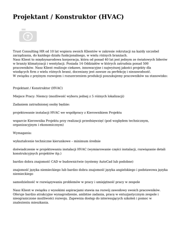 Projektant / Konstruktor (HVAC) Trust Consulting HR od 10 lat wspiera swoich Klientów w zakresie rekrutacji na każdy szczebel zarządzania, do każdego działu funkcjonalnego, w wielu różnych branżach. Nasz Klient to międzynarodowa korporacja, która od ponad 40 lat jest jednym ze światowych liderów w branży klimatyzacji i wentylacji. Posiada 14 Oddziałów w których zatrudnia ponad 500 pracowników. Nasz Klient realizuje ciekawe, innowacyjne i najwyższej jakości projekty dla wiodących firm z wielu różnych branż, doceniany jest zawsze za perfekcję i niezawodność. W związku z prężnym rozwojem i rozszerzeniem produkcji poszukujemy pracowników na stanowisko: Projektant / Konstruktor (HVAC) Miejsce Pracy: Niemcy (możliwość wyboru jednej z 5 różnych lokalizacji) Zadaniem zatrudnionej osoby będzie: projektowanie instalacji HVAC we współpracy z Kierownikiem Projektu wsparcie Kierownika Projektu przy realizacji przedsięwzięć (pod względem technicznym, organizacyjnym i ekonomicznym) Wymagania: wykształcenie techniczne kierunkowe – minimum średnie doświadczenie w projektowaniu instalacji HVAC (wymiarowanie części instalacji, rozwiązanie detali konstrukcyjnych projektów itp.) bardzo dobra znajomość CAD w budownictwie (systemy AutoCad lub podobne) znajomość języka niemieckiego lub bardzo dobra znajomość języka angielskiego i podstawowa języka niemieckiego samodzielność w rozwiązywaniu problemów w pracy i umiejętność pracy w zespole Nasz Klient w związku z wysokimi aspiracjami stawia na rozwój zawodowy swoich pracowników. Oferuje bardzo atrakcyjne wynagrodzenie, ambitne zadania, pracę w entuzjastycznym zespole i nieograniczone możliwości rozwoju. Zapewnia dostęp do interesujących szkoleń i pomoc w znalezieniu mieszkania.