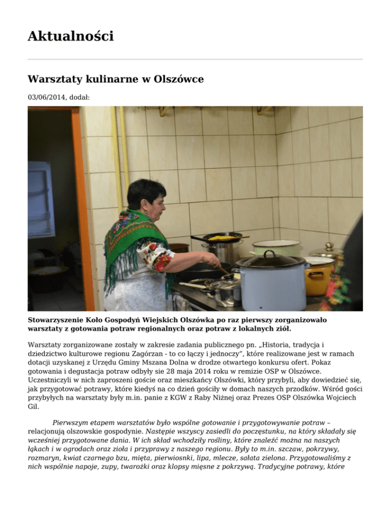Aktualności Warsztaty kulinarne w Olszówce 03/06/2014, dodał: Stowarzyszenie Koło Gospodyń Wiejskich Olszówka po raz pierwszy zorganizowało warsztaty z gotowania potraw regionalnych oraz potraw z lokalnych ziół. Warsztaty zorganizowane zostały w zakresie zadania publicznego pn. „Historia, tradycja i dziedzictwo kulturowe regionu Zagórzan - to co łączy i jednoczy”, które realizowane jest w ramach dotacji uzyskanej z Urzędu Gminy Mszana Dolna w drodze otwartego konkursu ofert. Pokaz gotowania i degustacja potraw odbyły sie 28 maja 2014 roku w remizie OSP w Olszówce. Uczestniczyli w nich zaproszeni goście oraz mieszkańcy Olszówki, który przybyli, aby dowiedzieć się, jak przygotować potrawy, które kiedyś na co dzień gościły w domach naszych przodków. Wśród gości przybyłych na warsztaty były m.in. panie z KGW z Raby Niżnej oraz Prezes OSP Olszówka Wojciech Gil. Pierwszym etapem warsztatów było wspólne gotowanie i przygotowywanie potraw – relacjonują olszowskie gospodynie. Następie wszyscy zasiedli do poczęstunku, na który składały się wcześniej przygotowane dania. W ich skład wchodziły rośliny, które znaleźć można na naszych łąkach i w ogrodach oraz zioła i przyprawy z naszego regionu. Były to m.in. szczaw, pokrzywy, rozmaryn, kwiat czarnego bzu, mięta, pierwiosnki, lipa, mlecze, sałata zielona. Przygotowaliśmy z nich wspólnie napoje, zupy, twarożki oraz klopsy mięsne z pokrzywą. Tradycyjne potrawy, które zostały podane to: kluski z mąki razowej ze słoniną lub śmietaną, kluski kudłate, pierogi, sałatka z pokrzywą. Skosztować można było również tradycyjnie wypiekanego chleba. Wszyscy uczestnicy byli bardzo zadowoleni ze spotkania, szczególnie dlatego, że mogli przypomnieć sobie smaki z dzieciństwa lub zasmakować w nowych potrawach. red. Bożena Kaciczak