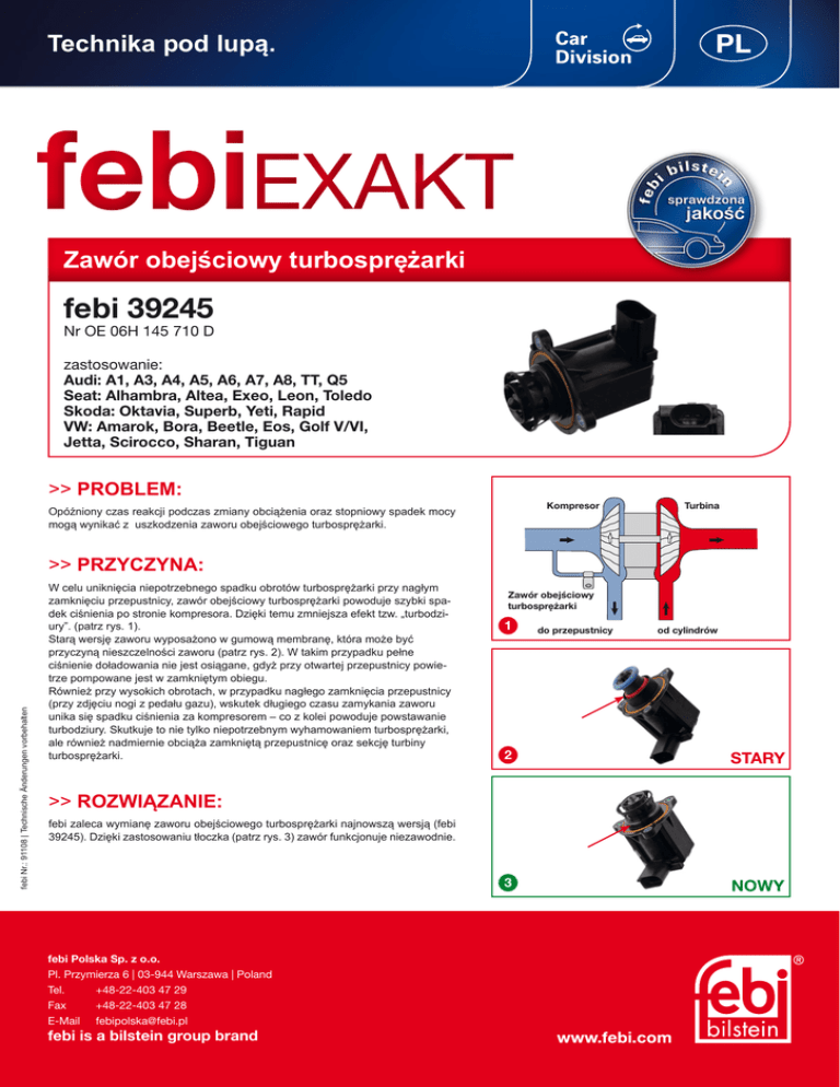 PL Technika pod lupą. febiEXAKT Zawór obejściowy turbosprężarki febi 39245 Nr OE 06H 145 710 D zastosowanie: Audi: A1, A3, A4, A5, A6, A7, A8, TT, Q5 Seat: Alhambra, Altea, Exeo, Leon, Toledo Skoda: Oktavia, Superb, Yeti, Rapid VW: Amarok, Bora, Beetle, Eos, Golf V/VI, Jetta, Scirocco, Sharan, Tiguan >> PROBLEM: Kompresor Opóźniony czas reakcji podczas zmiany obciążenia oraz stopniowy spadek mocy mogą wynikać z uszkodzenia zaworu obejściowego turbosprężarki. Turbina febi Nr.: 91108 | Technische Änderungen vorbehalten >> PRZYCZYNA: W celu uniknięcia niepotrzebnego spadku obrotów turbosprężarki przy nagłym zamknięciu przepustnicy, zawór obejściowy turbosprężarki powoduje szybki spadek ciśnienia po stronie kompresora. Dzięki temu zmniejsza efekt tzw. „turbodziury”. (patrz rys. 1). Starą wersję zaworu wyposażono w gumową membranę, która może być przyczyną nieszczelności zaworu (patrz rys. 2). W takim przypadku pełne ciśnienie doładowania nie jest osiągane, gdyż przy otwartej przepustnicy powietrze pompowane jest w zamkniętym obiegu. Również przy wysokich obrotach, w przypadku nagłego zamknięcia przepustnicy (przy zdjęciu nogi z pedału gazu), wskutek długiego czasu zamykania zaworu unika się spadku ciśnienia za kompresorem – co z kolei powoduje powstawanie turbodziury. Skutkuje to nie tylko niepotrzebnym wyhamowaniem turbosprężarki, ale również nadmiernie obciąża zamkniętą przepustnicę oraz sekcję turbiny turbosprężarki. Zawór obejściowy turbosprężarki 1 do przepustnicy od cylindrów 2 STARY 3 NOWY >> ROZWIĄZANIE: febi zaleca wymianę zaworu obejściowego turbosprężarki najnowszą wersją (febi 39245). Dzięki zastosowaniu tłoczka (patrz rys. 3) zawór funkcjonuje niezawodnie. febi Polska Sp. z o.o. Pl. Przymierza 6 | 03-944 Warszawa | Poland Tel. +48-22-403 47 29 Fax +48-22-403 47 28 [email protected] febi is a bilstein group brand
