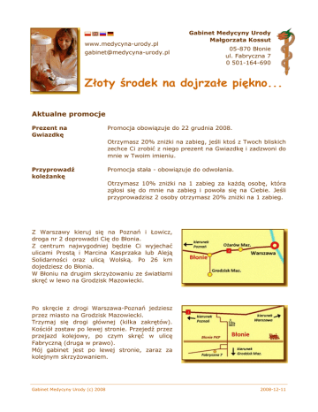 www.medycyna-urody.pl [email protected] Gabinet Medycyny Urody Małgorzata Kossut 05-870 Błonie ul. Fabryczna 7 0 501-164-690 Złoty środek na dojrzałe piękno... Aktualne promocje Prezent na Gwiazdkę Promocja obowiązuje do 22 grudnia 2008. Otrzymasz 20% zniżki na zabieg, jeśli ktoś z Twoch bliskich zechce Ci zrobić z niego prezent na Gwiazdkę i zadzwoni do mnie w Twoim imieniu. Przyprowadź koleżankę Promocja stała - obowiązuje do odwołania. Otrzymasz 10% zniżki na 1 zabieg za każdą osobę, która zgłosi się do mnie na zabieg i powoła się na Ciebie. Jeśli przyprowadzisz 2 osoby otrzymasz 20% zniżki na 1 zabieg. Z Warszawy kieruj się na Poznań i Łowicz, droga nr 2 doprowadzi Cię do Błonia. Z centrum najwygodniej będzie Ci wyjechać ulicami Prostą i Marcina Kasprzaka lub Aleją Solidarności oraz ulicą Wolską. Po 26 km dojedziesz do Błonia. W Błoniu na drugim skrzyżowaniu ze światłami skręć w lewo na Grodzisk Mazowiecki. Po skręcie z drogi Warszawa-Poznań jedziesz przez miasto na Grodzisk Mazowiecki. Trzymaj się drogi głównej (kilka zakrętów). Kościół zostaw po lewej stronie. Przejedź przez przejazd kolejowy, po czym skręć w ulicę Fabryczną (druga w prawo). Mój gabinet jest po lewej stronie, zaraz za kolejnym skrzyżowaniem. Gabinet Medycyny Urody (c) 2008 2008-12-11