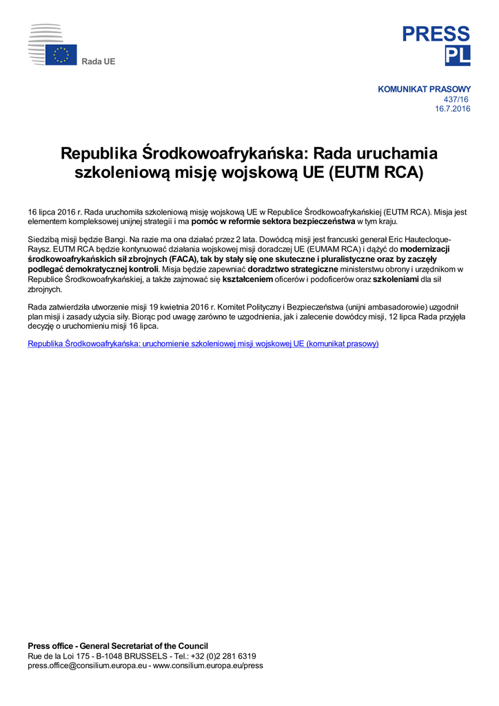 PRESS PL Rada UE KOMUNIKAT PRASOWY 437/16 16.7.2016 Republika Środkowoafrykańska: Rada uruchamia szkoleniową misję wojskową UE (EUTM RCA) 16 lipca 2016 r. Rada uruchomiła szkoleniową misję wojskową UE w Republice Środkowoafrykańskiej (EUTM RCA). Misja jest elementem kompleksowej unijnej strategii i ma pomóc w reformie sektora bezpieczeństwa w tym kraju. Siedzibą misji będzie Bangi. Na razie ma ona działać przez 2 lata. Dowódcą misji jest francuski generał Eric HautecloqueRaysz. EUTM RCA będzie kontynuować działania wojskowej misji doradczej UE (EUMAM RCA) i dążyć do modernizacji środkowoafrykańskich sił zbrojnych (FACA), tak by stały się one skuteczne i pluralistyczne oraz by zaczęły podlegać demokratycznej kontroli. Misja będzie zapewniać doradztwo strategiczne ministerstwu obrony i urzędnikom w Republice Środkowoafrykańskiej, a także zajmować się kształceniem oficerów i podoficerów oraz szkoleniami dla sił zbrojnych. Rada zatwierdziła utworzenie misji 19 kwietnia 2016 r. Komitet Polityczny i Bezpieczeństwa (unijni ambasadorowie) uzgodnił plan misji i zasady użycia siły. Biorąc pod uwagę zarówno te uzgodnienia, jak i zalecenie dowódcy misji, 12 lipca Rada przyjęła decyzję o uruchomieniu misji 16 lipca. Republika Środkowoafrykańska: uruchomienie szkoleniowej misji wojskowej UE (komunikat prasowy) Press office - General Secretariat of the Council Rue de la Loi 175 - B-1048 BRUSSELS - Tel.: +32 (0)2 281 6319 [email protected] - www.consilium.europa.eu/press