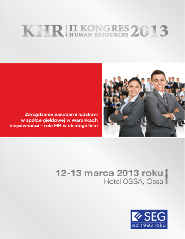 KHR II KONGRES HUMAN RESOURCES 2013 Zarządzanie zasobami ludzkimi w spółce giełdowej w warunkach niepewności – rola hr w strategii firm 12-13 marca 2013 roku Hotel OSSA, Ossa KHR II KONGRES HUMAN RESOURCES 2013 Szanowni Państwo, W imieniu Stowarzyszenia Emitentów Giełdowych mam zaszczyt zaprosić Państwa na II Kongres HR Spółek Giełdowych SEG, który odbędzie się w dniach 12-13 marca br. w Hotelu Ossa w Ossie k/Rawy Mazowieckiej. Tematyka tegorocznego Kongresu będzie dotyczyła aspektów psychologicznych w zarządzaniu kadrami a także ograniczania kosztów pracy poprzez zwiększanie efektywności. W dyskusji plenarnej wezmą udział najwybitniejsi eksperci i praktycy związani z tymi bardzo aktualnymi zagadnieniami. Będziemy mieli także okazję do zapoznania się z najnowszymi rozwiązaniami podnoszącymi efektywność pracy w czasie interesujących warsztatów tematycznych. Rozmawiać będziemy o metodach pomiaru efektywności, o trudnościach związanych z budowaniem zespołu, o dynamice zespołów menedżerskich a także o wielu innych, gorących tematach związanych z obszarem działań HR. Wydarzenia organizowane przez SEG zawierają nie tylko bogaty program merytoryczny, ale także aspekty integracyjne, które pozwolą na zacieśnienie współpracy pomiędzy osobami wykonującymi podobne obowiązki w różnych spółkach. Tym razem mamy przyjemność zaproponować Państwu profesjonalny Turniej Curlingowy, który pozwoli na nawiązanie doskonałych relacji pomiędzy uczestnikami Kongresu. Mając na uwadze wszelkie ograniczenia i trudności jakie stoją przed osobami zarządzającymi działami HR, jesteśmy przekonani, iż proponowany przez SEG program ułatwi Państwu rozwiązywanie wielu skomplikowanych spraw w codziennej pracy. Liczymy na Państwa udział w II Kongresie HR Stowarzyszenia Emitentów Giełdowych. Serdecznie zapraszam do udziału! dr Mirosław Kachniewski Prezes Zarządu Stowarzyszenie Emitentów Giełdowych Udział w Kongresie jest bezpłatny dla spółek należących do SEG. Spółki giełdowe nienależące do SEG mogą wziąć udział w Kongresie zgodnie z cennikiem zawartym w formularzu zgłoszeniowym bądź przystępując do Stowarzyszenia. Liczba miejsc jest ograniczona, decyduje kolejność zgłoszeń. Pierwszeństwo mają spółki SEG. Uczestnicy sami pokrywają koszt zakwaterowania. Formularz zgłoszeniowy należy wypełnić elektronicznie i odesłać do dnia 21.02.2013 roku, klikając w prawym górnym rogu „wyślij formularz” bądź przesłać wypełniony formularz na nr faksu: 22 628 75 99 do dnia 21.02.2013 roku. W sprawie członkostwa w SEG prosimy o kontakt z p. Joanną Bielecką pod numerem tel. (22) 826 26 89 bądź mailowo na adres: [email protected] Program Kongresu 12 MARCA (wtorek) 11.30 – 12.30 Rejestracja gości 12.30 – 13.30 Lunch 13.30 – 13.45 Otwarcie Kongresu Mirosław Kachniewski, Prezes Zarządu, Stowarzyszenie Emitentów Giełdowych 13.45 – 14.15 Wystąpienie Gościa Specjalnego Marzena Herzig, Psycholog Reprezentacji Polski Siatkarzy- Wicemistrzów Świata 2006 14.15 – 15.30 Dyskusja panelowa I: Znaczenie aspektów psychologicznych w zarządzaniu kadrami • psychologia motywacji • psychologia zmiany • typy psychologiczne, a dobór środków przekazu • dynamika zespołu menedżerskiego Prowadzący: Mirosław Kachniewski, Prezes Zarządu, Stowarzyszenie Emitentów Giełdowych Paneliści: Romeo Grzębowski, Prezes Zarządu, Extended DISC Polska Sp. z o.o. Artur Kaźmierczak, HR Consulting Director, PwC Justyna Kubicka-Daab, Director Leadership & Assessment, Amrop Krzysztof Ogonowski, Prezes Zarządu, BPI Polska Sp. z o.o. 15.30 – 15.45 Przerwa kawowa 15.45 – 17.00 Dyskusja panelowa II: Ograniczanie kosztów pracy poprzez zwiększanie efektywności • bezkosztowe formy podnoszenia efektywności • narzędzia zwiększania motywacji – praktyczne przykłady • praca tymczasowa a efektywność organizacji • motywowanie pracowników w czasie kryzysu Prowadzący: Dariusz Witkowski, Dyrektor Generalny, Stowarzyszenie Emitentów Giełdowych Paneliści: Jacek Czeladko, Prezes Zarządu, HR Partner Agnieszka Lechman-Filipiak, Partner, Radca Prawny, DLA Piper Wiater Sp. k. Andrzej Narkiewicz, Principal, Mercer Marsh Benefits Alina Smolarek, Dyrektor Personalny, Centrum Medyczne ENEL-MED S.A. Anna Wicha, Dyrektor Generalny, Adecco Polska 17.30 – 19.30 Drużynowy Turniej Curlingowy z cennymi nagrodami 20.30 Kolacja przy muzyce na żywo 13 MARCA (środa) 9.00 – 10.30 Pierwsza tura warsztatów w grupach* 10.30 – 11.00 Przerwa kawowa 11.00 – 12.30 Druga tura warsztatów w grupach* * szczegółowe informacje na temat warsztatów znajdują się w Formularzu Zgłoszeniowym oraz na stronie www.seg.org.pl www.seg.org.pl Stowarzyszenie Emitentów Giełdowych ul. Nowy Świat 35/5A, 00-029 Warszawa tel.: (22) 826 26 89, faks: (22) 892 90 91 e-mail: [email protected] www.seg.org.pl Partnerzy Partner Strategiczny Patroni Partner Technologiczny Patroni medialni