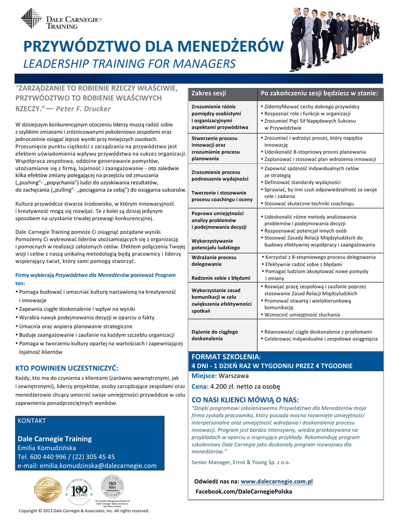 PRZYWÓDZTWO DLA MENEDŻERÓW LEADERSHIP TRAINING FOR MANAGERS “ZARZĄDZANIE TO ROBIENIE RZECZY WŁAŚCIWIE, PRZYWÓDZTWO TO ROBIENIE WŁAŚCIWYCH RZECZY.” — Peter F. Drucker Zakres sesji Po zakończeniu sesji będziesz w stanie: • Zidentyfikować cechy dobrego przywódcy Zrozumienie różnic pomiędzy osobistymi • Rozpoznać role i funkcje w organizacji i organizacyjnymi • Zrozumieć Pięć Sił Napędowych Sukcesu W dzisiejszym konkurencyjnym otoczeniu liderzy muszą radzić sobie aspektami przywództwa w Przywództwie z szybkimi zmianami i zróżnicowanymi pokoleniowo zespołami oraz Stworzenie procesu jednocześnie osiągać lepsze wyniki przy mniejszych zasobach. innowacji oraz Przesunięcie punktu c iężkości z zarządzania n a p rzywództwo j est efektem u świadomienia w pływu przywództwa n a s ukces organizacji. zrozumienie procesu planowania Współpraca zespołowa, oddolne g enerowanie p omysłów, utożsamianie się z firmą, lojalność i z aangażowanie -‐ oto zaledwie efektów zmiany polegającej na przejściu od zmuszania Zrozumienie procesu kilka podnoszenia wydajności („pushing”-‐ „popychania”) ludzi do uzyskiwania rezultatów, do zachęcania („pulling”-‐ „pociągania za sobą”) do osiągania sukcesów. Tworzenie i stosowanie • Zrozumieć i wdrożyć proces, który napędza innowację • Udoskonalić 8-‐stopniowy proces planowania • Zaplanować i stosować plan wdrożenia innowacji • Zapewnić spójność indywidualnych celów ze strategią • Definiować standardy wydajności • Sprawiać, by inni czuli odpowiedzialność za swoje cele i zadania procesu coachingu i oceny • Stosować skuteczne techniki coachingu Kultura przywódcza stwarza środowisko, w którym innowacyjność i kreatywność mogą się rozwijać. Te z kolei są dzisiaj jedynym sposobem na uzyskanie trwałej przewagi konkurencyjnej. Poprawa umiejętności analizy problemów i podejmowania decyzji Dale Carnegie Training pomoże Ci osiągnąć pożądane wyniki. Pomożemy Ci wykreować liderów utożsamiających się z organizacją Wykorzystywanie i pomocnych w realizacji założonych celów. Efektem połączenia Twojej potencjału ludzkiego wizji i celów z naszą unikalną metodologią będą pracownicy i liderzy wspierający ś wiat, k tóry sami p omogą stworzyć. Wdrażanie procesu delegowania wybierają Przywództwo dla Menedżerów ponieważ Program Radzenie Firmy sobie z błędami ten: zasad • Pomaga budować i umacniać kulturę nastawioną na kreatywność Wykorzystanie komunikacji w celu i innowacje zwiększenia efektywności • Zapewnia ciągłe doskonalenie i wpływ na wyniki spotkań • Wyrabia nawyk podejmowania decyzji w oparciu o fakty • Umacnia oraz wspiera planowanie strategiczne Dążenie do ciągłego • Buduje zaangażowanie i zaufanie na każdym szczeblu organizacji doskonalenia • Pomaga w tworzeniu kultury opartej na wartościach i zapewniającej lojalność klientów • Udoskonalić różne metody analizowania problemów i podejmowania decyzji • Rozpoznawać potencjał innych osób • Stosować Zasady Relacji Międzyludzkich do budowy efektywnej współpracy i zaangażowania • Korzystać z 8-‐stopniowego procesu delegowania • Efektywnie radzić sobie z błędami • Pomagać ludziom akceptować nowe pomysły i zmiany • Rozwijać pracę zespołową i zaufanie poprzez stosowanie Zasad Relacji Międzyludzkich • Promować otwartą i wielokierunkową komunikację • Wzmocnić umiejętność słuchania • Równoważyć ciągłe doskonalenie z przełomami • Celebrować indywidualne i zespołowe osiągnięcia FORMAT SZKOLENIA: KTO POWINIEN UCZESTNICZYĆ: 4 DNI -‐ 1 DZIEŃ RAZ W TYGODNIU PRZEZ 4 TYGODNIE Warszawa Każdy, kto ma do czynienia z klientami (zarówno wewnętrznymi, jak Miejsce: i zewnętrznymi), liderzy projektów, osoby zarządzające zespołami oraz Cena: 4.200 zł. netto za osobę menedżerowie chcący umocnić swoje umiejętności przywódcze w celu CO NASI KLIENCI MÓWIĄ O NAS: zapewnienia ponadprzeciętnych wyników. “Dzięki programowi szkoleniowemu Przywództwo dla Menedżerów moja firma zyskała pracownika, który posiada mocno rozwinięte umiejętności KONTAKT interpersonalne oraz umiejętność wdrażania i doskonalenia procesu innowacji. Program jest bardzo intensywny, wiedza przekazywana na przykładach w oparciu o inspirujące przykłady. Rekomenduję program Dale Carnegie Training szkoleniowy Dale Carnegie jako doskonały program rozwojowy dla Emilia Komudzińska menedżerów.” Tel. 600 440 996 / (22) 305 45 45 e-‐mail: [email protected] Senior Manager, Ernst & Young Sp. z o.o.zyskała pracownika, który posiada mocno rozwinięte umiejętności Odwiedź nas na: www.dalecarnegie.com.pl Facebook.com/DaleCarnegiePolska Copyright © 2013 Dale Carnegie & Associates, Inc. All rights reserved. interpersonalne