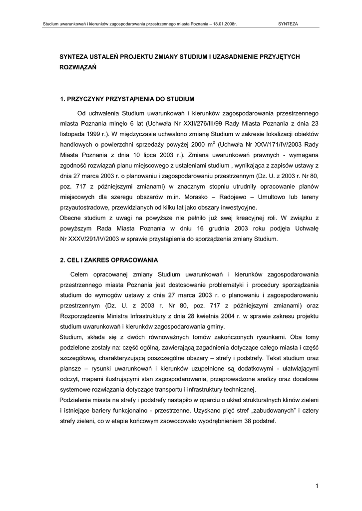 Studium uwarunkowań i kierunków zagospodarowania przestrzennego miasta Poznania – 18.01.2008r. SYNTEZA SYNTEZA USTALEŃ PROJEKTU ZMIANY STUDIUM I UZASADNIENIE PRZYJĘTYCH ROZWIĄZAŃ 1. PRZYCZYNY PRZYSTĄPIENIA DO STUDIUM Od uchwalenia Studium uwarunkowań i kierunków zagospodarowania przestrzennego miasta Poznania minęło 6 lat (Uchwała Nr XXII/276/III/99 Rady Miasta Poznania z dnia 23 listopada 1999 r.). W międzyczasie uchwalono zmianę Studium w zakresie lokalizacji obiektów handlowych o powierzchni sprzedaży powyżej 2000 m2 (Uchwała Nr XXV/171/IV/2003 Rady Miasta Poznania z dnia 10 lipca 2003 r.). Zmiana uwarunkowań prawnych - wymagana zgodność rozwiązań planu miejscowego z ustaleniami studium , wynikająca z zapisów ustawy z dnia 27 marca 2003 r. o planowaniu i zagospodarowaniu przestrzennym (Dz. U. z 2003 r. Nr 80, poz. 717 z późniejszymi zmianami) w znacznym stopniu utrudniły opracowanie planów miejscowych dla szeregu obszarów m.in. Morasko – Radojewo – Umultowo lub tereny przyautostradowe, przewidzianych od kilku lat jako obszary inwestycyjne. Obecne studium z uwagi na powyższe nie pełniło już swej kreacyjnej roli. W związku z powyższym Rada Miasta Poznania w dniu 16 grudnia 2003 roku podjęła Uchwałę Nr XXXV/291/IV/2003 w sprawie przystąpienia do sporządzenia zmiany Studium. 2. CEL I ZAKRES OPRACOWANIA Celem opracowanej zmiany Studium uwarunkowań i kierunków zagospodarowania przestrzennego miasta Poznania jest dostosowanie problematyki i procedury sporządzania studium do wymogów ustawy z dnia 27 marca 2003 r. o planowaniu i zagospodarowaniu przestrzennym (Dz. U. z 2003 r. Nr 80, poz. 717 z późniejszymi zmianami) oraz Rozporządzenia Ministra Infrastruktury z dnia 28 kwietnia 2004 r. w sprawie zakresu projektu studium uwarunkowań i kierunków zagospodarowania gminy. Studium, składa się z dwóch równoważnych tomów zakończonych rysunkami. Oba tomy podzielone zostały na: część ogólną, zawierającą zagadnienia dotyczące całego miasta i część szczegółową, charakteryzującą poszczególne obszary – strefy i podstrefy. Tekst studium oraz plansze – rysunki uwarunkowań i kierunków uzupełnione są dodatkowymi - ułatwiającymi odczyt, mapami ilustrującymi stan zagospodarowania, przeprowadzone analizy oraz docelowe systemowe rozwiązania dotyczące transportu i infrastruktury technicznej. Podzielenie miasta na strefy i podstrefy nastąpiło w oparciu o układ strukturalnych klinów zieleni i istniejące bariery funkcjonalno - przestrzenne. Uzyskano pięć stref „zabudowanych” i cztery strefy zieleni, co w etapie końcowym zaowocowało wyodrębnieniem 38 podstref. 1 Studium uwarunkowań i kierunków zagospodarowania przestrzennego miasta Poznania – 18.01.2008r. SYNTEZA 3. SYNTEZA UWARUNKOWAŃ W poniższej syntezie ujęte zostały przede wszystkim te uwarunkowania, które miały bezpośredni wpływ na ustalenie kierunków i zasad zagospodarowania przestrzennego miasta. 3.1. UWARUNKOWANIA ZEWNĘTRZNE Po wejściu Polski do Unii Europejskiej - dla gospodarczego i przestrzennego rozwoju Poznania szczególnego znaczenia nabiera Europejska Perspektywa Rozwoju Przestrzennego (ESDP) na rzecz trwałego i zrównoważonego rozwoju obszaru Unii Europejskiej, przyjęta w 1999 r., określająca główne cele polityki przestrzennej. W odniesieniu do naszego miasta są to: - uznanie Poznania jako jednego z ośrodków rozwoju społeczno – gospodarczego o znaczeniu europejskim (europola) w procesie kształtowania się Europejskiej Sieci Miast, wzmocnionego położeniem w zasięgu oddziaływania funkcjonalnego aglomeracji Berlina, - położenie miasta w europejskim węźle transportowym, na szlakach objętych międzynarodowymi umowami transportowymi, - wyznaczenie doliny Warty, głównej osi układu przyrodniczego Wielkopolski, stanowiącej korytarz ekologiczny o randze krajowej, jako elementu europejskiej sieci ekologicznej ECONET PL; także pierścień fortyfikacji poznańskich został wyznaczony zgodnie z Dyrektywą Siedliskową jako obszar punktowy współtworzący europejską sieć ekologiczną NATURA 2000. Z kolei Koncepcja Polityki Przestrzennego Zagospodarowania Kraju, przyjęta przez Sejm RP w 2000r., w polityce kształtowania europoli określa Poznań, razem z Warszawą, Trójmiastem i Krakowem, jako jedno z głównych miast z najwyższymi szansami na dalszy rozwój i awans w przyszłości w europejskim systemie wielkich miast. Istotnym elementem w rozwoju miasta jest także zakładany szybki wzrost znaczenia lotniska Ławica – podniesienie rangi z lotniska regionalnego do krajowego z obsługą ruchu międzynarodowego. Uwarunkowania regionalne dla Poznania jako stolicy województwa określone zostały w planie zagospodarowania przestrzennego województwa wielkopolskiego z 2001 r. Obok uwarunkowań wynikających z Koncepcji Polityki Przestrzennego Zagospodarowania Kraju, plan przypisuje miastu rolę dominującą jako: - ośrodka o ponadregionalnych funkcjach usługowych (również o znaczeniu krajowym i międzynarodowym), szczególnie w dziedzinie nauki i szkolnictwa wyższego, kultury, opieki zdrowotnej i sportu oraz handlu, - miasta o najwyższym znaczeniu kulturowym w regionie i jako miejsca szczególnie cennego dla kultury narodowej, - ośrodka koncentracji wszystkich głównych czynników sprzyjających rozwojowi przemysłu. Plan zwraca także uwagę na konieczność wzmocnienia roli żeglownego odcinka rzeki Warty, w tym jej odcinka miejskiego. 2 Studium uwarunkowań i kierunków zagospodarowania przestrzennego miasta Poznania – 18.01.2008r. SYNTEZA 3.2. UWARUNKOWANIA ŚRODOWISKA PRZYRODNICZEGO Poznań cechuje dość urozmaicone ukształtowanie terenu. Widoczną formą jest Przełomowa Dolina Warty, której dno znajduje się na wysokości 45 m n.p.m., o szerokości w okolicach Śródmieścia do 4 km, a na północy do 1,5 km. W krajobrazie wyróżniają się formy wysoczyzn morenowych z kulminacją Góry Moraski