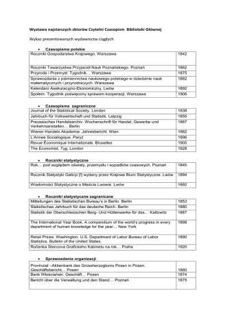 Wystawa najstarszych zbiorów Czytelni Czasopism Biblioteki Głównej Wykaz prezentowanych wydawnictw ciągłych Czasopisma polskie Roczniki Gospodarstwa Krajowego. Warszawa Roczniki Towarzystwa Przyjaciół Nauk Poznańskiego. Poznań Przyroda i Przemysł. Tygodnik… Warszawa Sprawozdania z piśmiennictwa naukowego polskiego w dziedzinie nauk matematycznych i przyrodniczych. Warszawa Kalendarz Asekuracyjno-Ekonomiczny. Lwów Społem. Tygodnik poświęcony sprawom kooperacji. Warszawa Czasopisma zagraniczne Journal of the Statistical Society. London Jahrbuch fűr Volkswirtschaft und Statistik. Leipzig Preussisches Handelsarchiv. Wochenschrift fűr Handel, Gewerbe und Verkehrsanstalten… Berlin Wiener Handels Akademie. Jahresbericht. Wien L’Annee Socialogique. Paryż Revue Économique Internationale. Bruxelles The Economist. Tyg. London 1842 1862 1875 1882 1892 1906 1838 1855 1867 1882 1896 1905 1928 Roczniki statystyczne Rok… pod względem oświaty, przemysłu i wypadków czasowych. Poznań 1845 Rocznik Statystyki Galicyi [!] wydany przez Krajowe Biuro Statystyczne. Lwów 1894 Wiadomości Statystyczne o Mieście Lwowie. Lwów 1892 Roczniki statystyczne zagraniczne Mitteilungen des Statistischen Bureau’s in Berlin. Berlin Statistisches Jahrbuch fűr das deutsche Reich. Berlin Statistik der Oberschlesischen Berg- Und Hűttenwerke fűr das… Kattowitz 1853 1880 1887 The International Year Book. A compendium of the world’s progress in every department of human knowledge for the year… New York 1898 Retail Prices. Washington. U.S. Department of Labor Bureau of Labor Statistics. Bulletin of the United States. Ročenka Stencova Grafickeho Kabinetu na rok… Praha 1890 1920 Sprawozdania organizacji Provinzial –Aktienbank des Grossherzogtums Posen in Posen. Geschäftsbericht… Posen Bank Włościański. Geschäft… Posen Bericht über die Verwaltung und den Stand… Poznań 1860 1874 1875 Towarzystwo Pożyczkowe Przemysłowców Miasta Poznania. Sprawozdanie… 1878 z czynności w roku… Poznań Siebenter Geschäfts - Abschluss - der Vesta Bank Związku spółek Zarobkowych w Poznaniu. Jahresbericht der…. Poznań 1880 1895 Bazar Poznański. Tow. Akc. Poznań 1915 Dokumenty życia społecznego Adress – Und Geschäft - Handbuch der Stadt Posen. Poznań Handlowiec. Adreso – Skorowidz województw rzeczypospolitej Polskiej… Lwów Spis abonentów sieci telefonicznych państwowych i koncesjonowanych w Polsce (z wyjątkiem m.st. Warszawy). Warszawa Spis abonentów sieci telefonicznych państwowych i koncesjonowanych w Polsce (z wyjątkiem m.st. Warszawy). Warszawa 1893 1921 1932 1934