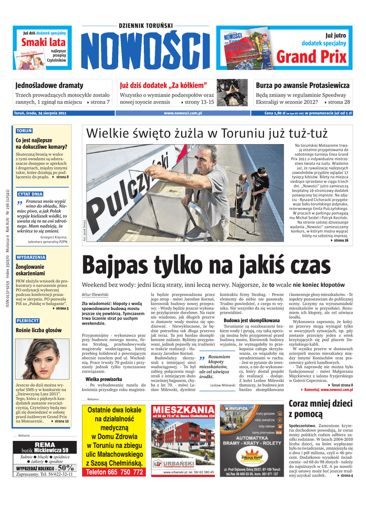 Już dziś dodatek specjalny Już jutro dodatek specjalny Smaki lata Grand Prix najlepsze przepisy Czytelników Jednośladowe dramaty Już dziś dodatek „Za kółkiem” Burza po awansie Protasiewicza Trzech prowadzących motocykle zostało rannych, 1 zginął na miejscu 4strona 7 Wszystko o wymianie podzespołów oraz nowej toyocie avensis 4strony 13-15 Będą zmiany w regulaminie Speedway Ekstraligi w sezonie 2012? 4strona 28 Toruń, środa, 24 sierpnia 2011 www.nowosci.com.pl Cena 1,80 zł (w tym 8% VAT) w prenumeracie już od 1 zł Wielkie święto żużla w Toruniu już tuż-tuż toruń Co jest najlepsze na dokuczliwe komary? Na toruńskiej Motoarenie trwają ostatnie przygotowania do sobotniego turnieju Enea Grand Prix 2011 o indywidualne mistrzostwo świata na żużlu. Wiadomo już, że rywalizację najlepszych zawodników przyjdzie oglądać 17 tysięcy kibiców. Bilety na miejsca siedzące sprzedano w ciągu trzech dni. „Nowości” jutro zamieszczą bezpłatny 16-stronicowy dodatek poświęcony tej imprezie. Na zdjęciu - Ryszard Cichoracki przygotowuje boks toruńskiego jedynaka, rezerwowego Emila Pulczyńskiego. W pracach w parkingu pomagają mu Michał Seidel i Patryk Kociński. Na stronie szóstej dzisiejszego wydania „Nowości” zamieszczamy konkurs, w którym można wygrać bilety na sobotnią imprezę. 4strona 26 „ cytat dnia Francuz może wypić wino do obiadu, Niemiec piwo, a jak Polak wypije kieliszek wódki, to uważa się to za coś zdrożnego. Mam nadzieję, że wkrótce to się zmieni. Grzegorz Kręcina, sekretarz generalny PZPN wydarzenia Żonglowanie oskarżeniami PKW złożyła wniosek do prokuratury o naruszenie przez PO ordynacji wyborczej podczas konferencji prasowej w sierpniu. PO pozwała PiS za „Polskę w bałaganie”. 4strona 5 plebiscyt Rośnie liczba głosów Fot. Jacek Smarz ISSN 0137-9259 Index 350370 Mutacja 0 Rok XLIV Nr 196 (12541) Skuteczną bronią w walce z tymi owadami są odstraszacze dostępne w aptekach i drogeriach, między innymi takie, które działają po podłączeniu do prądu.4 strona 8 Bajpas tylko na jakiś czas Weekend bez wody: jedni liczą straty, inni leczą nerwy. Najgorsze, że to wcale nie koniec kłopotów Artur Olewiński Zła wiadomość: kłopoty z wodą spowodowane budową mostu jeszcze się powtórzą. Tymczasem trwa liczenie strat po suchym weekendzie. Przypomnijmy - wykonawca prac przy budowie nowego mostu, firma Strabag, przebudowywała magistralę wodociągową, której przebieg kolidował z powstającym obecnie tunelem pod ul. Wschodnią. Prace trwały 70 godzin i przyniosły jednak tylko tymczasowe rozwiązanie. Wielka prowizorka Jeszcze do dziś można wysyłać SMS-y w konkursie na „Dziewczynę Lata 2011”. Tego, która z pięknych kandydatek zostanie zwyciężczynią, Czytelnicy będą mogli się dowiedzieć w sobotę przed żużlowym Grand Prix na Motoarenie. 4strona 10 Reklama - Po wybudowaniu tunelu do kwietnia przyszłego roku magistraReklama la będzie przeprowadzona przez kontraktu firmy Strabag. - Pewne jego strop - mówi Jarosław Kornaś, elementy do siebie nie pasowały. kierownik budowy nowej przepra- Trudno powiedzieć, z czego to wywy. - Wtedy będzie jeszcze wykona- nika. Nie wszystko da się wcześniej ne przyłączenie docelowe. Na razie przewidzieć. nie wiadomo, jak długich przerw Budowa jest skomplikowana w dostawie wody można się spoTorunianie są rozzłoszczeni bradziewać. - Niewykluczone, że będzie potrzebna tak długa przerwa kiem wody i pytają, czy taką operajak teraz. To jest bardzo skompli- cję można było przygotować przed kowane zadanie. Byliśmy przygoto- budową mostu. Kierownik budowy wani, jednak pojawiły się trudności wyjaśnia, że wymagałoby to przekopania całego skrzyżow trakcie realizacji - tłuwania, co wiązałoby się maczy Jarosław Kornaś. Rozumiem utrudnieniami w ruchu. Budowlańcy skorzykłopoty - Jest to pytanie do inwestali z istniejącej sieci stora, a nie do wykonawwodociągowej. - To był mieszkańców, cy, który dostał projekt zabieg połączenia magi- ale cel uświęca do realizacji - dodaje. strali z istniejącym dużo środki. Z kolei Lesław Milewski wcześniej bajpasem, chyLesław Milewski tłumaczy, że budowa jest ba z lat 70. - mówi Lebardzo skomplikowana sław Milewski, dyrektor „ i komentuje głosy mieszkańców. - Te aspekty pozostawiam do publicznej oceny. Liczymy na wyrozumiałość mieszkańców w przyszłości. Rozumiem ich kłopoty, ale cel uświęca środki. Wykonawca zapewnia, że kolejne przerwy mogą wystąpić tylko w awaryjnych sytuacjach, np. gdy zostanie przecięty jeden z setek krzyżujących się pod placem Daszyńskiego kabli. W wyniku przerw w dostawach ucierpieli mocno mieszkańcy między innymi Koniuchów oraz pracownicy galerii handlowych. - Tak naprawdę nie można było funkcjonować - mówi Małgorzata Mięckiewicz z salonu fryzjerskiego w Galerii Copernicus. 4Toruń strona 8 4Komentuj: www.nowosci.com.pl Coraz mniej dzieci z pomocą Społeczeństwo. Zamrożone kryteria dochodowe powodują, że coraz mniej polskich rodzin odbiera zasiłki rodzinne. W latach 2004-2010 liczba dzieci, na które wypłacane było to świadczenie, zmniejszyła się o dwa i pół miliona, czyli o 46 procent. Dodatkowo wysokość świadczenia - od 68 do 98 złotych - należy do najniższych w UE. A po nowelizacji ustawy może być jeszcze trud4strona 4 niej uzyskać zasiłek.