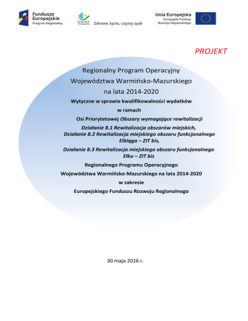 PROJEKT Regionalny Program Operacyjny Województwa Warmińsko-Mazurskiego na lata 2014-2020 Wytyczne w sprawie kwalifikowalności wydatków w ramach Osi Priorytetowej Obszary wymagające rewitalizacji Działanie 8.1 Rewitalizacja obszarów miejskich, Działanie 8.2 Rewitalizacja miejskiego obszaru funkcjonalnego Elbląga – ZIT bis, Działanie 8.3 Rewitalizacja miejskiego obszaru funkcjonalnego Ełku – ZIT bis Regionalnego Programu Operacyjnego Województwa Warmińsko-Mazurskiego na lata 2014-2020 w zakresie Europejskiego Funduszu Rozwoju Regionalnego 30 maja 2016 r. Wytyczne w sprawie kwalifikowalności wydatków ramach Osi Priorytetowej Obszary wymagające rewitalizacji Działanie 8.1. Rewitalizacja obszarów miejskich, Działanie 8.2 Rewitalizacja miejskiego obszaru funkcjonalnego Elbląga – ZIT bis, Działanie 8.3 Rewitalizacja miejskiego obszaru funkcjonalnego Ełku – ZIT bis w ramach Regionalnego Programu Operacyjnego Województwa Warmińsko-Mazurskiego na lata 2014-2020 w zakresie Europejskiego Funduszu Rozwoju Regionalnego 2 Spis treści 1. Wykaz skrótów .................................................................................................................................2 2. Wykaz aktów prawnych ....................................................................................................................3 3. Cel i zakres regulacji..........................................................................................................................4 3.1 Zakres stosowania wytycznych ........................................................................................................4 3.2 Termin poniesienia wydatków ........................................................................................................4 4. Zasady kwalifikowalności wydatków dla Działania 8.1 Rewitalizacja obszarów miejskich, Działania 8.2 Rewitalizacja miejskiego obszaru funkcjonalnego Elbląga – ZIT bis, Działania 8.3 Rewitalizacja miejskiego obszaru funkcjonalnego Ełku – ZIT bis. ..................................................................................................4 4.1 Zastosowanie uproszczonych metod rozliczania wydatków ..............................................................4 4.2 Wydatki kwalifikowalne związane z realizacją projektu....................................................................4 4.2.1 Nadzór.........................................................................................................................................4 4.2.2 Inwestor zastępczy oraz Inżynier kontraktu ..................................................................................4 4.2.3 Roboty budowlane.......................................................................................................................4 4.2.4 Zakup wyposażenia ......................................................................................................................5 4.3 Wydatki niekwalifikowane dla wszystkich typów projektów ............................................................5 5. Szczegółowe zasady kwalifikowalności wydatków dla Działania 8.1 Rewitalizacja obszarów miejskich, Działania 8.2 Rewitalizacja miejskiego obszaru funkcjonalnego Elbląga – ZIT bis, Działania 8.3 Rewitalizacja miejskiego obszaru funkcjonalnego Ełku – ZIT bis. ............................................................5 5.1 Wydatki kwalifikowalne związane z realizacją projektu....................................................................5 5.1.1. Roboty budowlane......................................................................................................................5 5.2 Wydatki niekwalifikowalne w ramach Działania 8.1 Rewitalizacja obszarów miejskich, Działania 8.2 Rewitalizacja miejskiego obszaru funkcjonalnego Elbląga – ZIT bis, Działania 8.3 Rewitalizacja miejskiego obszaru funkcjonalnego Ełku – ZIT bis. ..................................................................................................6 1. Wykaz skrótów 1) MR – Ministerstwo Rozwoju; 2) RPO WiM 2014-2020 – Regionalny Program Operacyjny Województwa WarmińskoMazurskiego na lata 2014-2020; 3) IZ RPO WiM – Instytucja Zarządzająca Regionalnym Programem Operacyjnym Województwa Warmińsko-Mazurskiego na lata 2014-2020; 4) Wytyczne horyzontalne – Wytyczne w zakresie kwalifikowalności wydatków w ramach Europejskiego Funduszu Rozwoju Regionalnego, Europejskiego Funduszu Społecznego oraz Funduszu Spójności na lata 2014-2020; 5) Wytyczne programowe – Wytyczne w sprawie kwalifikowalności wydatków w ramach Osi Priorytetowej Obszary wymagające rewitalizacji Działanie 8.1. Rewitalizacja obszarów miejskich, Działanie 8.2 Rewitalizacja miejskiego obszaru funkcjonalnego Elbląga – ZIT bis, Działanie 8.3 Rewitalizacja miejskiego obszaru funkcjonalnego Ełku – ZIT bis w ramach Regionalnego Programu Operacyjnego Województwa Warmińsko-Mazurskiego na lata 20142020 w zakresie Europejskiego Funduszu Rozwoju Regionalnego; 6) SZOOP Obszary wymagające rewitalizacji - Szczegółowy Opis Osi Priorytetowej Obszary wymagające rewitalizacji; 7) EFRR – Europejski Fundusz Rozwoju Regionalnego. Wytyczne w sprawie kwalifikowalności wydatków ramach Osi Priorytetowej Obszary wymagające rewitalizacji Działanie 8.1. Rewitalizacja obszarów miejskich, Działanie 8.2 Rewitalizacja miejskiego obszaru funkcjonalnego Elbląga – ZIT bis, Działanie 8.3 Rewitalizacja miejskiego obszaru funkcjonalnego Ełku – ZIT bis w ramach Regionalnego Programu Operacyjnego Województwa Warmińsko-Mazurskiego na lata 2014-2020 w zakresie Europejskiego Funduszu Rozwoju Regionalnego 3 2. Wykaz aktów prawnych Wytyczne zostały wydane na podstawie art. 7 ust. 1 ustawy z dnia 11 lipca 2014 roku o zasadach realizacji programów w zakresie polityki spójności finansowanych w perspektywie 2014-2020 (Dz. U. z 2016 r., poz. 217), zwanej dalej „ustawą wdroże