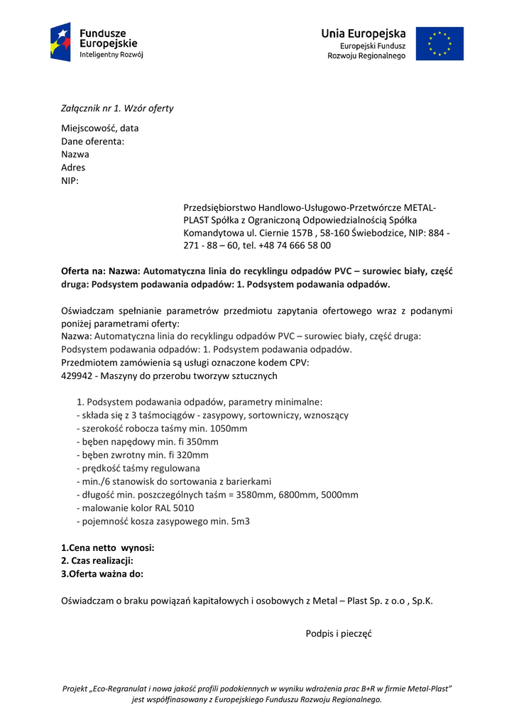 Załącznik nr 1. Wzór oferty Miejscowość, data Dane oferenta: Nazwa Adres NIP: Przedsiębiorstwo Handlowo-Usługowo-Przetwórcze METALPLAST Spółka z Ograniczoną Odpowiedzialnością Spółka Komandytowa ul. Ciernie 157B , 58-160 Świebodzice, NIP: 884 271 - 88 – 60, tel. +48 74 666 58 00 Oferta na: Nazwa: Automatyczna linia do recyklingu odpadów PVC – surowiec biały, część druga: Podsystem podawania odpadów: 1. Podsystem podawania odpadów. Oświadczam spełnianie parametrów przedmiotu zapytania ofertowego wraz z podanymi poniżej parametrami oferty: Nazwa: Automatyczna linia do recyklingu odpadów PVC – surowiec biały, część druga: Podsystem podawania odpadów: 1. Podsystem podawania odpadów. Przedmiotem zamówienia są usługi oznaczone kodem CPV: 429942 - Maszyny do przerobu tworzyw sztucznych 1. Podsystem podawania odpadów, parametry minimalne: - składa się z 3 taśmociągów - zasypowy, sortowniczy, wznoszący - szerokość robocza taśmy min. 1050mm - bęben napędowy min. fi 350mm - bęben zwrotny min. fi 320mm - prędkość taśmy regulowana - min./6 stanowisk do sortowania z barierkami - długość min. poszczególnych taśm = 3580mm, 6800mm, 5000mm - malowanie kolor RAL 5010 - pojemność kosza zasypowego min. 5m3 1.Cena netto wynosi: 2. Czas realizacji: 3.Oferta ważna do: Oświadczam o braku powiązań kapitałowych i osobowych z Metal – Plast Sp. z o.o , Sp.K. Podpis i pieczęć Projekt „Eco-Regranulat i nowa jakość profili podokiennych w wyniku wdrożenia prac B+R w firmie Metal-Plast” jest współfinasowany z Europejskiego Funduszu Rozwoju Regionalnego.