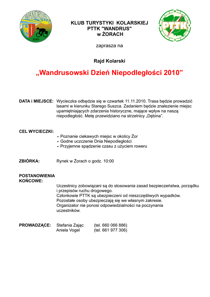 KLUB TURYSTYKI KOLARSKIEJ PTTK "WANDRUS" w ŻORACH zaprasza na Rajd Kolarski „Wandrusowski Dzień Niepodległości 2010” DATA i MIEJSCE: Wycieczka odbędzie się w czwartek 11.11.2010. Trasa będzie prowadzić lasami w kierunku Starego Suszca. Zadaniem będzie znalezienie miejsc upamiętniających zdarzenia historyczne, mające wpływ na naszą niepodległość. Metę przewidziano na strzelnicy „Dębina”. CEL WYCIECZKI: • Poznanie ciekawych miejsc w okolicy Żor • Godne uczczenie Dnia Niepodległości • Przyjemne spądzenie czasu z użyciem roweru ZBIÓRKA: Rynek w Żorach o godz. 10:00 POSTANOWIENIA KOŃCOWE: Uczestnicy zobowiązani są do stosowania zasad bezpieczeństwa, porządku i przepisów ruchu drogowego. Członkowie PTTK są ubezpieczeni od nieszczęśliwych wypadków. Pozostałe osoby ubezpieczają się we własnym zakresie. Organizator nie ponosi odpowiedzialności na poczynania uczestników. PROWADZĄCE: Stefania Zając Aniela Vogel (tel. 660 066 886) (tel. 661 977 306)