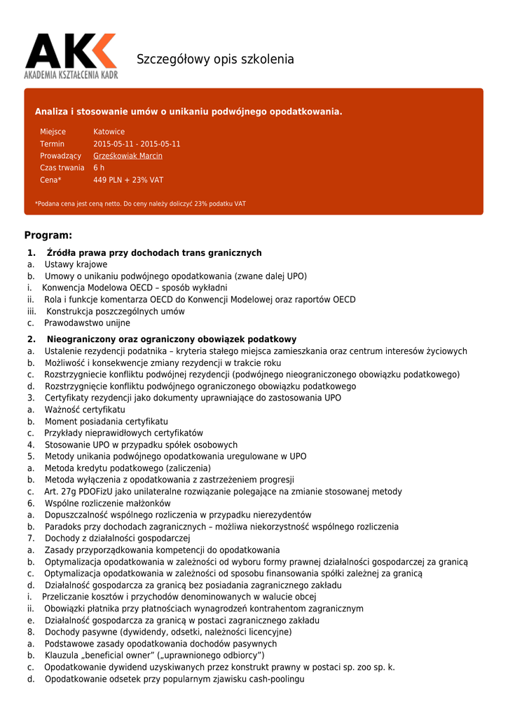Szczegółowy opis szkolenia Analiza i stosowanie umów o unikaniu podwójnego opodatkowania. Miejsce Katowice Termin 2015-05-11 - 2015-05-11 Prowadzący Grześkowiak Marcin Czas trwania 6h Cena* 449 PLN + 23% VAT *Podana cena jest ceną netto. Do ceny należy doliczyć 23% podatku VAT Program: 1. a. b. i. ii. iii. c. Źródła prawa przy dochodach trans granicznych Ustawy krajowe Umowy o unikaniu podwójnego opodatkowania (zwane dalej UPO) Konwencja Modelowa OECD – sposób wykładni Rola i funkcje komentarza OECD do Konwencji Modelowej oraz raportów OECD Konstrukcja poszczególnych umów Prawodawstwo unijne 2. a. b. c. d. 3. a. b. c. 4. 5. a. b. c. 6. a. b. 7. a. b. c. d. i. ii. e. 8. a. b. c. d. Nieograniczony oraz ograniczony obowiązek podatkowy Ustalenie rezydencji podatnika – kryteria stałego miejsca zamieszkania oraz centrum interesów życiowych Możliwość i konsekwencje zmiany rezydencji w trakcie roku Rozstrzygniecie konfliktu podwójnej rezydencji (podwójnego nieograniczonego obowiązku podatkowego) Rozstrzygnięcie konfliktu podwójnego ograniczonego obowiązku podatkowego Certyfikaty rezydencji jako dokumenty uprawniające do zastosowania UPO Ważność certyfikatu Moment posiadania certyfikatu Przykłady nieprawidłowych certyfikatów Stosowanie UPO w przypadku spółek osobowych Metody unikania podwójnego opodatkowania uregulowane w UPO Metoda kredytu podatkowego (zaliczenia) Metoda wyłączenia z opodatkowania z zastrzeżeniem progresji Art. 27g PDOFizU jako unilateralne rozwiązanie polegające na zmianie stosowanej metody Wspólne rozliczenie małżonków Dopuszczalność wspólnego rozliczenia w przypadku nierezydentów Paradoks przy dochodach zagranicznych – możliwa niekorzystność wspólnego rozliczenia Dochody z działalności gospodarczej Zasady przyporządkowania kompetencji do opodatkowania Optymalizacja opodatkowania w zależności od wyboru formy prawnej działalności gospodarczej za granicą Optymalizacja opodatkowania w zależności od sposobu finansowania spółki zależnej za granicą Działalność gospodarcza za granicą bez posiadania zagranicznego zakładu Przeliczanie kosztów i przychodów denominowanych w walucie obcej Obowiązki płatnika przy płatnościach wynagrodzeń kontrahentom zagranicznym Działalność gospodarcza za granicą w postaci zagranicznego zakładu Dochody pasywne (dywidendy, odsetki, należności licencyjne) Podstawowe zasady opodatkowania dochodów pasywnych Klauzula „beneficial owner” („uprawnionego odbiorcy”) Opodatkowanie dywidend uzyskiwanych przez konstrukt prawny w postaci sp. zoo sp. k. Opodatkowanie odsetek przy popularnym zjawisku cash-poolingu e. Opodatkowanie użytkowania oprogramowania w świetle zasad opodatkowania należności licencyjnych f. Nadpłata podatku źródłowego 9. Dochody ze zbycia majątku a. Klauzula nieruchomościowa – geneza powstania i różne wersje z odmiennymi skutkami b. Zyski ze zbycia udziałów w zagranicznych spółkach. Dla kogo: Szkolenie jest przeznaczone dla osób zajmujących się rozliczaniem podatków międzynarodowych. Cel: Celem szkolenia jest przedstawienie problematyki zastosowania umów o podwójnym opodatkowaniu zakładów, a w szczególności praktycznej strony tej tematyki. Korzyści: Szkolenie umożliwia pozyskanie specjalistycznej wiedzy z zakresu podatków międzynarodowych, a w szczególności stosowania umów o unikaniu podwójnego opodatkowaniu. Szkolenie prowadzi doświadczony doradca podatkowy specjalizujący się w tych zagadnieniach. Wykładowca: Grześkowiak Marcin polski doradca podatkowy (nr wpisu 11419), absolwent ekonomii Uniwersytetu Europejskiego Viadrina we Frankfurcie nad Odrą, gdzie następnie pracował jako asystent na katedrze Rachunkowości i Opodatkowania Przedsiębiorstw. Praktyczne doświadczenie zawodowe w doradztwie podatkowym zdobywał, pracując dla niemieckiej spółdzielni doradców podatkowych DATEV z Norymbergi oraz w międzynarodowej spółce doradztwa podatkowego TPA Horwath Sztuba Kaczmarek w Warszawie. Obecnie prowadzi własną kancelarię, specjalizując się w problematyce międzynarodowego prawa podatkowego ze szczególnym uwzględnieniem stosunków polskoniemieckich. Członek International Fiscal Association z siedzibą w Rotterdamie. Jest współautorem polskich i niemieckich książek dotyczących podatków i rachunkowości (m.in. „Polsko-niemiecki leksykon terminologii fachowej doradztwa podatkowego” wydanie 3, DATEV eG, Norymberga czy „Das polnische Bilanz – und Steuerrecht”, wydanie 2, Erich-Schmidt-Verlag, Bielefeld) oraz artykułów o tematyce związanej z prawem podatkowym oraz zarządzaniem kancelarią doradcy podatkowego. Jako wykładowca prowadzi też szkolenia przede wszystkim z zakresu międzynarodowych zagadnień podatkowych, których uczestnikami są zarówno doradcy podatkowi, jak i przedstawiciele działów finansowych i księgowych w przedsiębiorstwach, współpracując przy tym m.in. z Polsko-Niemiecką Izbą Przemysłowo-Handlową w Warszawie, firmą szkoleniową Management Circle we Frankfurcie n. Menem, Szkołą Główną Handlową w Warszawie oraz Krajową Izbą Doradców Podatkowych. Szczegóły organizacyjne: Koszt uczestnictwa: • -jednej osoby 449 plus 23% VAT, razem 552.27 • -kolejnych osób - prosimy o kontakt Uwaga: Promocje i rabaty nie łączą się. Uwaga: Możecie Państwo zwracać się z wnioskiem o dofinansowanie szkolenia z Krajowego Funduszu Szkoleniowego, Cena obejmuje: • -uczestnictwo w szkoleniu • -serwis kawowy • -obiad • -materiały szkoleniowe • -certyfikat ukończenia Płatności: • Prosimy realizować na konto 40 1320 1537 1869 7872 2000 0001 po otrzymaniu zaproszenia. Miejsce szkolenia: • Szkolenie jest realizowane w centrum konferencyjnym zlokalizowanym w centrum miasta, • Nazwa i adres zostanie Państwu przekazana w zaproszeniu. Zaproszenie zawiera: • temat szkolenia • miejsce • godziny realizacji Informacje: • Tel. 601-95