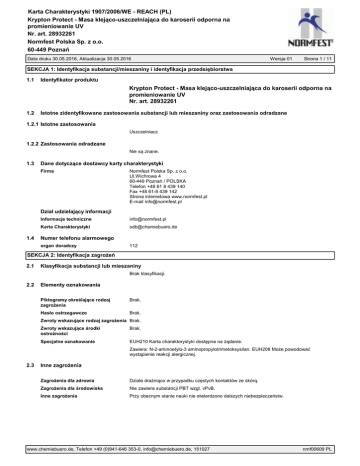 Karta Charakterystyki 1907/2006/WE - REACH (PL) Krypton Protect Masa klejącouszczelniająca do karoserii odporna na promieniowanie UV Nr. art. 28932261 Normfest Polska Sp. z o.o. 60449 Poznań Data druku 30.05.2016, Aktualizacja 30.05.2016 Wersja 01 Strona 1 / 11 SEKCJA 1: Identyfikacja substancji/mieszaniny i identyfikacja przedsiębiorstwa 1.1 Identyfikator produktu Krypton Protect Masa klejącouszczelniająca do karoserii odporna na promieniowanie UV Nr. art. 28932261 1.2 Istotne zidentyfikowane zastosowania substancji lub mieszaniny oraz zastosowania odradzane 1.2.1 Istotne zastosowania Uszczelniacz 1.2.2 Zastosowania odradzane Nie są znane. 1.3 Dane dotyczące dostawcy karty charakterystyki Firma Normfest Polska Sp. z o.o. Ul.Wichrowa 4 60449 Poznań / POLSKA Telefon +48 61 8 439 140 Fax +48 61-8 439 142 Strona internetowa www.normfest.pl E-mail [email protected] Dział udzielający informacji 1.4 Informacje techniczne [email protected] Karta Charakterystyki [email protected] Numer telefonu alarmowego organ doradczy 112 SEKCJA 2: Identyfikacja zagrożeń 2.1 Klasyfikacja substancji lub mieszaniny Brak klasyfikacji. 2.2 Elementy oznakowania Piktogramy określające rodzaj zagrożenia Brak. Hasło ostrzegawcze Brak. Zwroty wskazujące rodzaj zagrożenia Brak. Zwroty wskazujące środki ostrożności Brak. Specjalne oznakowanie EUH210 Karta charakterystyki dostępna na żądanie. Zawiera: N2aminoetylo3 aminopropylotrimetoksysilan. EUH208 Może powodować wystąpienie reakcji alergicznej. 2.3 Inne zagrożenia Zagrożenia dla zdrowia Działa drażniąco w przypadku częstych kontaktów ze skórą. Zagrożenia dla środowiska Nie zawiera substancji PBT wzgl. vPvB. Inne zagrożenia Przy obecnym stanie nauki nie stwierdzono dalszych niebezpieczeństw. www.chemiebuero.de, Telefon +49 (0)941-646 353-0, [email protected], 151027 nmf00609 PL Karta Charakterystyki 1907/2006/WE - REACH (PL) Krypton Protect Masa klejącouszczelniająca do karoserii odporna na promieniowanie UV Nr. art. 28932261 Normfest Polska Sp. z o.o. 60449 Poznań Data druku 30.05.2016, Aktualizacja 30.05.2016 Wersja 01 Strona 2 / 11 SEKCJA 3: Skład / Informacja o składnikach Produkt typu: Produkt ten jest mieszaniną. Objętość [%] Skład <1 N-2-aminoetylo-3 aminopropylotrimetoksysilan CAS: 1760-24-3, EINECS/ELINCS: 217-164-6, Reg-No.: 01-2119970215-39-XXXX GHS/CLP: Poważne uszkodzenie oczu/działanie drażniące na oczy, kategoria 1: H318 Działanie uczulające na drogi skórę, kategoria 1: H317 Komentarz do części składowych Lista SVHC (Candidate List of Substances of Very High Concern for authorisation): nie zawiera lub zawiera poniżej 0,1% wyszczególnionych substancji. Pełne brzmienie zwrotów H: zob. SEKCJA 16. SEKCJA 4: Pierwsza pomoc 4.1 4.2 Opis środków pierwszej pomocy Informacje ogólne Usunąć zanieczyszczoną lub nasiąkniętą odzież. Po przedostaniu się do dróg oddechowych Zapewnić dopływ świeżego powietrza. W razie wystąpienia jakichkolwiek objawów należy zgłosić się do lekarza. Kontakt ze skórą W przypadku kontaktu ze skórą, przemyć wodą i mydłem. W przypadku, gdy podrażnienie skóry nie ustępuje należy skonsultować się z lekarzem. Kontakt z oczami W przypadku kontaktu z oczami, przepłukać obficie wodą i zgłosić się do lekarza. Po połknięciu Natychmiast szukać pomocy lekarskiej. Nie wywoływać wymiotów. Najważniejsze ostre i opóźnione objawy oraz skutki narażenia Reakcje alergiczne 4.3 Wskazania dotyczące wszelkiej natychmiastowej pomocy lekarskiej i szczególnego postępowania z poszkodowanym Leczenie objawowe. SEKCJA 5: Postępowanie w przypadku pożaru 5.1 5.2 Środki gaśnicze Odpowiednie środki gaśnicze Zdolność jednorodnego mieszania się ze wszystkimi stosowanymi środkami gaśniczymi, środki gaśnicze właściwe dla danego otoczenia. Niedozwolone środki gaśnicze Zwarty strumień wody. Szczególne zagrożenia związane z substancją lub mieszaniną Ryzyko powstania toksycznych produktów rozkładu termicznego. tlenek węgla (CO) 5.3 Informacje dla straży pożarnej Nosić półmaski chroniące układ oddechowy. Pozostałości po pożarze i zanieczyszczona woda używana do gaszenia ognia, muszą być usunięte zgodnie z przepisami. SEKCJA 6: Postępowanie w przypadku niezamierzonego uwolnienia do środowiska 6.1 Indywidualne środki ostrożności, wyposażenie ochronne i procedury w sytuacjach awaryjnych Zapewnić właściwą wentylację. Używać indywidualnego wyposażenia ochronnego (rękawice ochronne, okulary ochronne, odzież ochronna). www.chemiebuero.de, Telefon +49 (0)941-646 353-0, [email protected], 151027 nmf00609 PL Karta Charakterystyki 1907/2006/WE - REACH (PL) Krypton Protect Masa klejącouszczelniająca do karoserii odporna na promieniowanie UV Nr. art. 28932261 Normfest Polska Sp. z o.o. 60449 Poznań Data druku 30.05.2016, Aktualizacja 30.05.2016 6.2 Wersja 01 Strona 3 / 11 Środki ochrony środowiska Nie wypuszczać do ścieków/wód powierzchniowych/gruntowych. 6.3 Metody i materiały zapobiegające rozprzestrzenianiu się skażenia i służące do usuwania skażenia Zbierać mechanicznie. Zebrany materiał zutylizować zgodnie z przepisami. 6.4 Odniesienia do innych sekcji Patrz SEKCJA 8+13 SEKCJA 7: Postępowanie z substancją/preparatem i jej/jego magazynowanie 7.1 Środki ostrożności dotyczące bezpiecznego postępowania Używać tylko w dobrze wentylowanych pomieszczeniach. Myć ręce przed przerwami w pracy i po zakończeniu pracy. Stosować krem ochronny dla skóry. Na stanowisku pracy jest zabronione jedzenie posiłków, picie, palenie papierosów oraz przyjmowanie lekarstw. 7.2 Warunki bezpiecznego magazynowania, łącznie z informacjami dotyczącymi wszelkich wzajemnych niezgodności Przechowywać tylko w oryginalnym opakowaniu. Nie przechowywać razem z żywnością i paszą dla zwierząt. Chronić przed ogrzaniem/przegrzaniem. Przechowywać w suchym miejscu. Przechowywać z dala od wody i wilgotnego otocze
