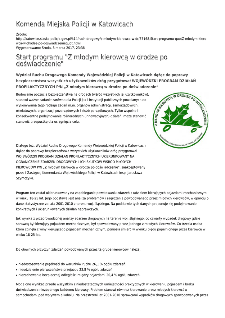 Komenda Miejska Policji w Katowicach Źródło: http://katowice.slaska.policja.gov.pl/k14/ruch-drogowy/z-mlodym-kierowca-w-dr/37168,Start-programu-quotZ-mlodym-kiero wca-w-drodze-po-doswiadczeniequot.html Wygenerowano: Środa, 8 marca 2017, 23:38 Start programu "Z młodym kierowcą w drodze po doświadczenie" Wydział Ruchu Drogowego Komendy Wojewódzkiej Policji w Katowicach dążąc do poprawy bezpieczeństwa wszystkich użytkowników dróg przygotował WOJEWÓDZKI PROGRAM DZIAŁAŃ PROFILAKTYCZNYCH P/N „Z młodym kierowcą w drodze po doświadczenie” Budowanie poczucia bezpieczeństwa na drogach (wśród wszystkich jej użytkowników), stanowi ważne zadanie zarówno dla Policji jak i instytucji publicznych powołanych do wykonywania tego rodzaju zadań m.in. organów administracji, samorządowych, oświatowych, organizacji pozarządowych i służb porządkowych. Tylko wspólne i konsekwentne podejmowanie różnorodnych (innowacyjnych) działań, może stanowić stanowić przepustkę dla osiągnięcia celu. Dlatego też, Wydział Ruchu Drogowego Komendy Wojewódzkiej Policji w Katowicach dążąc do poprawy bezpieczeństwa wszystkich użytkowników dróg przygotował WOJEWÓDZKI PROGRAM DZIAŁAŃ PROFILAKTYCZNYCH UKIERUNKOWANY NA OGRANICZENIE ZDARZEŃ DROGOWYCH I ICH SKUTKÓW WŚRÓD MŁODYCH KIEROWCÓW P/N „Z młodym kierowcą w drodze po doświadczenie”, zaakceptowany przez I Zastępcę Komendanta Wojewódzkiego Policji w Katowicach insp. Jarosława Szymczyka. Program ten został ukierunkowany na zapobieganie powstawaniu zdarzeń z udziałem kierujących pojazdami mechanicznymi w wieku 18-25 lat. Jego podstawą jest analiza problemów i zagrożenia powodowanego przez młodych kierowców, w oparciu o dane statystyczne za lata 2001-2010 z terenu woj. śląskiego. Na podstawie tych danych proponuje się podejmowanie konkretnych i ukierunkowanych działań naprawczych. Jak wynika z przeprowadzonej analizy zdarzeń drogowych na terenie woj. śląskiego, co czwarty wypadek drogowy gdzie sprawcą był kierujący pojazdem mechanicznym, był spowodowany przez jednego z młodych kierowców. Co trzecia osoba która zginęła z winy kierującego pojazdem mechanicznym, poniosła śmierć w wyniku błędu popełnionego przez kierowcę w wieku 18-25 lat. Do głównych przyczyn zdarzeń powodowanych przez tą grupę kierowców należą: ● niedostosowanie prędkości do warunków ruchu 26,1 % ogółu zdarzeń. ● nieudzielenie pierwszeństwa przejazdu 23,8 % ogółu zdarzeń. ● niezachowanie bezpiecznej odległości między pojazdami 20,4 % ogółu zdarzeń. Mogą one wynikać przede wszystkim z niedostatecznych umiejętności praktycznych w kierowaniu pojazdem i braku doświadczenia niezbędnego każdemu kierowcy. Problem stanowi również kierowanie przez młodych kierowców samochodami pod wpływem alkoholu. Na przestrzeni lat 2001-2010 sprawcami wypadków drogowych spowodowanych przez kierujących pojazdami mechanicznymi okazało się 9,7 % kierujących pod wpływem alkoholu sprawców z grupy wiekowej 18-25 lat. Podstawowe płaszczyzny działania na które zostanie zwrócona szczególna uwaga to: ● profilaktyka, ● edukacja ● działania represyjne. Główne cele prowadzonej kampanii to: ● Poprawa bezpieczeństwa na drogach województwa śląskiego poprzez ograniczenie liczby zdarzeń drogowych wśród kierujących pojazdami w wieku 18-25 lat. ● Diagnozowanie i analizowanie stanu bezpieczeństwa w ruchu drogowym ze zwróceniem uwagi na zagrożenia występujące ze strony kierowców w wieku 18-25 lat. Zadania realizowane będą na przestrzeni kolejnych lat podczas pogadanek, prelekcji, szkoleń czy ukierunkowanych kontroli drogowych, gdyż jedynie podejmowanie długoterminowych działań może przynieść pozytywne efekty. Wierzymy, że bieżące analizowanie i diagnoza zdarzeń z udziałem młodych kierowców, pozwoli podjąć kroki zmierzające w kierunku poprawy stanu bezpieczeństwa na śląskich drogach. Wszystkich, dla których bezpieczeństwo na drodze jest wartością nadrzędną zapraszamy do współpracy w ramach kampanii ! Ocena: 0/5 (0) Tweetnij