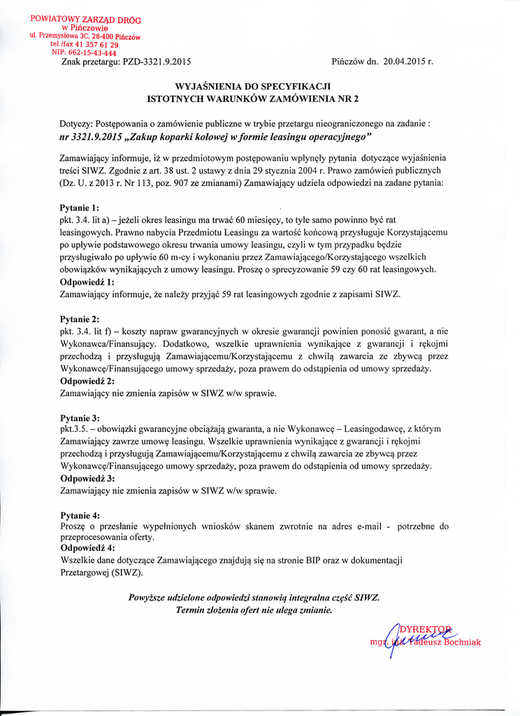 POWIATOWY Z A R Z A D D R O G w Piriczowie ul. Przemystowa 3C, 28-400 Piiiczow tel./fax41 357 61 29 NIP: 662-15-43-444 Znakprzetargu: PZD-3321.9.2015 Pihczowdn. 20.04.2015 r. WYJASNIENIA DO S P E C Y F I K A C J I I S T O T N Y C H W A R U N K O W Z A M O W I E N I A NR 2 Dotyczy: Post^powania o zamowienie publiczne w trybie przetargu nieograniczonego na zadanie : nr 3321.9.2015 „Zakup koparki kolowej wformie leasingu operacyjnego" Zamawiajqcy informuje, iz w przedmiotowym post^powaniu wplyn^ly pytania dotycz^ce wyjasnienia tresci SIWZ. Zgodnie z art. 38 ust. 2 ustawy z dnia 29 stycznia 2004 r. Prawo zamowien publicznych (Dz. U . z 2013 r. Nr 113, poz. 907 ze zmianami) Zamawiajqcy udziela odpowiedzi na zadane pytania: Pytanie 1: ^ pkt. 3.4. lit a) - jezeli okres leasingu ma trwac 60 miesi^cy, to tyle samo powinno bye rat leasingowych. Prawno nabycia Przedmiotu Leasingu za wartosc koncowq przysluguje Korzystaj^cemu po uplywie podstawowego okresu trwania umowy leasingu, czyli w tym przypadku b^dzie przyshigiwalo po uplywie 60 m-cy i wykonaniu przez Zamawiajqcego/Korzystaj^cego wszelkich obowiazkow wynikajacych z umowy leasingu. Prosz? o sprecyzowanie 59 czy 60 rat leasingowych. Odpowiedz 1: Zamawiajqcy informuje, ze nalezy przyj^c 59 rat leasingowych zgodnie z zapisami SIWZ. Pytanie 2: pkt. 3.4. lit f) - koszty napraw gwarancyjnych w okresie gwarancji powinien ponosic gwarant, a nie Wykonawca/Finansuj^cy. Dodatkowo, wszelkie uprawnienia wynikajqce z gwarancji i r^kojmi przechodz^ i przysluguje Zamawiaj^cemu/Korzystajqcemu z chwil^ zawarcia ze zbywc^ przez Wykonawc^/Finansuj^cego umowy sprzedazy, poza prawem do odst^pienia od umowy sprzedazy. Odpowiedz 2: Zamawiaj^cy nie zmienia zapisow w SIWZ w/w sprawie. Pytanie 3: pkt.3.5. - obowi^zki gwarancyjne obci^zaj^ gwaranta, a nie Wykonawc? - Leasingodawc?, z ktorym Zamawiaj^cy zawrze umow? leasingu. Wszelkie uprawnienia wynikajqce z gwarancji i r?kojmi przechodzq i przysluguje Zamawiajecemu/Korzystajecemu z chwil^ zawarcia ze zbywc^ przez Wykonawc^/Finansujecego umowy sprzedazy, poza prawem do odstqpienia od umowy sprzedazy. Odpowiedz 3: Zamawiajecy nie zmienia zapisow w SIWZ w/w sprawie. Pytanie 4: Prosz^ 0 przeslanie wypelnionych wnioskow skanem zwrotnie na adres e-mail - potrzebne do przeprocesowania oferty. Odpowiedz 4: Powyzsze udzielone odpowiedzi stanowiq integralna SIWZ. Wszelkie dane dotycz^ce Zamawiaj^cego znajduje si? na stronie BIP oraz cz?sc w dokumentacji Termin zloienia ofert nie ulega zmianie. Przetargowej (SIWZ).