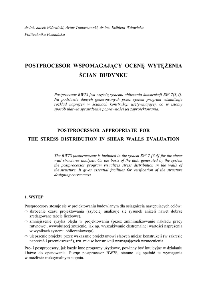 dr inŜ. Jacek Wdowicki, Artur Tomaszewski, dr inŜ. ElŜbieta Wdowicka Politechnika Poznańska POSTPROCESOR WSPOMAGAJĄCY OCENĘ WYTĘśENIA ŚCIAN BUDYNKU Postprocesor BW7S jest częścią systemu obliczania konstrukcji BW-7[3,4]. Na podstawie danych generowanych przez system program wizualizuje rozkład napręŜeń w ścianach konstrukcji usztywniającej, co w istotny sposób ułatwia sprawdzenie poprawności jej zaprojektowania. POSTPROCESSOR APPROPRIATE FOR THE STRESS DISTRIBUTION IN SHEAR WALLS EVALUATION The BW7S postprocessor is included in the system BW-7 [3,4] for the shear wall structures analysis. On the basis of the data generated by the system the postprocessor program visualizes stress distribution in the walls of the structure. It gives essential facilities for verification of the structure designing correctness. 1. WSTĘP Postprocesory stosuje się w projektowaniu budowlanym dla osiągnięcia następujących celów: • skrócenie czasu projektowania (szybciej analizuje się rysunek aniŜeli nawet dobrze zredagowane tabele liczbowe), • zmniejszenie ryzyka błędu w projektowaniu (przez zminimalizowanie nakładu pracy rutynowej, wywołującej znuŜenie, jak np. wyszukiwanie ekstremalnej wartości napręŜenia w wynikach systemu obliczeniowego), • ulepszenie projektu przez wskazanie projektantowi słabych miejsc konstrukcji (w zakresie napręŜeń i przemieszczeń), tzn. miejsc konstrukcji wymagających wzmocnienia. Pre- i postprocesory, jak kaŜde inne programy uŜytkowe, powinny być intuicyjne w działaniu i łatwe do opanowania. Pisząc postprocesor BW7S, starano się spełnić te wymagania w moŜliwie maksymalnym stopniu. Program BW7S jest postprocesorem graficznym, napisanym w języku Pascal [1,2,5] . Dane wejściowe programu stanowi plik z rozszerzeniem *.d-r (generowany przez system). Plik ten zawiera m.in.: liczbę punktów tworzących ściany konstrukcji i ich współrzędne (x, y), liczbę ścian i elementów, indeks przynaleŜności ściany do danego elementu, jednostkę siły i długości, minimalną i maksymalną wartość napręŜenia danego rodzaju w całym układzie usztywniającym oraz dane opisujące napręŜenia. Budując program przyjęto, Ŝe połączone ściany tworzą element, ściana jest natomiast podzielona na fragmenty o stałej wartości napręŜenia. 2. EKRAN POSTPROCESORA Ekran postprocesora podzielony jest na kilka okien. Pierwsze z nich, znajdujące się w górnej części ekranu, zawiera opis konstrukcji, na który składają się cztery linie (ciągi alfanumeryczne), przy czym ostatnia linia opisu odseparowana jest od pozostałych. PoniŜej znajduje się okno, zawierające dane o minimalnej i maksymalnej wartości napręŜenia danego rodzaju w całej konstrukcji usztywniającej, obejmujące wartość napręŜenia oraz numery elementu, ściany i punktu, w którym to napręŜenie występuje. Są to dwie linie tekstu, kaŜda dla jednego z ekstremalnych napręŜeń. W prawej części ekranu znajduje się podłuŜne okno zawierające: numer schematu / wariantu (schematu obciąŜeń lub wariantu ekstremum), opis rodzaju napręŜeń (mogą to być ciągi: „sigma_z”, „tau”, „sigma_1”, „sigma_2”) i ich jednostki, numer rzędnej oraz skalę graficzną, prezentującą dziesięć przedziałów i zakresy wartości napręŜeń dla kaŜdego z przedziałów. Główną rolę odgrywają dwa największe okna, zatytułowane „Plik” i „Element”. Pierwsze z nich (z lewej strony ekranu), w nagłówku którego wypisana jest nazwa danych wejściowych, pokazuje rzut całej konstrukcji usztywniającej, przy czym element „aktywny” wyróŜniony jest innym kolorem. Element ten pokazany jest w powiększeniu w oknie „Element” a „aktywna” ściana tego elementu podświetlona jest innym kolorem, podobnie jak w poprzednim przypadku. Nagłówek opisywanego okna zawiera numer powiększonego w nim elementu. Ostatnie okno postprocesora zawiera rzut „aktywnej” ściany oraz dane ją opisujące, na które składają się: numery punktów krańcowych ściany i ich współrzędne, wartości napręŜeń w tych punktach, a takŜe numer ściany w budynku i w elemencie. W prawym dolnym rogu ekranu znajduje się menu, zapewniające wygodną interakcję z uŜytkownikiem. Ekran dostosowuje się do wczytywanych danych. JeŜeli plik wejściowy nie zawiera danych opisujących rozkład napręŜenia w ścianach układu usztywniającego, to na ekranie widoczne są tylko okna: „Plik”, „Element”, „Ściana” , okno z opisem obiektu oraz menu (Rys. 1). W tym przypadku rysowane są oczywiście tylko kontury ścian tworzących konstrukcję. RóŜni się takŜe menu: nie ma w tym trybie moŜliwości zmiany schematu / wariantu, rzędnej i typu napręŜenia. JeŜeli natomiast plik wejściowy zawiera kompletne dane, to na ekranie widoczne są wszystkie opisane wcześniej okna. Ściany podzielone są wówczas na kolorowe fragmenty, obrazujące rozkład napręŜenia (Rys. 2). Uwaga: W dalszej części artykułu przyjęto, Ŝe pod pojęciem „aktywny” element rozumie się element który narysowany jest w oknie „Element”, a określenie „aktywna” ściana oznacza ścianę narysowaną w oknie „Ściana”. Rys. 1 Ekran postprocesora bez napręŜeń Rys. 2. Ekran postprocesora z napręŜeniami 3. URUCHOMIENIE I OBSŁUGA POSTPROCESORA Postprocesor uruchamia się przez wykonanie komendy: BW7S <dane wejściowe> gdzie parametr <dane wejściowe> polecenia: jest numerem danych wejściowych. Np. wykonanie BW7S 13 spowoduje uruchomienie postprocesora i automatyczne wczytanie pliku z danymi o nazwie „bw7-13.d-r”. W przypadku pominięcia parametru wywołania, program „poprosi” o podanie numeru danych wejściowych. JeŜeli dane o podanym numerze nie istnieją w bieŜącym katalogu (czyli w katalogu w którym znajdują się wszystkie pliki postprocesora), program przerwie swoje działanie i wyświetli odpowiedni komunikat. W trakcie działania programu