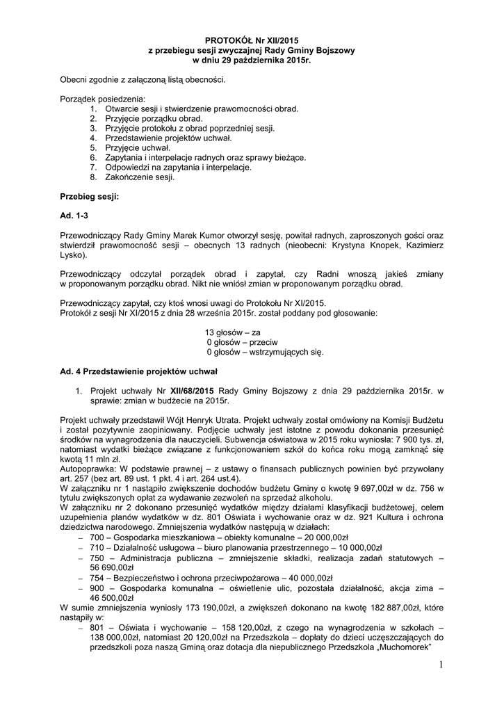 PROTOKÓŁ Nr XII/2015 z przebiegu sesji zwyczajnej Rady Gminy Bojszowy w dniu 29 października 2015r. Obecni zgodnie z załączoną listą obecności. Porządek posiedzenia: 1. Otwarcie sesji i stwierdzenie prawomocności obrad. 2. Przyjęcie porządku obrad. 3. Przyjęcie protokołu z obrad poprzedniej sesji. 4. Przedstawienie projektów uchwał. 5. Przyjęcie uchwał. 6. Zapytania i interpelacje radnych oraz sprawy bieżące. 7. Odpowiedzi na zapytania i interpelacje. 8. Zakończenie sesji. Przebieg sesji: Ad. 1-3 Przewodniczący Rady Gminy Marek Kumor otworzył sesję, powitał radnych, zaproszonych gości oraz stwierdził prawomocność sesji – obecnych 13 radnych (nieobecni: Krystyna Knopek, Kazimierz Lysko). Przewodniczący odczytał porządek obrad i zapytał, czy Radni wnoszą jakieś w proponowanym porządku obrad. Nikt nie wniósł zmian w proponowanym porządku obrad. zmiany Przewodniczący zapytał, czy ktoś wnosi uwagi do Protokołu Nr XI/2015. Protokół z sesji Nr XI/2015 z dnia 28 września 2015r. został poddany pod głosowanie: 13 głosów – za 0 głosów – przeciw 0 głosów – wstrzymujących się. Ad. 4 Przedstawienie projektów uchwał 1. Projekt uchwały Nr XII/68/2015 Rady Gminy Bojszowy z dnia 29 października 2015r. w sprawie: zmian w budżecie na 2015r. Projekt uchwały przedstawił Wójt Henryk Utrata. Projekt uchwały został omówiony na Komisji Budżetu i został pozytywnie zaopiniowany. Podjęcie uchwały jest istotne z powodu dokonania przesunięć środków na wynagrodzenia dla nauczycieli. Subwencja oświatowa w 2015 roku wyniosła: 7 900 tys. zł, natomiast wydatki bieżące związane z funkcjonowaniem szkół do końca roku mogą zamknąć się kwotą 11 mln zł. Autopoprawka: W podstawie prawnej – z ustawy o finansach publicznych powinien być przywołany art. 257 (bez art. 89 ust. 1 pkt. 4 i art. 264 ust.4). W załączniku nr 1 nastąpiło zwiększenie dochodów budżetu Gminy o kwotę 9 697,00zł w dz. 756 w tytułu zwiększonych opłat za wydawanie zezwoleń na sprzedaż alkoholu. W załączniku nr 2 dokonano przesunięć wydatków między działami klasyfikacji budżetowej, celem uzupełnienia planów wydatków w dz. 801 Oświata i wychowanie oraz w dz. 921 Kultura i ochrona dziedzictwa narodowego. Zmniejszenia wydatków następują w działach: 700 – Gospodarka mieszkaniowa – obiekty komunalne – 20 000,00zł 710 – Działalność usługowa – biuro planowania przestrzennego – 10 000,00zł 750 – Administracja publiczna – zmniejszenie składki, realizacja zadań statutowych – 56 690,00zł 754 – Bezpieczeństwo i ochrona przeciwpożarowa – 40 000,00zł 900 – Gospodarka komunalna – oświetlenie ulic, pozostała działalność, akcja zima – 46 500,00zł W sumie zmniejszenia wyniosły 173 190,00zł, a zwiększeń dokonano na kwotę 182 887,00zł, które nastąpiły w: 801 – Oświata i wychowanie – 158 120,00zł, z czego na wynagrodzenia w szkołach – 138 000,00zł, natomiast 20 120,00zł na Przedszkola – dopłaty do dzieci uczęszczających do przedszkoli poza naszą Gminą oraz dotacja dla niepublicznego Przedszkola „Muchomorek” 1 851 – Ochrona zdrowia – 9 697,00zł – przeciwdziałanie alkoholizmowi poprzez świetlice socjoterapeutyczne, kluby młodzieżowe - wynagrodzenia dla pracowników, na materiały 921 – Kultura i ochrona dziedzictwa narodowego – 15 070,00zł – działalność kulturowa, wydawanie gazety Załącznik nr 3 – Dopisanie w dziale 851 rozdz. 85154 Przeciwdziałanie uzależnieniom kwoty 9 697,00zł – wynagrodzenia. Załącznik nr 4 - uaktualnienie w dziale 801 rozdz. 80104 – dotacja do Niepublicznego Przedszkola Muchomorek Uwagi radnych: Brak uwag Ad. 5 Przyjęcie uchwał. Przyjęcie uchwał: W głosowaniu udział wzięło 13 radnych (nieobecny/a K. Knopek, K. Lysko). 1. Uchwała Nr XII/68/2015 Rady Gminy Bojszowy z dnia 29 października 2015r. w sprawie: zmian w budżecie na 2015r. 13 głosów – za 0 głosów - przeciw 0 głosów - wstrzymujących się Ad. 6 Zapytania i interpelacje radnych oraz sprawy bieżące. Przewodniczący Marek Kumor: 1. Przedstawił sprawozdanie z prac w okresie międzysesyjnym: Udział w pracach Komisji Budżetu i Rozwoju Gminy Wystawa „Przez Skrzydła Motyla” Uroczystość Dnia Edukacji Narodowej Pasowanie Przedszkolaków – uroczystość w Przedszkolu w Międzyrzeczu XVI Jesień Organowa w Powiecie Bieruńsko-Lędzińskim Pasowanie na ucznia – Szkoła Podstawowa w Międzyrzeczu 2. Do biura Rady wpłynęła prośba Wójta Gminy Bojszowy o sprostowanie w Protokole nr X z sesji Rady Gminy z dnia 12 sierpnia 2015 roku – zastąpienie sformułowania: „Po rozmowach z Regionalną Izbą Obrachunkową została podjęta decyzja ” stwierdzeniem: „Konieczne było podjęcie decyzji ”. Przewodniczący zarządził głosowanie w sprawie przyjęcia sprostowania do Protokołu nr X z dnia 12 sierpnia 2015 roku, przyjętego na sesji nr XI w dniu 28.09.2015r. (głosowało 13 radnych): 13 głosów – za 0 głosów - przeciw 0 głosów - wstrzymujących się Zmiana do protokołu została przyjęta jednogłośnie. Sprostowanie do protokołu Nr X/2015 z przebiegu sesji zwyczajnej Rady Gminy Bojszowy w dniu 12 sierpnia 2015r. w załączniku nr 1. 3. Przewodniczący odczytał pisma Bronisława Jasińskiego: z dnia 12 października 2015r. w sprawie Wezwanie do Rady Gminy i z dnia 21 października 2015r. w sprawie Wezwanie Naruszenie prawa oraz odpowiedzi na te pisma. Radny Stanisław Biela: Wyraził swoje zdanie, że organem kontrolnym Rady Gminy jest Komisja Rewizyjna, która rozpatruje wnioski i skargi na organ Wójta czy Radę Gminy. W poprzedniej kadencji były podobne skargi, które były rozpatrywane na Komisji i były wydawane opinie Komisji i stanowiska Rady. Teraz nie ma takiej potrzeby by przekazywać to Komisji, bo Przewodniczący odpowiada zgonie z stanowiskiem Rady. Mecenas Mirosław Nosalik: Omówił korespondencję związaną z pismami