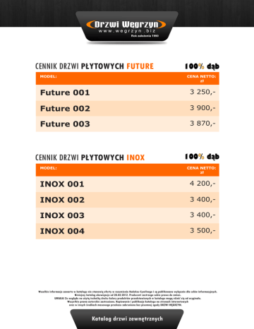 CENNIK DRZWI PŁYTOWYCH FUTURE MODEL: 100% dąb CENA NETTO: zł Future 001 3 250,- Future 002 3 900,- Future 003 3 870,- CENNIK DRZWI PŁYTOWYCH INOX MODEL: 100% dąb CENA NETTO: zł INOX 001 4 200,- INOX 002 3 400,- INOX 003 3 400,- INOX 004 3 500,- Wszelkie informacje zawarte w katalogu nie stanowią oferty w rozumieniu Kodeksu Cywilnego i są publikowane wyłącznie dla celów informacyjnych. Niniejszy katalog obowiązuje od 28.02.2012. Producent zastrzega sobie prawo do zmian. UWAGA! Ze względu na użytą technikę druku kolory produktów przedstawionych w katalogu mogą różnić się od oryginału. Wszystkie prawa autorskie zastrzeżone. Kopiowanie i publikacja katalogu na stronach internetowych oraz w innych środkach masowego przekazu zabroniona bez pisemnej zgody DRZWI WĘGRZYN. Katalog drzwi zewnętrznych CENNIK DRZWI PŁYTOWYCH ZEBRANO MODEL: 100% dąb CENA NETTO: zł Zebrano 001 4 400,- Zebrano 002 4 350,- Zebrano 003 4 370,- Zebrano 004 4 420,- CENNIK DRZWI PŁYTOWYCH CARBON MODEL: 100% dąb CENA NETTO: zł Carbon 001 4 600,- Carbon 002 4 600,- Carbon 003 4 680,- Wszelkie informacje zawarte w katalogu nie stanowią oferty w rozumieniu Kodeksu Cywilnego i są publikowane wyłącznie dla celów informacyjnych. Niniejszy katalog obowiązuje od 28.02.2012. Producent zastrzega sobie prawo do zmian. UWAGA! Ze względu na użytą technikę druku kolory produktów przedstawionych w katalogu mogą różnić się od oryginału. Wszystkie prawa autorskie zastrzeżone. Kopiowanie i publikacja katalogu na stronach internetowych oraz w innych środkach masowego przekazu zabroniona bez pisemnej zgody DRZWI WĘGRZYN. Katalog drzwi zewnętrznych