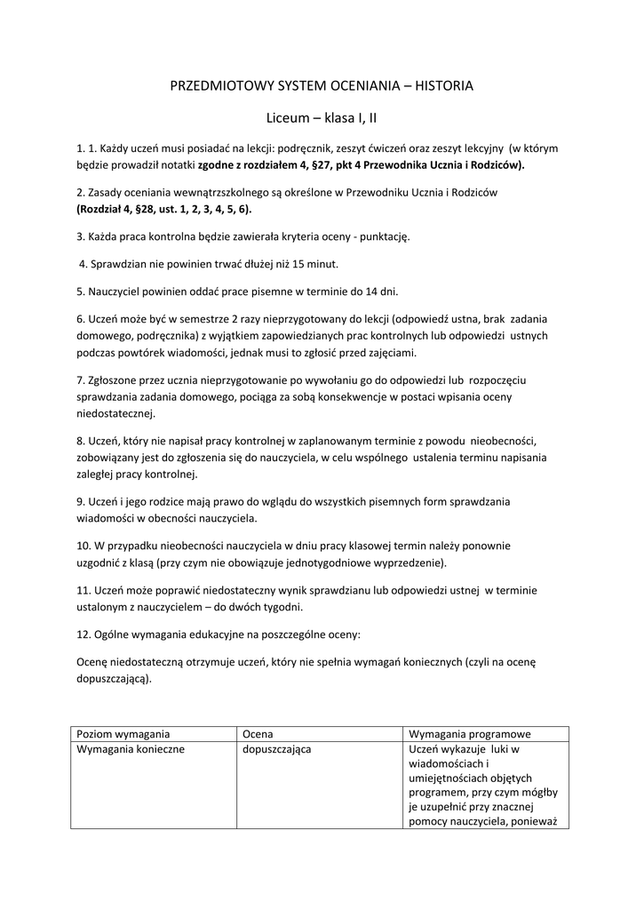 PRZEDMIOTOWY SYSTEM OCENIANIA – HISTORIA Liceum – klasa I, II 1. 1. Każdy uczeń musi posiadać na lekcji: podręcznik, zeszyt ćwiczeń oraz zeszyt lekcyjny (w którym będzie prowadził notatki zgodne z rozdziałem 4, §27, pkt 4 Przewodnika Ucznia i Rodziców). 2. Zasady oceniania wewnątrzszkolnego są określone w Przewodniku Ucznia i Rodziców (Rozdział 4, §28, ust. 1, 2, 3, 4, 5, 6). 3. Każda praca kontrolna będzie zawierała kryteria oceny - punktację. 4. Sprawdzian nie powinien trwać dłużej niż 15 minut. 5. Nauczyciel powinien oddać prace pisemne w terminie do 14 dni. 6. Uczeń może być w semestrze 2 razy nieprzygotowany do lekcji (odpowiedź ustna, brak zadania domowego, podręcznika) z wyjątkiem zapowiedzianych prac kontrolnych lub odpowiedzi ustnych podczas powtórek wiadomości, jednak musi to zgłosić przed zajęciami. 7. Zgłoszone przez ucznia nieprzygotowanie po wywołaniu go do odpowiedzi lub rozpoczęciu sprawdzania zadania domowego, pociąga za sobą konsekwencje w postaci wpisania oceny niedostatecznej. 8. Uczeń, który nie napisał pracy kontrolnej w zaplanowanym terminie z powodu nieobecności, zobowiązany jest do zgłoszenia się do nauczyciela, w celu wspólnego ustalenia terminu napisania zaległej pracy kontrolnej. 9. Uczeń i jego rodzice mają prawo do wglądu do wszystkich pisemnych form sprawdzania wiadomości w obecności nauczyciela. 10. W przypadku nieobecności nauczyciela w dniu pracy klasowej termin należy ponownie uzgodnić z klasą (przy czym nie obowiązuje jednotygodniowe wyprzedzenie). 11. Uczeń może poprawić niedostateczny wynik sprawdzianu lub odpowiedzi ustnej w terminie ustalonym z nauczycielem – do dwóch tygodni. 12. Ogólne wymagania edukacyjne na poszczególne oceny: Ocenę niedostateczną otrzymuje uczeń, który nie spełnia wymagań koniecznych (czyli na ocenę dopuszczającą). Poziom wymagania Wymagania konieczne Ocena dopuszczająca Wymagania programowe Uczeń wykazuje luki w wiadomościach i umiejętnościach objętych programem, przy czym mógłby je uzupełnić przy znacznej pomocy nauczyciela, ponieważ Wymagania podstawowe dostateczna Wymagania rozszerzające dobra Wymagania dopełniające Bardzo dobra przyswoił sobie najbardziej podstawowe fakty. Potrafi umiejscowić najważniejsze wydarzenia w czasie i przestrzeni. Przejawia chęci uzupełnienia swej wiedzy, choć na lekcji jest bierny. Z prac kontrolnych i sprawdzianów uzyskuje od 41% do 55% punktów. Uczeń wykazuje średnie opanowanie materiału przewidzianego programem. Jego wiedza jest typowo odtwórcza, wyrywkowa, ogólnikowa i fragmentaryczna. Uczeń nie potrafi operować ciągami przyczynowoskutkowymi, nie koreluje wiedzy, nie potrafi też dokonać własnych spójnych ocen zjawisk i ludzi. Poprawnie wykonuje zadania przy pomocy nauczyciela. Uczeń wykazuje sporadyczną aktywność na lekcjach. Z prac kontrolnych i sprawdzianów uzyskuje od 56% do 70% punktów. Uczeń ma w zakresie wiedzy faktograficznej i umiejętności niewielkie braki. Poprawnie rozwiązuje zadania o pewnym stopniu trudności i wymagające opanowania umiejętności przewidzianych programem. Uczeń ma niewielkie braki w myśleniu przyczynowo – skutkowym. Stara się korelować zdobytą na lekcji wiedzę z materiałem znanym mu z innych przedmiotów. Poprawnie analizuje źródła historyczne o pewnym stopniu trudności. Wykazuje aktywność na lekcjach. Z prac kontrolnych i sprawdzianów uzyskuje od 71% do 85% punktów. wiadomości objęte podstawą programową. Jego wiedza faktograficzna i umiejętności są rozległe. Uczeń wykorzystuje Wymagania wykraczające celująca różne źródła wiedzy i potrafi skorelować ją z wiedzą z pokrewnych przedmiotów. Potrafi myśleć przyczynowo – skutkowo, dokonywać analiz i syntez. Sprawnie posługuje się aparatem pojęciowym historyka. Uczeń potrafi uzasadnić wypowiadane sądy i opinie. Aktywnie uczestniczy w lekcjach, starannie wykonuje zadania. Z prac kontrolnych i sprawdzianów uzyskuje od 86% do 100% punktów Uczeń posiada rozległą wiedzę historyczną. Jej zasób świadczy o wyraźnych i sprecyzowanych uzdolnieniach humanistycznych. Potrafi myśleć przyczynowo – skutkowo i globalnie, dokonywać analiz i syntez. Oceny zjawisk czy osób są wyważone, przemyślane i uwzględniają możliwie szerokie konteksty. Uczeń czynnie uczestniczy w lekcjach, prezentuje dociekliwość podczas rozwiązywania problemów historycznych. Wykorzystuje wiedzę z pokrewnych przedmiotów, starannie wykonuje zadania. Uczeń uczestniczy i osiąga sukcesy w szkolnych i pozaszkolnych konkursach i olimpiadach. Pisze dodatkowe ponadprogramowe prace, czyta książki historyczne, których tematyka i poziom są zbieżne z programem nauczania. Uczeń posiada elementy wiedzy historiograficznej. Z prac kontrolnych i sprawdzianów uzyskuje 100% i ponad 100% punktów.