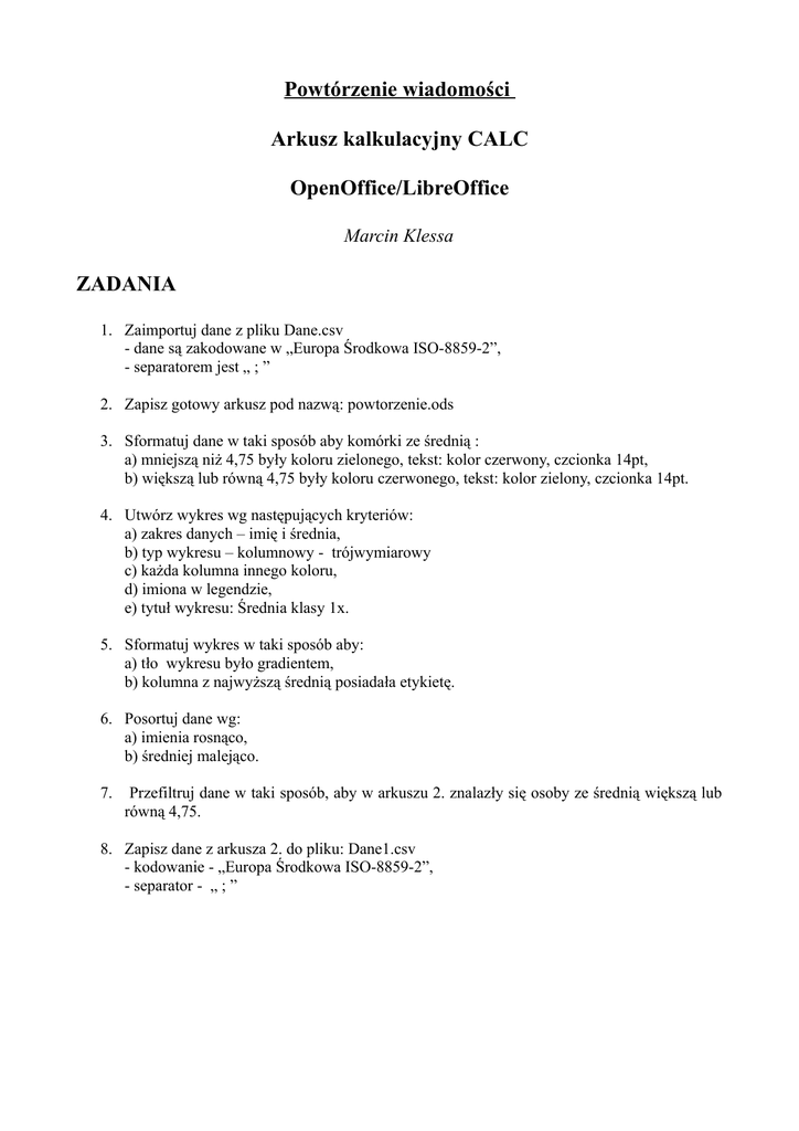 Powtórzenie wiadomości Arkusz kalkulacyjny CALC OpenOffice/LibreOffice Marcin Klessa ZADANIA 1. Zaimportuj dane z pliku Dane.csv - dane są zakodowane w „Europa Środkowa ISO-8859-2”, - separatorem jest „ ; ” 2. Zapisz gotowy arkusz pod nazwą: powtorzenie.ods 3. Sformatuj dane w taki sposób aby komórki ze średnią : a) mniejszą niż 4,75 były koloru zielonego, tekst: kolor czerwony, czcionka 14pt, b) większą lub równą 4,75 były koloru czerwonego, tekst: kolor zielony, czcionka 14pt. 4. Utwórz wykres wg następujących kryteriów: a) zakres danych – imię i średnia, b) typ wykresu – kolumnowy - trójwymiarowy c) każda kolumna innego koloru, d) imiona w legendzie, e) tytuł wykresu: Średnia klasy 1x. 5. Sformatuj wykres w taki sposób aby: a) tło wykresu było gradientem, b) kolumna z najwyższą średnią posiadała etykietę. 6. Posortuj dane wg: a) imienia rosnąco, b) średniej malejąco. 7. Przefiltruj dane w taki sposób, aby w arkuszu 2. znalazły się osoby ze średnią większą lub równą 4,75. 8. Zapisz dane z arkusza 2. do pliku: Dane1.csv - kodowanie - „Europa Środkowa ISO-8859-2”, - separator - „ ; ”