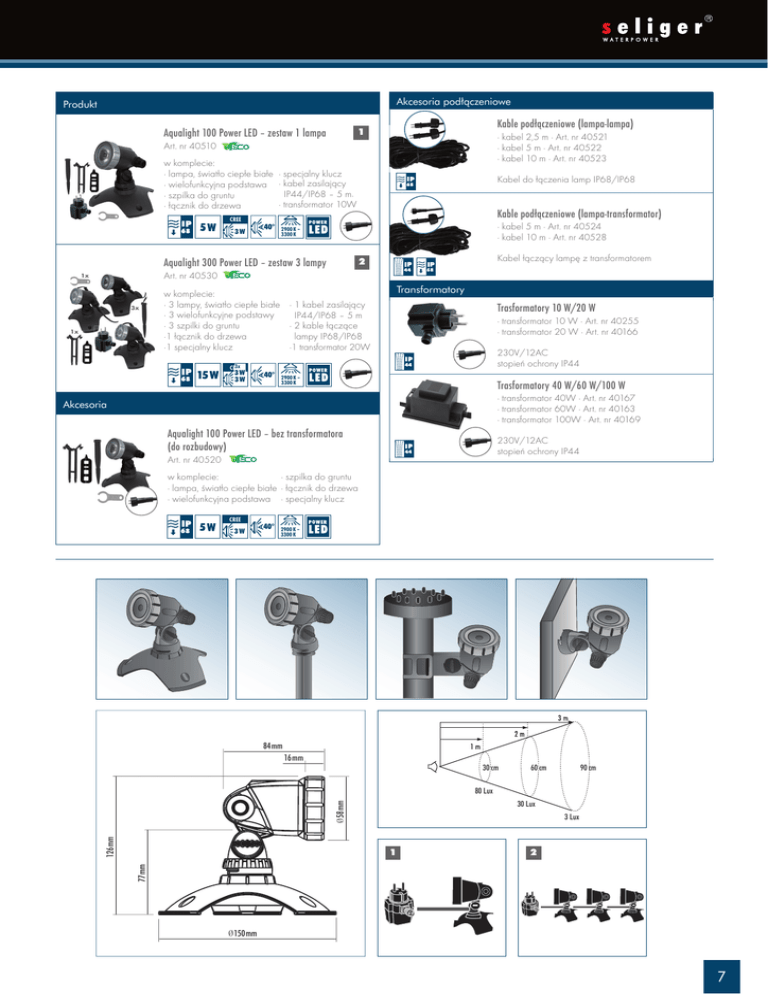Akcesoria podłączeniowe Produkt Aqualight 100 Power LED – zestaw 1 lampa Kable podłączeniowe (lampa-lampa) 1 · kabel 2,5 m · Art. nr 40521 · kabel 5 m · Art. nr 40522 · kabel 10 m · Art. nr 40523 Art. nr 40510 w komplecie: · lampa, światło ciepłe białe · specjalny klucz · wielofunkcyjna podstawa · kabel zasilający IP44/IP68 – 5 m· · szpilka do gruntu · transformator 10W · łącznik do drzewa CREE 3W 40° Kabel do łączenia lamp IP68/IP68 Kable podłączeniowe (lampa-transformator) · kabel 5 m · Art. nr 40524 · kabel 10 m · Art. nr 40528 2900 K – 3300 K Aqualight 300 Power LED – zestaw 3 lampy Kabel łączący lampę z transformatorem 2 Art. nr 40530 1x 3x 3 x 1x 1x Transformatory w komplecie: · 3 lampy, światło ciepłe białe · 1 kabel zasilający · 3 wielofunkcyjne podstawy IP44/IP68 – 5 m · 3 szpilki do gruntu · 2 kable łączące ·1 łącznik do drzewa lampy IP68/IP68 ·1 specjalny klucz ·1 transformator 20W 3x CREE 3W 3W 40° Trasformatory 10 W/20 W · transformator 10 W · Art. nr 40255 · transformator 20 W · Art. nr 40166 230V/12AC stopień ochrony IP44 2900 K – 3300 K Trasformatory 40 W/60 W/100 W · transformator 40W · Art. nr 40167 · transformator 60W · Art. nr 40163 · transformator 100W · Art. nr 40169 Akcesoria Aqualight 100 Power LED – bez transformatora (do rozbudowy) 230V/12AC stopień ochrony IP44 Art. nr 40520 w komplecie: · szpilka do gruntu · lampa, światło ciepłe białe · łącznik do drzewa · wielofunkcyjna podstawa · specjalny klucz CREE 3W 40° 2900 K – 3300 K 84mm 16mm 30 cm 60 cm 90 cm 80 Lux 126 mm 嘶58mm 30 Lux 3 Lux 2 77mm 1 嘶150mm 7