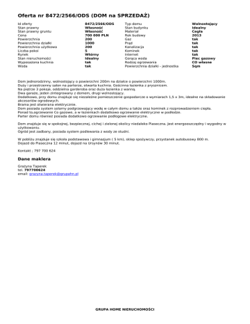 Oferta nr 8472/2566/ODS (DOM na SPRZEDAŻ) Id oferty Stan prawny Stan prawny gruntu Cena Powierzchnia Powierzchnia działki Powierzchnia użytkowa Liczba pokoi Rynek Stan nieruchomości Wyposażona kuchnia Woda 8472/2566/ODS Własność Własność 700 000 PLN 200 1000 200 5 Wtórny Idealny tak tak Typ domu Stan budynku Materiał Rok budowy Gaz Prąd Kanalizacja Kominek Internet Gorąca woda Rodzaj ogrzewania Powierzchnia działki - jednostka Wolnostojący Idealny Cegła 2013 tak tak tak tak tak Piec gazowy CO własne Sqm Dom jednorodzinny, wolnostojący o powierzchni 200m na działce o powierzchni 1000m. Duży i przestrzenny salon na parterze, otwarta kuchnia. Gościnna łazienka z prysznicem. Na piętrze 3 pokoje, oddzielna garderoba oraz duża łazienka z wanną. Dwa garaże, jeden zintegrowany z domem, drugi wolnostojący. Dodatkowo, przy domu znajduje się niezależne pomieszczenie gospodarcze o wymiarach 1,5 x 3m, idealne na składowanie akcesoriów ogrodowych. Brama jest otwierana elektrycznie. Dom posiada system solarny podgrzewający wodę w całym domu a także oraz kominek z rozprowadzeniem ciepła. Ponad to,ogrzewanie Co gazowe, a w łazienkach dodatkowo ogrzewanie elektryczne w podłodze. Parter domu również posiada dodatkowo ogrzewanie podłogowe elektryczne. Dom znajduje się w spokojnej, bezpiecznej, cichej i zielonej okolicy niedaleko Piaseczna. Jest energooszczędny i wygodny w użytkowaniu. Ogród jest zadbany, posiada system podlewania z wody ze studni. W pobliżu znajduje się szkoła podstawowa i gimnazjum ( 5 km), sklep spożywczy, przystanek autobusowy 800 m. Dojazd do Piaseczna 12 minut, dojazd na Ursynów 30 minut. Kontakt ; 797 700 624 Dane maklera Grażyna Taperek tel. 797700624 email: [email protected] GRUPA HOME NIERUCHOMOŚCI Powered by TCPDF (www.tcpdf.org)