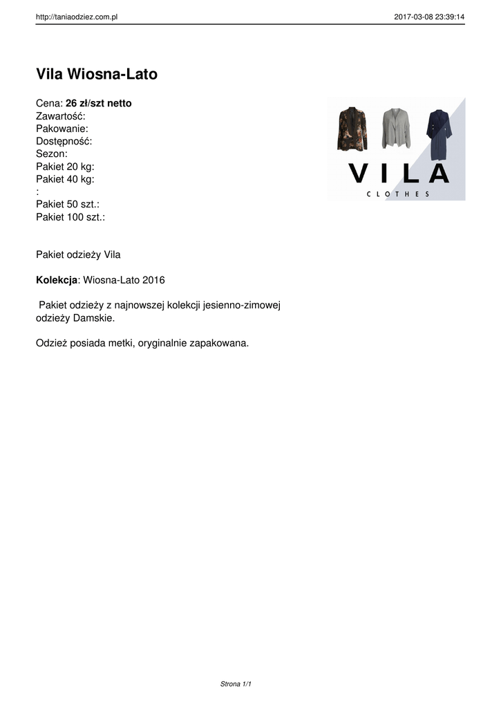 http://taniaodziez.com.pl 2017-03-08 23:39:14 Vila Wiosna-Lato Cena: 26 zł/szt netto Zawartość: Pakowanie: Dostępność: Sezon: Pakiet 20 kg: Pakiet 40 kg: : Pakiet 50 szt.: Pakiet 100 szt.: Pakiet odzieży Vila Kolekcja: Wiosna-Lato 2016 Pakiet odzieży z najnowszej kolekcji jesienno-zimowej odzieży Damskie. Odzież posiada metki, oryginalnie zapakowana. Strona 1/1