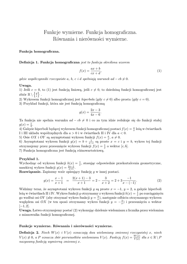 2) Wykresem funkcji homograficznej jest hiperbola (gdy c 6= 0) albo prosta (gdy c = 0).