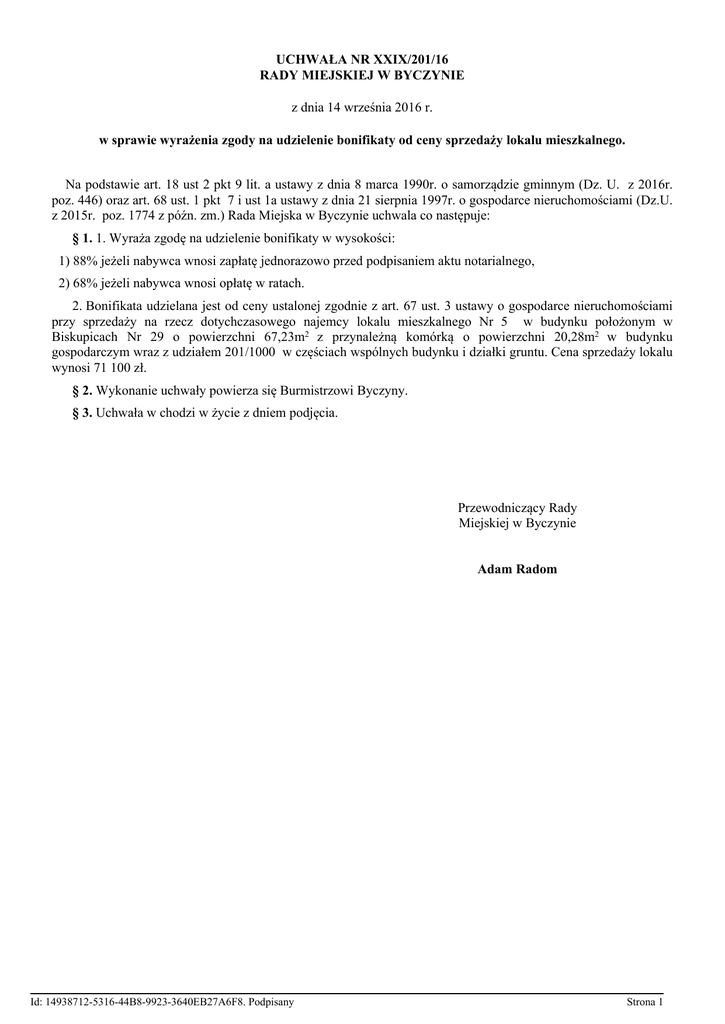 UCHWAŁA NR XXIX/201/16 RADY MIEJSKIEJ W BYCZYNIE z dnia 14 września 2016 r. w sprawie wyrażenia zgody na udzielenie bonifikaty od ceny sprzedaży lokalu mieszkalnego. Na podstawie art. 18 ust 2 pkt 9 lit. a ustawy z dnia 8 marca 1990r. o samorządzie gminnym (Dz. U. z 2016r. poz. 446) oraz art. 68 ust. 1 pkt 7 i ust 1a ustawy z dnia 21 sierpnia 1997r. o gospodarce nieruchomościami (Dz.U. z 2015r. poz. 1774 z późn. zm.) Rada Miejska w Byczynie uchwala co następuje: § 1. 1. Wyraża zgodę na udzielenie bonifikaty w wysokości: 1) 88% jeżeli nabywca wnosi zapłatę jednorazowo przed podpisaniem aktu notarialnego, 2) 68% jeżeli nabywca wnosi opłatę w ratach. 2. Bonifikata udzielana jest od ceny ustalonej zgodnie z art. 67 ust. 3 ustawy o gospodarce nieruchomościami przy sprzedaży na rzecz dotychczasowego najemcy lokalu mieszkalnego Nr 5 w budynku położonym w Biskupicach Nr 29 o powierzchni 67,23m2 z przynależną komórką o powierzchni 20,28m2 w budynku gospodarczym wraz z udziałem 201/1000 w częściach wspólnych budynku i działki gruntu. Cena sprzedaży lokalu wynosi 71 100 zł. § 2. Wykonanie uchwały powierza się Burmistrzowi Byczyny. § 3. Uchwała w chodzi w życie z dniem podjęcia. Przewodniczący Rady Miejskiej w Byczynie Adam Radom Id: 14938712-5316-44B8-9923-3640EB27A6F8. Podpisany Strona 1