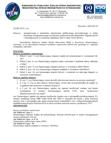 SAMODZIELNY PUBLICZNY ZAKŁAD OPIEKI ZDROWOTNEJ MINISTERSTWA SPRAW WEWNĘTRZNYCH W RZESZOWIE ul. Krakowska 16, 35-111 Rzeszów tel. 17 86 43 312, sek./fax 17 85 32 770 [email protected] www.szpitalmsw.rzeszow.pl NIP: 813-28-92-063 REGON: 690028840 Rzeszów, 2016-02-10 Z/ZZP.2375.1.16 dotyczy: postępowania o udzielenie zamówienia publicznego prowadzonego w trybie przetargu nieograniczonego na dostawę jednorazowych materiałów higienicznych i chirurgicznych (z terminem składania ofert w dniu 16.02.2016r.) Samodzielny Publiczny Zakład Opieki Zdrowotnej MSW w Rzeszowie (Zamawiający) informuje, Ŝe do specyfikacji istotnych warunków zamówienia (SIWZ) dot. przetargu jw. wpłynęły następujące zapytania: PYTANIE: Dotyczy produktów zamówienia: 1. Pakiet 2, poz. 3: czy Zamawiający dopuści majtki do kolonoskopii w rozmiarach MXL? 2. Pakiet 2 poz. 6: czy Zamawiający dopuści myjki wykonane z laminatu taśmy chłonnej z folią? 3. Pakiet 2, poz. 9: czy Zamawiający dopuści poszwy w rozmiarze 200x150cm? 4. Pakiet 2, poz. 10: czy Zamawiający dopuści podkład w rozmiarze 160x90cm? 5. Pakiet 2, poz. 13: czy Zamawiający dopuści fartuch z rozcięciem na całej jego długości, w rozmiarze uniwersalnym? Dotyczy zapisów umowy: 1. §1 ust. 2: czy Zamawiający moŜe określić jaki procent umowy na pewno zrealizuje? 2. § 2 ust. 3: Czy za dni robocze Zamawiający uwaŜa dni od poniedziałku do piątku za wyjątkiem dni ustawowo wolnych od pracy? 3. § 3 ust. 2a: czy Zamawiający zgadza się zapisać moŜliwość zmiany cen brutto wynikającej ze zmiany obowiązującej stawki VAT, przy zachowaniu dotychczasowych cen netto? czy Zamawiający zgadza się zapisać moŜliwość zmiany cen w przypadku przekraczającej 3% zmiany średniego kursu NBP walut EUR lub USD w stosunku do kursu z dnia zawarcia umowy oraz w przypadku gdy suma miesięcznych wskaźników cen i usług konsumpcyjnych opublikowanych przez Prezesa GUS za okres od dnia zawarcia umowy przekroczy 3%? ODPOWIEDŹ: dotyczy produktów zamówienia Ad. Pakiet nr 2 poz. 3 Zamawiający dopuści majtki do kolonoskopii, których obwód pasa w stanie rozciągniętym wynosi minimum 124 cm. Ad. Pakiet nr 2 poz. 6, 9, 13, Zamawiający podtrzymuje zapisy SIWZ. Ad. Pakiet nr 2 poz. 10 Zamawiający dopuści podkład w rozmiarze 160x90cm dotyczy zapisów umowy Ad. pyt. 1 Zamawiający zamówi co najmniej taki % ilości wyrobów określonej w umowie, który zapewni realizację rzeczywistego zapotrzebowania na te wyroby w czasie obowiązywania umowy. Ad. pyt. 2 Za dni robocze w rozumieniu wzoru umowy będą uwaŜane dni od poniedziałku do piątku, za wyjątkiem dni ustawowo wolnych od pracy. Zostało to wyraźnie napisane w Rozdziale II pkt. 2 SIWZ. Ad. pyt. 3 Zamawiający przewiduje zmianę treści umowy w przypadku zmiany stawki podatku VAT zgodnie z zapisami SIWZ Rozdział XIV pkt. 2. Ad. pyt. 4 Zamawiający nie wyraŜa zgody na dokonanie zmian w projekcie umowy.