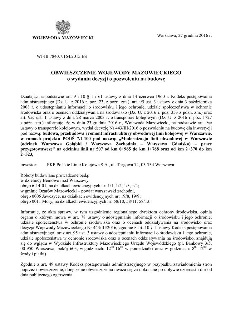 WOJEWODA MAZOWIECKI Warszawa, 27 grudnia 2016 r. WI-III.7840.7.164.2015.ES OBWIESZCZENIE WOJEWODY MAZOWIECKIEGO o wydaniu decyzji o pozwoleniu na budowę Działając na podstawie art. 9 i 10 § 1 i 61 ustawy z dnia 14 czerwca 1960 r. Kodeks postępowania administracyjnego (Dz. U. z 2016 r. poz. 23, z późn. zm.), art. 95 ust. 3 ustawy z dnia 3 października 2008 r. o udostępnianiu informacji o środowisku i jego ochronie, udziale społeczeństwa w ochronie środowiska oraz o ocenach oddziaływania na środowisko (Dz. U. z 2016 r. poz. 353 z późn. zm.) oraz art. 9ac ust. 1 ustawy z dnia 28 marca 2003 r. o transporcie kolejowym (Dz. U. z 2016 r. poz. 1727 z późn. zm.) informuję, że w dniu 23 grudnia 2016 r., Wojewoda Mazowiecki, na podstawie art. 9ac ustawy o transporcie kolejowym, wydał decyzję Nr 443/III/2016 o pozwoleniu na budowę dla inwestycji pod nazwą: budowa, przebudowa i remont infrastruktury obwodowej linii kolejowej w Warszawie, w ramach projektu POIiŚ 7.1-100 pod nazwą: „Modernizacja linii obwodowej w Warszawie (odcinek Warszawa Gołąbki / Warszawa Zachodnia – Warszawa Gdańska) – prace przygotowawcze” na odcinku linii nr 507 od km 0+965 do km 1+768 oraz od km 2+370 do km 2+523, inwestor: PKP Polskie Linie Kolejowe S.A., ul. Targowa 74, 03-734 Warszawa Roboty budowlane prowadzone będą: w dzielnicy Bemowo m.st Warszawy, obręb 6-14-01, na działkach ewidencyjnych nr: 1/1, 1/2, 1/3, 1/4; w gminie Ożarów Mazowiecki – powiat warszawski zachodni, obręb 0005 Jawczyce, na działkach ewidencyjnych nr: 19/8, 19/9; obręb 0011 Mory, na działkach ewidencyjnych nr: 58/10, 58/11, 58/13. Informuję, że akta sprawy, w tym uzgodnienie regionalnego dyrektora ochrony środowiska, opinia organu o którym mowa w art. 78 ustawy o udostępnianiu informacji o środowisku i jego ochronie, udziale społeczeństwa w ochronie środowiska oraz o ocenach oddziaływania na środowisko oraz decyzja Wojewody Mazowieckiego Nr 443/III/2016, zgodnie z art. 10 § 1 ustawy Kodeks postępowania administracyjnego, oraz art. 95 ust. 3 ustawy o udostępnianiu informacji o środowisku i jego ochronie, udziale społeczeństwa w ochronie środowiska oraz o ocenach oddziaływania na środowisko, znajdują się do wglądu w Wydziale Infrastruktury Mazowieckiego Urzędu Wojewódzkiego (pl. Bankowy 3/5, 00-950 Warszawa, pokój 603, w godzinach: 1200-1600 w poniedziałki oraz w godzinach: 800-1200 w środy i piątki). Zgodnie z art. 49 ustawy Kodeks postępowania administracyjnego w przypadku zawiadomienia stron poprzez obwieszczenie, doręczenie obwieszczenia uważa się za dokonane po upływie czternastu dni od dnia publicznego ogłoszenia.