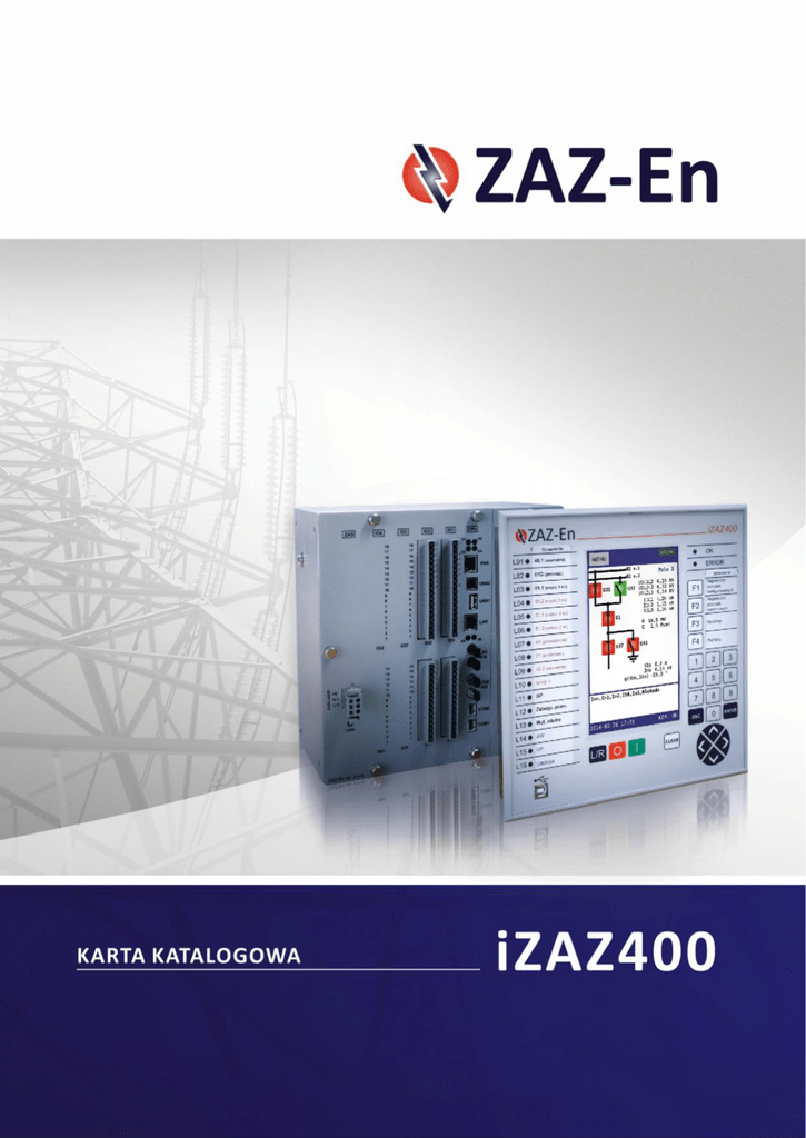 iZAZ400 2 / 12 KARTA KATALOGOWA Zastosowanie Urządzenia iZAZ400 to seria cyfrowych zespołów automatyki zabezpieczeniowej o dużej mocy obliczeniowej, wielofunkcyjnych, z funkcją komunikacji, o maksymalnie 12 wejściach pomiarowych. Urządzenia te, charakteryzujące się wysoką dokładnością i pewnością działania, mogą pracować w układach automatyki jako kompleksowe zabezpieczenia pól średnich napięć (zasilających, łącznika szyn, odpływowych, transformatorów, silników, pomiarowych, itp.), pól wysokich napięć oraz generatorów małej mocy. Przy odpowiedniej konfiguracji sprzętowej i programowej dostępne są automatyki SCO, SPZ, SNO, ZS, SZR, SPP, APZ, a także LRW. Istnieje możliwość zastosowania iZAZ400 jako zabezpieczenia odległościowego pięciostrefowego z charakterystykami poligonalnymi bądź kołowymi oraz funkcjami SPZ jednofazowego, łącza teletechnicznego i prądu wstecznego, lokalizatora miejsca zwarcia, blokady od kołysań mocy. iZAZ400 może również pełnić rolę zabezpieczenia różnicowego linii średnich i wysokich napięć zrealizowanego jako dwa półkomplety z dedykowanym łączem światłowodowym. Oprócz funkcji zabezpieczeniowych i automatyk, urządzenia realizują pomiary, rejestracje, sterowanie awaryjne i sygnalizację. Do komunikacji z zespołem mogą być wykorzystane: dwa porty szeregowe RS-485 (opcjonalnie w wersji światłowodowej), łącze LAN przewodowe lub światłowodowe oraz port USB na panelu operatora. Modułowa konstrukcja daje możliwość optymalnego dostosowania konfiguracji sprzętowej do wymagań zabezpieczanego obiektu. Kolorowy, dotykowy wyświetlacz o przekątnej 7" umożliwia czytelną prezentację układu synoptyki pola wraz z niezbędnymi pomiarami i dodatkowymi informacjami. Swobodnie programowalna logika działania, z wykorzystaniem graficznego edytora, umożliwia czytelny i przejrzysty sposób realizacji różnorodnych aplikacji, zarówno typowych jak i dedykowanych, z uwzględnieniem specyficznych wymagań dla określonego obiektu. Sterownik pola umożliwia sterowanie wyłącznikiem oraz łącznikami z zachowaniem wymaganych blokad funkcjonalnych. Zachowanie uniwersalności sprzętowo-programowej umożliwia zmianę konfiguracji i dostosowanie do różnorodnych obiektów w prosty i intuicyjny sposób. Opracowana przez producenta baza aplikacji daje możliwość stosowania domyślnych rozwiązań. Ponadto istnieje możliwość wprowadzania zmian w konfiguracji, uwzględniających specyfikę zabezpieczanego obiektu i potrzeby użytkownika. Modyfikacja konfiguracji może uwzględniać uzupełnienie realizowanych funkcji zabezpieczeniowych lub automatyk oraz zmianę zależności logiczno-czasowych (m.in. sposób sterowania diodami świecącymi na panelu, sygnalizację na wyświetlaczu, sterowanie przekaźnikami sygnalizacyjnymi oraz sposób sterowania awaryjnego). Rejestratory Urządzenie wyposażone jest w trzy różne rejestratory, umożliwiające analizę zjawisk zachodzących w chronionym obiekcie. Rejestrator zdarzeń – podstawowy rejestrator stanów, zapisywany w chronologicznym dzienniku zdarzeń z rozdzielczością 1 ms. Bufor okrężny pamięci o pojemności 500 zdarzeń. Rejestrowane są pobudzenia, odwzbudzenia oraz zadziałania zabezpieczeń, a także zmiany stanów wejść binarnych, automatyk oraz inne zdarzenia generowane z wewnętrznej logiki. Wszystkie zdarzenia mają możliwość indywidualnej edycji nazw oraz komentarzy, dzięki czemu możliwa jest adaptacja do konkretnej aplikacji, co znacznie ułatwia analizę zakłóceń przez użytkownika. Rejestrator zadziałań – umożliwia analizę ilościową zakłóceń. Oprócz czasu wystąpienia zakłócenia, rejestrator ten zawiera informacje o granicznych parametrach sygnałów, jakie zostały zmierzone od momentu wystąpienia pobudzenia, do odwzbudzenia funkcji, po jej zadziałaniu. Typy i ilość rejestrowanych danych zależą od charakteru funkcji, np. dla zabezpieczenia nadprądowego są to czas trwania zakłócenia oraz maksymalna wartość prądu w tym czasie. Rejestrator zadziałań umożliwia szybką ocenę zjawiska, udostępniając informację o wielkościach kryterialnych które towarzyszyły zakłóceniu. Daje to również możliwość weryfikacji nastawień. Dla typowego rekordu o zawartości trzech danych analogowych (np. maksymalnego prądu lub napięcia) wewnętrzny bufor okrężny umożliwia zapamiętanie do 200 zapisów. Rejestrator zakłóceń – zestaw rejestratorów przebiegów analogowych i dwustanowych, z funkcją rejestratora kryterialnego, umożliwiający pełną analizę zjawisk zakłóceniowych. Urządzenie daje możliwość zaprogramowania do dwóch całkowicie niezależnie nastawianych rejestratorów. Funkcja rejestratora kryterialnego oferuje możliwość rejestrowania dowolnych, spośród dostępnych w urządzeniu, wielkości kryterialnych (analogowych i dwustanowych). 5000.51.04.00.Fx.001 2016-08-18 KARTA KATALOGOWA 3 / 12 iZAZ400 Standardowe ustawienia czasu przedbiegu, wybiegu oraz maksymalnego czasu rejestracji umożliwiają odpowiednie ukształtowanie okna zapisu interesującego nas zjawiska. W celu optymalizacji zapisu długotrwałych zjawisk wolnozmiennych, istnieje możliwość obniżenia częstotliwości próbkowania z opcją sterowania rozrzedzeniem zapisu rejestratora wybranym sygnałem dwustanowym (np. otwarty wyłącznik, stan rozruchu, itp.). Pojemność wewnętrznego bufora jest uzależniona od ilości uaktywnionych rejestratorów, zaprogramowanych kanałów analogowych i binarnych oraz od maksymalnego czasu trwania pojedynczej rejestracji. Dla jednego rejestratora, 8 kanałów analogowych, 64 kanałów binarnych możliwy jest zapis pliku o czasie trwania 1000 s. Cechy funkcjonalne Bogaty zestaw funkcji zabezpieczeniowych i automatyk Rozbudowana lista dostępnych pomiarów, m.in. pomiar wszystkich prądów i napięć oraz wielkości przeliczonych (np. mocy i energii, częstotliwości, tempera