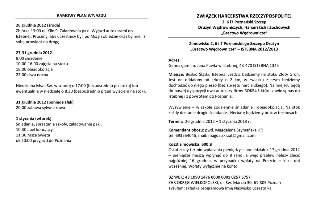 RAMOWY PLAN WYJAZDU 26 grudnia 2012 (środa) Zbiórka 13:00 ul. Klin 9. Załadownia paki. Wyjazd autokarami do Istebnej. Prosimy, aby uczestnicy byli po Mszy i obiedzie oraz by mieli z sobą prowiant na drogę. 27-31 grudnia 2012 8:00 śniadanie 10:00-16:00 zajęcia na stoku 18:00 obiadokolacja 22:00 cisza nocna Niedzielna Msza Św. w sobotę o 17:00 (bezpośrednio po stoku) lub ewentualnie w niedzielę o 8:30 (bezpośrednio przed wyjściem na stok). 31 grudnia 2012 (poniedziałek) 20:00 zabawa sylwestrowa 1 stycznia (wtorek) Śniadanie, sprzątanie szkoły, załadowanie paki. 10:30 apel kończący 11:30 Msza Święta ok 20:00 przyjazd do Poznania ZWIĄZEK HARCERSTWA RZECZYPOSPOLITEJ 2, 6 i7 Poznański Szczep Drużyn Wędrowniczych, Harcerskich i Zuchowych „Bractwo Wędrownicze” Zimowisko 2, 6 i 7 Poznańskiego Szczepu Drużyn „Bractwo Wędrownicze” – ISTEBNA 2012/2013 Adres: Gimnazjum im. Jana Pawła w Istebnej, 43-470 ISTEBNA 1345 Miejsce: Beskid Śląski, Istebna. Jeździć będziemy na stoku Złoty Groń. Jest on oddalony od szkoły o 2 km, w związku z czym będziemy dochodzić do niego pieszo (bez sprzętu narciarskiego). Na miejscu będą do naszej dyspozycji dwa autokary firmy ROKBUS które zawiozą nas do Istebnej i z powrotem do Poznania. Wyżywienie – w szkole codziennie śniadanie i obiadokolacja. Na stok każdy dostanie drugie śniadanie. Herbatę będziemy brać w termosach. Termin: 26 grudnia 2012 – 1 stycznia 2013 r. Komendant obozu: pwd. Magdalena Szymańska HR tel: 693554045, mail: [email protected] Koszt zimowiska: 600 zł Ostateczny termin wpłacania pieniędzy – poniedziałek 17 grudnia 2012 – pieniądze muszą wpłynąć do 8 rano, a więc przelew należy zlecić najpóźniej 16 grudnia, w przypadku wpłaty na Poczcie – kilka dni wcześniej. Wpłaty wyłącznie na konto BZ WBK: 43 1090 1476 0000 0001 0257 5757 ZHR OKRĘG WIELKOPOLSKI, ul. Św. Marcin 30, 61-805 Poznań Tytułem: składka programowa Imię Nazwisko uczestnika Nie przewidujemy zniżek dla rodzeństwa. Jednak wszystkie problemy finansowe, które uniemożliwiłyby wyjazd na zimowisko prosimy zgłaszać komendantce całości lub drużynowym; postaramy się pomóc i znaleźć dofinansowanie, o ile o takiej potrzebie dowiemy się szybko. Niestety w przypadku zimowiska nie ma możliwości „cięcia kosztów”. Cena zimowiska tworzą koszty przejazdów, karnetów na wyciągi, wyżywienia i noclegu. Ostateczny termin składania kart kwalifikacyjnych wraz z podpisanym regulaminem – 16 grudnia 2012. Jeśli karta nie będzie kompletnie wypełniona (dotyczy to zwłaszcza numerów pesel) oraz jeśli nie będzie dołączony podpisany regulamin, dziecko nie zostanie wpisane na listę uczestników. Karty zbiera Maria Maćkowiak. Maria Maćkowiak: telefon 663-872-518 Adres: Pozna, ul. Wojciecha Bąka 19, 60-194 (osiedle Poetów) Kartę należy wysłać lub przywieźć do dh Marysi do domu lub na dyżur w KIKu: 7 grudnia 18:00-18:40. Kartę można również dostarczyć komendantce, Magdalenie Szymańskiej, w poniedziałki 3 i 10 grudnia między godziną 15 a 20 pod adresem: ul. Jeleniogórska 1/3 blok H m.26 (kod do wjazdu na osiedle: kluczyk3801kluczyk) – Studio Wokalne Przestrzeń Głosu. SPIS EKWIPUNKU • • • • • • • • • • • • • • • • • • • • mundur harcerski ciepła kurtka, czapka, szalik, 2 pary rękawiczek w tym narciarskie 2 swetry i 2 koszule spodnie narciarskie, SPRZĘT narciarski / biegówkowy / snowboardowy KASK, gogle TERMOS mocne buty typu pionierki (porządnie wypastowane) obuwie sportowe + klapki (pantofle) kilka par skarpet bielizna 1 para spodni długich śpiwór, dres do spania, prześcieradło przybory do mycia (ręcznik, mydło, pasta i szczoteczka do mycia zębów, grzebień, chusteczki do nosa) 2 bandaże elastyczne latarka mały plecak busola, gwizdek, śpiewnik, dzienniczek harcerski maska oraz strój na Sylwestra zgodny z tematyka BAL MASKOWY WAŻNA LEGITYMACJA SZKOLNA Uwaga: • prosimy, aby dzieci pakowały się same, pod kontrolą rodziców, • w razie wątpliwości prosimy pytać drużynowych, • proszę nie brać rzeczy niewymienionych w spisie, • nie brać rzeczy kosztownych i dużych sum pieniędzy. • obowiązuje zakaz korzystania z telefonów komórkowych podczas trwania zimowiska;