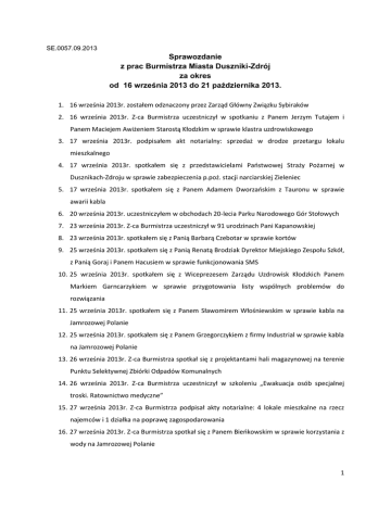 SE.0057.09.2013 Sprawozdanie z prac Burmistrza Miasta Duszniki-Zdrój za okres od 16 września 2013 do 21 października 2013. 1. 16 września 2013r. zostałem odznaczony przez Zarząd Główny Związku Sybiraków 2. 16 września 2013r. Z-ca Burmistrza uczestniczył w spotkaniu z Panem Jerzym Tutajem i Panem Maciejem Awiżeniem Starostą Kłodzkim w sprawie klastra uzdrowiskowego 3. 17 września 2013r. podpisałem akt notarialny: sprzedaż w drodze przetargu lokalu mieszkalnego 4. 17 września 2013r. spotkałem się z przedstawicielami Państwowej Straży Pożarnej w Dusznikach-Zdroju w sprawie zabezpieczenia p.poż. stacji narciarskiej Zieleniec 5. 17 września 2013r. spotkałem się z Panem Adamem Dworzańskim z Tauronu w sprawie awarii kabla 6. 20 września 2013r. uczestniczyłem w obchodach 20-lecia Parku Narodowego Gór Stołowych 7. 23 września 2013r. Z-ca Burmistrza uczestniczył w 91 urodzinach Pani Kapanowskiej 8. 23 września 2013r. spotkałem się z Panią Barbarą Czebotar w sprawie kortów 9. 25 września 2013r. spotkałem się z Panią Renatą Brodziak Dyrektor Miejskiego Zespołu Szkół, z Panią Goraj i Panem Hacusiem w sprawie funkcjonowania SMS 10. 25 września 2013r. spotkałem się z Wiceprezesem Zarządu Uzdrowisk Kłodzkich Panem Markiem Garncarzykiem w sprawie przygotowania listy wspólnych problemów do rozwiązania 11. 25 września 2013r. spotkałem się z Panem Sławomirem Włośniewskim w sprawie kabla na Jamrozowej Polanie 12. 25 września 2013r. spotkałem się z Panem Grzegorczykiem z firmy Industrial w sprawie kabla na Jamrozowej Polanie 13. 26 września 2013r. Z-ca Burmistrza spotkał się z projektantami hali magazynowej na terenie Punktu Selektywnej Zbiórki Odpadów Komunalnych 14. 26 września 2013r. Z-ca Burmistrza uczestniczył w szkoleniu „Ewakuacja osób specjalnej troski. Ratownictwo medyczne” 15. 27 września 2013r. Z-ca Burmistrza podpisał akty notarialne: 4 lokale mieszkalne na rzecz najemców i 1 działka na poprawę zagospodarowania 16. 27 września 2013r. Z-ca Burmistrza spotkał się z Panem Bieńkowskim w sprawie korzystania z wody na Jamrozowej Polanie 1 17. 30 września 2013r. Z-ca Burmistrza uczestniczył w uroczystym otwarciu XLIII Rajdu Górskiego WP „Sudety 2013” 18. 30 września 2013r. Z-ca Burmistrza uczestniczył w 90-tych urodzinach Pana Stefana Buc 19. 1.10.2013r. Sekretarz Gminy uczestniczył w konferencji „Zmieniamy się w trosce o pasażerów” – „Modernizacja regionalnej linii kolejowej nr 309 Kłodzko Nowe – Kudowa Zdrój, na odcinku Duszniki-Zdrój – Kudowa Zdrój” 20. 1.10.2013r. Z-ca Burmistrza spotkał się z Panem Kamińskim w sprawie budowy hydrantów przeciwpożarowych na Zieleńcu 21. 1.10.2013r. Z-ca Burmistrza uczestniczył w spotkaniu wspólnoty mieszkaniowej przy ul. Świerczewskiego 12 22. 3.10.2013r. Z-ca Burmistrza uczestniczył w spotkaniu w sprawie oczyszczalni ścieków 23. 3.10.2013r. Z-ca Burmistrza uczestniczył w spotkaniu z Ministrem Transportu, Budownictwa i Gospodarki Morskiej Panem Sławomirem Nowakiem w Starostwie Powiatowym w Kłodzku w sprawie obwodnicy Kłodzka 24. 8.10.2013r. Z-ca Burmistrza uczestniczył w 94-tych urodzinach Pani Heleny Mikuckiej 25. 8.10.2013r. Z-ca Burmistrza podpisał akt notarialny (działka w drodze przetargu) 26. 9.10.2013r. Z-ca Burmistrza spotkał się z Panem Grzegorzem Miedzińskim i Dyrektorem MOKiS w sprawie rajdu rowerowego 27. 9.10.2013r. Z-ca Burmistrza spotkał się z Zarządem Dróg Powiatowych w sprawie remontu drogi na Zieleniec 28. 10.10.2013r. Z-ca Burmistrza spotkał się z Panem Bieńkowskim w sprawie współudziału w gruntach na Jamrozowej Polanie 29. 10.10.2013r. Z-ca Burmistrza uczestniczył w spotkaniu w Starostwie Powiatowym w sprawie projektu PO KL „Kompleksowe wspomaganie rozwoju szkół w powiecie kłodzkim” 30. 11.10.2013r. Z-ca Burmistrza udzielił wywiadu dla Euroregionu Glacensis 31. 14.10.2013r. uczestniczyłem w spotkaniu w Muzeum Papiernictwa w sprawie wizyty Prezydenta RP 32. 14.10.2013r. zorganizowałem Dzień Edukacji Narodowej dla byłych i obecnych pracowników dusznickich szkół i placówek edukacyjnych 33. 15.10.2013r. udzieliłem wypowiedzi dla TVP Wrocław dla programu „Czas na pracę, praca na czasie” 34. 15.10.2013r. Z-ca Burmistrza podpisał akt notarialny (działka w drodze przetargu) 35. 15.10.2013r. uczestniczyłem w spotkaniu Stowarzyszenia Gmin Ziemi Kłodzkiej w sprawie funkcjonalnego obszaru inwestycyjnego [FOI] 36. 15.10.2013r. uczestniczyłem w uroczystej sesji Sejmiku Województwa Dolnośląskiego 2 Wydane zarządzenia: 1. Zarządzenie Nr 83/2013 z dnia 16 września 2013r. w sprawie podjęcia konsultacji społecznych projektu uchwały w sprawie programu Współpracy Gminy Miejskiej Duszniki-Zdrój z organizacjami pozarządowymi oraz innymi podmiotami prowadzącymi działalność pożytku publicznego 2. Zarządzenie Nr 84/2013 z dnia 16 września 2013r. w sprawie wprowadzenia założeń i wytycznych do projektu budżetu na 2014 rok 3. Zarządzenie Nr 85/2013 z dnia 18 września 2013r. w sprawie zatwierdzenia aneksu nr 1 do arkusza organizacji Miejskiego Zespołu Szkół w Dusznikach-Zdroju 4. Zarządzenie Nr 86/2013 z dnia 19 września 2013r. w sprawie zatwierdzenia aneksu nr 2 do arkusza organizacji Miejskiego Zespołu Szkół w Dusznikach-Zdroju 5. Zarządzenie Nr 87/2013 z dnia 23 września 2013r. w sprawie powołania komisji przetargowej do przeprowadzenia postępowania o udzielenie zamówienia publicznego na wykonanie zadania pn. „Sporządzenie miejscowego planu zagospodarowania przestrzennego gminy Miejskiej Duszniki-Zdrój” 6. Zarządzenie Nr 88/2013 z dnia 27 września 2013r. w sprawie zmian w planie dochodów i wydatków w budżecie w roku 2013 7. Zarządzenie Nr 89/2013 z dnia 1 października 2013r. w sprawie powołania komisji przetargowej do przeprowadzenia postępowania o udzielenie zamówienia publicznego na wykonanie zadania pn. „Zaprojektowanie i wykonanie podjazd