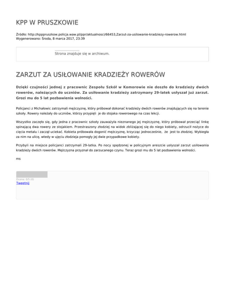 KPP W PRUSZKOWIE Źródło: http://kpppruszkow.policja.waw.pl/ppr/aktualnosci/66453,Zarzut-za-usilowanie-kradziezy-rowerow.html Wygenerowano: Środa, 8 marca 2017, 23:39 Strona znajduje się w archiwum. ZARZUT ZA USIŁOWANIE KRADZIEŻY ROWERÓW Dzięki czujności jednej z pracownic Zespołu Szkół w Komorowie nie doszło do kradzieży dwóch rowerów, należących do uczniów. Za usiłowanie kradzieży zatrzymany 29-latek usłyszał już zarzut. Grozi mu do 5 lat pozbawienia wolności. Policjanci z Michałowic zatrzymali mężczyznę, który próbował dokonać kradzieży dwóch rowerów znajdujących się na terenie szkoły. Rowery należały do uczniów, którzy przypięli je do stojaka rowerowego na czas lekcji. Wszystko zaczęło się, gdy jedna z pracownic szkoły zauważyła nieznanego jej mężczyznę, który próbował przeciąć linkę spinającą dwa rowery ze stojakiem. Przestraszony złodziej na widok zbliżającej się do niego kobiety, odrzucił nożyce do cięcia metalu i zaczął uciekać. Kobieta próbowała dogonić mężczyznę, krzycząc jednocześnie, że jest to złodziej. Wybiegła za nim na ulicę, wtedy w ujęciu złodzieja pomogły jej dwie przypadkowe kobiety. Przybyli na miejsce policjanci zatrzymali 29-latka. Po nocy spędzonej w policyjnym areszcie usłyszał zarzut usiłowania kradzieży dwóch rowerów. Mężczyzna przyznał do zarzucanego czynu. Teraz grozi mu do 5 lat pozbawienia wolności. ms Ocena: 0/5 (0) Tweetnij