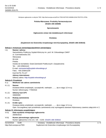 Dz.U./S S190 01/10/2016 340696-2016-PL - - Dostawy - Dodatkowe informacje - Procedura otwarta 1/3 Niniejsze ogłoszenie w witrynie TED: http://ted.europa.eu/udl?uri=TED:NOTICE:340696-2016:TEXT:PL:HTML Polska-Warszawa: Produkty farmaceutyczne 2016/S 190-340696 Sprostowanie Ogłoszenie zmian lub dodatkowych informacji Dostawy (Suplement do Dziennika Urzędowego Unii Europejskiej, 2016/S 186-333616) Sekcja I: Instytucja zamawiająca/podmiot zamawiający I.1) Nazwa i adresy Samodzielny Publiczny Szpital Kliniczny im. prof. W. Orłowskiego CMKP ul. Czerniakowska 231 Warszawa 00-416 Polska Osoba do kontaktów: Dział Zamówień Publicznych i Zaopatrzenia Tel.: +48 225841110 E-mail: [email protected] Faks: +48 225841109 Kod NUTS: PL127 Adresy internetowe: Główny adres: http://szpital-orlowskiego.pl Sekcja II: Przedmiot II.1) Wielkość lub zakres zamówienia II.1.1) Nazwa: Dostawa leków antybiotyki, szczepionki, narkotyki ……..itp w ciągu 12 m-cy. Numer referencyjny: 77/8/2016 II.1.2) Główny kod CPV 33600000 II.1.3) Rodzaj zamówienia Dostawy II.1.4) Krótki opis: Dostawa leków antybiotyki, szczepionki, narkotyki ……..itp w ciągu 12 m-cy Opis: Szczegółowy opis przedmiotu zamówienia oraz wymagania stawiane Wykonawcy zawiera załącznik nr 2. Sekcja VI: Informacje uzupełniające VI.5) Data wysłania niniejszego ogłoszenia: 29/09/2016 VI.6) Numer pierwotnego ogłoszenia Numer ogłoszenia w Dz.Urz. UE – OJ/S: 2016/S 186-333616 01/10/2016 S190 http://ted.europa.eu/TED - - Dostawy - Dodatkowe informacje - Procedura otwarta Suplement do Dziennika Urzędowego Unii Europejskiej 1/3 Dz.U./S S190 01/10/2016 340696-2016-PL - - Dostawy - Dodatkowe informacje - Procedura otwarta 2/3 Sekcja VII: Zmiany VII.1) Informacje do zmiany lub dodania VII.1.2) Tekst, który należy poprawić w pierwotnym ogłoszeniu Numer sekcji: II.2.1 Miejsce, w którym znajduje się tekst do modyfikacji: Pakiet 8 leki Zamiast: Opis zamówienia: Phytomenadione 150mcg x 30kaps. Phytomenadione 0,4mg x 30tabl. Powinno być: 1 Phytomenadione 150 mcg x 30 kaps. 2 Acidum folicum 0,4 mg x 30 tabl. Numer sekcji: IV.2.2 Zamiast: Data: 10/10/2016 Czas lokalny: 10:30 Powinno być: Data: 17/10/2016 Czas lokalny: 10:30 Numer sekcji: IV.2.7 Zamiast: Data: 10/10/2016 Czas lokalny: 11:00 Powinno być: Data: 17/10/2016 Czas lokalny: 11:00 Numer sekcji: VI.3 Zamiast: 9.1. Oferta musi być zabezpieczona wadium w wysokości: Dla zadania częściowego nr 2 200 PLN. Powinno być: 9.1. Oferta musi być zabezpieczona wadium w wysokości: Dla zadania częściowego nr 1 100 PLN. VII.2) Inne dodatkowe informacje: Zamawiający tworzy pakiet nr 15 Nazwa: Pakiet 15 leki Część nr: 15 Opis zamówienia: Macrogolum 4000. Opis: Szczegółowy opis przedmiotu zamówienia oraz wymagania stawiane Wykonawcy zawiera załącznik nr 2. Oferta musi być zabezpieczona wadium w wysokości: Dla zadania częściowego nr 15 01/10/2016 S190 http://ted.europa.eu/TED - - Dostawy - Dodatkowe informacje - Procedura otwarta Suplement do Dziennika Urzędowego Unii Europejskiej 2/3 Dz.U./S S190 01/10/2016 340696-2016-PL - - Dostawy - Dodatkowe informacje - Procedura otwarta 3/3 - - Dostawy - Dodatkowe informacje - Procedura otwarta Suplement do Dziennika Urzędowego Unii Europejskiej 3/3 100 PLN. 01/10/2016 S190 http://ted.europa.eu/TED