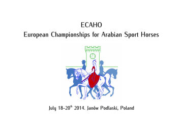 ECAHO European Championships for Arabian Sport Horses July 18-20th 2014. Janów Podlaski, Poland Class 1. Dressage (FEI Pony Riders Team Comp. 2012), C All Around 1. 49. Padrons Must (FR) Padrons Immage (US) - Bint Pustinia (US) / Padron (NL), chestnut, 2002-02-14 Tove Røy 66.538 % Manja Höhne 66.111 % Viktoria Palmaer 64.017 % Eva Palmaer 63.462 % Hanna Persson 62.222 % Alicja Poszepczyńska 62.094 % Kaja Dembińska 60.043 % Agnieszka Romszycka 58.504 % Joanna Suliga 57.607 % Agnieszka Oktabiańczuk 57.009 % breeder: Avalon Ranch, owner: Tove Røy, DK 2. 23. El Samalon (DE) El Nabila B (HU) - Sonoma Delight (US) / Nadom (SU), grey, 2002-06-01 breeder: Werner Scharf, owner: Manja Höhne, DE 3. 10. Bimaal (SE) LM Limaal (AT) - Bitcha (SE) / Kulak (DK), grey, 2001-04-20 breeder: OKS Arab, owner: Viktoria Palmaer, SE 4. 31. FLM Verdi (SE) The Verdict HG (US) - Tari Noir (DE) / Taladinn (US), black, 2006-06-13 breeder: Frida Lundqvist Mattsson, owner: Eva Palmaer, SE 5. 25. Elysion (SE) Premier - Emancypacja / Falsyfikat, chestnut, 2006-03-22 breeder: Kullatorp Arabian Stud, owner: Kullatorp Arabian Stud, SE 6. 32. Galahad Werbum - Granada / Monogramm (US), chestnut, 2003-03-24 breeder: Chrcynno-Palace Stud, owner: Chrcynno-Palace Stud, PL 7. 14. Echo Adonis Al Maraam (IL) - Echo Kallisto / Pamir, grey, 2007-04-06 breeder: Chrcynno-Palace Stud, owner: Chrcynno-Palace Stud, PL 8. 16. Edinet Włodarz - Ellila / Wachlarz, dark bay, 2005-02-14 breeder: Damis BT, owner: Agnieszka Romszycka, PL 9. 63. Wangelis Empres - Warta / Wermut, chestnut, 2002-06-10 breeder: Tomasz Tarczyński, owner: Marek Suliga, PL 10. 27. Encina Pesal - Epoza / Eukaliptus, grey, 2004-01-19 breeder: Janów Podlaski Stud, owner: Krzysztof Semeryło, PL Results provided by Lidia & Wiesław Pawłowski Page 1 Class 1. Dressage (FEI Pony Riders Team Comp. 2012), C All Around 11. 60. TA Gazal (DK) Gazal Al Shaqab (QA) - Jalima El Mokari (DK) / El Mokari (DE), grey, 2003-04-17 Carina Byrne 55.256 % Krzysztof Cyra 54.487 % Pia Holst 53.889 % Krzysztof Cyra 53.291 % Agnieszka Helbik-Kuśmierz 51.453 % Danuta Konończuk 46.581 % breeder: Taarup Arabians, owner: Taarup Arabians, DK 12. 38. Grafik Eukaliptus - Gaskonia / Probat (SE), grey, 1996-03-24 breeder: Michałów Stud, owner: Michałów Stud, PL 13. 64. Wansour (DK) El Mokari (DE) - Wera (DK) / Maysoun (DE), chestnut, 1999-07-04 breeder: PAJB Danmark, owner: Pia Holst, DK 14. 19. El Omari Enzo (US) - Embra / Monogramm (US), chestnut, 2008-04-17 breeder: Michałów Stud, owner: Michałów Stud, PL 15. 21. El-Jad Etogram - Elina (SE) / Etnograf, bay, 2003-03-13 breeder: Celina Helbik, owner: Celina Helbik, PL 16. 52. Perseusz Laheeb (IL) - Pepesza / Eukaliptus, grey, 2001-01-14 breeder: Janów Podlaski Stud, owner: Przemysław Sawicki, PL Results provided by Lidia & Wiesław Pawłowski Page 2 Class 2. Trail (GB level B, Deurne), W All Around 1. 7. Baikal's Shangrila (AT) Baikal (AT) - Desert Safanad (AT) / BR Black Flag (US), bay, 2006-05-05 Leona Dries 142.5 Barbara Kristen 140.0 Doris Pfann 139.5 Ute Dill 138.0 Karin Hillmaier 128.5 Marek Suliga 117.5 breeder: Petra Dries, owner: Petra Dries, AT 2. 6. Avellana Qahira (AT) LM Libretto (ES) - Shamal (AT) / Abha Harim (US), chestnut, 2002-04-03 breeder: Gestüt Al Qahira, owner: Layan Arabians, AT 3. 35. GFH Muscaya (AT) MHR Muscateal (US) - Manavka (NL) / Karon (NL), chestnut, 2007-04-24 breeder: Petra Dries, owner: Petra Dries, AT 4. 36. GH Khaaba (DE) Khalif El Assuad (DE) - Nhaaba (DE) / Nami (DE), black, 2003-03-24 breeder: Arabgestüt Hägerhof, owner: Arabgestüt Hägerhof, DE 5. 48. Muscateal's Sayyad (AT) MHR Muscateal (US) - Desert Safanad (AT) / BR Black Flag (US), dark bay, 2005-05-15 breeder: Petra Dries, owner: Karin Hillmaier, AT 6. 22. El Moro Etogram - Ekana / Wojsław, grey, 2005-02-13 breeder: M Arabians, owner: Marek Suliga, PL Results provided by Lidia & Wiesław Pawłowski Page 3 Class 3. Classic Pleasure (GB level C), C All Around 1. 25. Elysion (SE) Premier - Emancypacja / Falsyfikat, chestnut, 2006-03-22 Hanna Persson 70.56 % Manja Höhne 70.56 % Tove Røy 70.00 % Viktoria Palmaer 66.67 % Kaja Dembińska 66.11 % Amelia Kalinowska 65.56 % Agnieszka Kolek-Kowieska 63.89 % Eva Palmaer 63.33 % Ewelina Żołna 62.78 % Krzysztof Cyra 62.22 % breeder: Kullatorp Arabian Stud, owner: Kullatorp Arabian Stud, SE 2. 23. El Samalon (DE) El Nabila B (HU) - Sonoma Delight (US) / Nadom (SU), grey, 2002-06-01 breeder: Werner Scharf, owner: Manja Höhne, DE 3. 49. Padrons Must (FR) Padrons Immage (US) - Bint Pustinia (US) / Padron (NL), chestnut, 2002-02-14 breeder: Avalon Ranch, owner: Tove Røy, DK 4. 10. Bimaal (SE) LM Limaal (AT) - Bitcha (SE) / Kulak (DK), grey, 2001-04-20 breeder: OKS Arab, owner: Viktoria Palmaer, SE 5. 15. Echo Apollo Piaff - Echo Kallisto / Pamir, grey, 2006-03-24 breeder: Chrcynno-Palace Stud, owner: Kaja Dembińska, PL 6. 34. Gasler Eukariont - Gwiazdka / Harbin, bay, 2008-03-24 breeder: Krzysztof Jagielski, owner: Krzysztof Kozera, PL 7. 2. Alert Piaff - Andaluzja / Sanadik El Shaklan (DE), grey, 2005-03-22 breeder: Janów Podlaski Stud, owner: Janów Podlaski Stud, PL 8. 31. FLM Verdi (SE) The Verdict HG (US) - Tari Noir (DE) / Taladinn (US), black, 2006-06-13 breeder: Frida Lundqvist Mattsson, owner: Eva Palmaer, SE 9. 20. Elas Wachlarz - Elestora / Europejczyk, dark bay, 2000-03-22 breeder: Janów Podlaski Stud, owner: Czesław Lang, PL 10. 38. Grafik Eukaliptus - Gaskonia / Probat (SE), grey, 1996-03-24 breeder: Michałów Stud, owner: Michałów Stud, PL Results provided by Lidia & Wiesław Pawłowski Page 4 Class 3. Classic Pleasure (GB level C), C All Around 11. 45. Mandragora Gaspar - Martyna / Europejczyk, grey, 2007-05-28 Magda Kowaluk 62.22 % Agnieszka Romszycka 61.67 % Katarzyna Stawiska 60.56 % Carina Byrne 60.00 % Alicja Poszepczyńska 60.00 % Natalia Ciman 57.78 % Joanna Suliga 57.78 % Katarzyna Stawiska 57.22 % Agnieszka Helbik-Kuśmierz 56.67 % Zuzanna Makarewicz 55.00 % bree