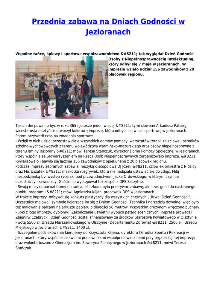 Przednia zabawa na Dniach Godności w Jezioranach Wspólne tańce, śpiewy i sportowe współzawodnictwo – tak wyglądał Dzień Godności Osoby z Niepełnosprawnością Intelektualną, który odbył się 7 maja w Jezioranach. W imprezie wzięło udział 156 zawodników z 20 placówek regionu. Takich dni powinno być w roku 365 i jeszcze jeden więcej – tymi słowami Arkadiusz Paturej, wicestarosta olsztyński otworzył kolorową imprezę, która odbyła się w sali sportowej w Jezioranach. Potem przyszedł czas na zmagania sportowe. - Wzięli w nich udział przedstawiciele wszystkich domów pomocy, warsztatów terapii zajęciowej, ośrodków szkolno-wychowawczych z terenu województwa warmińsko-mazurskiego oraz osoby niepełnosprawne z terenu gminy Jeziorany – mówi Teresa Stańczuk, dyrektor Domu Pomocy Społecznej w Jezioranach, który wspólnie ze Stowarzyszeniem na Rzecz Osób Niepełnosprawnych zorganizowało imprezę. – Rywalizowało i bawiło się łącznie 156 zawodników z opiekunami z 20 placówek regionu. Podczas imprezy zebranych zabawiał muzyką discopolową DJ Józek – człowiek orkiestra z Nidzicy oraz Miś Uszatek – maskotka rozgrywek, która nie nadążała ustawiać się do zdjęć. Miłą niespodzianką był występ rycerski pod przewodnictwem Jacka Ordowskiego, w którym czynnie uczestniczyli zawodnicy. Gościnnie występował też zespół z DPS Szczytno. - Swoją muzyką porwał tłumy do tańca, aż szkoda było przerywać zabawę, ale czas gonił do następnego punktu programu – mówi Agnieszka Kiljan, pracownik DPS w Jezioranach. W trakcie imprezy odbywał się konkurs plastyczny dla wszystkich chętnych „Utrwal Dzień Godności". Uczestnicy malowali symbole kojarzące im się z Dniem Godności. Technika i narzędzia dowolne, więc było też malowanie palcami na arkuszu papieru o długości 50 metrów. Wszystkim drużynom wręczono puchary, kubki z logo imprezy, dyplomy. Zakończenie uświetnił wybuch petard scenicznych. Imprezę prowadził Zbignirw Czabrycki. Dzień Godności został sfinansowany ze środków Starostwa Powiatowego w Olsztynie kwotą 5500 zł, Urzędu Marszałkowskiego w Olsztynie (Departamentu Zdrowia) – 2500 zł i Urzędu Miejskiego w Jezioranach – 1400 zł. - Szczególne podziękowania kierujemy do Krzysztofa Kiljana, dyrektora Ośrodka Sportu i Rekreacji w Jezioranach, który wspólnie ze swoimi pracownikami współpracował z nami przy organizacji tej imprezy; oraz wolontariuszom z Gimnazjum im. Seweryna Pieniężnego w Jezioranach – mówi Teresa Stańczuk. Drukuj