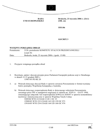 RADA UNII EUROPEJSKIEJ Bruksela, 23 stycznia 2006 r. (24.1) (OR. en) 5551/06 OJ/CRP2 3 WSTĘPNY PORZĄDEK OBRAD Posiedzenie: 2126. posiedzenie KOMITETU STAŁYCH PRZEDSTAWICIELI (część II) Data: Bruksela, środa, 25 stycznia 2006 r. (godz. 15:00) 1. Przyjęcie wstępnego porządku obrad I 2. Rezolucje, opinie i decyzje przyjęte przez Parlament Europejski podczas sesji w Strasburgu w dniach 12-15 grudnia 2005 r. 15987/05 PE-RE 20 3. a) Wniosek dotyczący decyzji Rady w sprawie zawarcia Porozumienia w formie wymiany listów pomiędzy Wspólnotą Europejską a Australią b) Wniosek dotyczący rozporządzenia Rady w dotyczącego wdrożenia Porozumienia zawartego przez WE w następstwie negocjacji w ramach art. XXIV.6 GATT 1994, zmieniającego załącznik I do rozporządzenia (EWG) nr 2658/87 w sprawie nomenklatury taryfowej i statystycznej oraz w sprawie Wspólnej Taryfy Celnej 5209/06 WTO 4 COASI 2 UD 1 OC 35 15909/05 WTO 233 COASI 163 UD 159 OC 973 15910/05 WTO 234 COASI 164 UD 160 OC 974 5551/06 zm/AKO/zm CAB 1 PL 4. Projekt programu szkoleń UE w zakresie EPBiO 5561/06 COSDP 25 PESC 57 CIVCOM 8 JAI 23 PROCIV 9 5571/06 COSDP 26 PESC 58 CIVCOM 9 JAI 24 PROCIV 10 5. Wspólne działanie Rady w sprawie mianowania Specjalnego Przedstawiciela Unii Europejskiej w Bośni i Hercegowinie 5112/06 PESC 4 COSDP 2 COWEB 5 OC 18 5338/06 PESC 35 COSDP 15 COWEB 11 OC 51 6. Wspólne stanowisko Rady odnawiające środki ograniczające skierowane przeciwko ekstremistom z Byłej Jugosłowiańskiej Republiki Macedonii (FYROM) i zmieniające wspólne stanowisko 2004/133/WPZiB 5247/06 PESC 22 COWEB 8 OC 40 RESTREINT UE + ADD 1 REV 2 RESTREINT UE 5507/06 PESC 53 COWEB 17 OC 71 7. Projekt wspólnego stanowiska Rady odnawiającego środki ograniczające skierowane przeciwko Republice Zimbabwe 5277/06 PESC 26 COAFR 4 COARM 2 OC 42 5386/06 PESC 43 COAFR 8 COARM 6 OC 65 8. Projekt decyzji Rady w sprawie zasad, priorytetów i warunków zawartych w Partnerstwie Europejskim z Albanią 5566/06 COWEB 18 15263/05 COWEB 215 9. Projekt decyzji Rady w sprawie zasad, priorytetów i warunków zawartych w Partnerstwie Europejskim z Bośnią i Hercegowiną 5568/06 COWEB 19 15267/05 COWEB 216 10. Projekt decyzji Rady w sprawie zasad, priorytetów i warunków zawartych w Partnerstwie Europejskim z Byłą Jugosłowiańską Republiką Macedonii 5569/06 COWEB 20 15288/05 COWEB 222 11. Projekt decyzji Rady z w sprawie zasad, priorytetów i warunków zawartych w Partnerstwie Europejskim z Serbią i Czarnogórą w tym z Kosowem zgodnie z jego statusem ustanowionym przez rezolucję nr 1244 Rady Bezpieczeństwa Narodów Zjednoczonych z 10 czerwca 1999 r. 5570/06 COWEB 21 15283/05 COWEB 221 5551/06 zm/AKO/zm CAB 2 PL 12. Przejrzystość a) Wykaz publicznych debat Rady podczas prezydencji Austrii 5363/1/06 REV 1 INF 2 b) Wykaz obrad jawnych Rady nad aktami prawodawczymi przyjętymi zgodnie zgodnie z procedurą współdecyzji podczas prezydencji Austrii 5364/06 INF 3 13. Rozporządzenie Rady w sprawie szczególnych działań w dziedzinie rolnictwa na rzecz regionów peryferyjnych Unii Europejskiej Przyjęcie (AP + O) 5410/06 AGRI 5 AGRIFIN 4 POSEICAN 1 POSEIDOM 1 POSEIMA 1 OC 66 + ADD 1 15367/05 AGRI 333 AGRIFIN 104 POSEICAN 8 POSEIDOM 8 POSEIMA 8 OC 930 14. Sprawozdanie na temat prac w innych składach Rady 5466/06 POLGEN 2 15. Zalecenie dla Rady dotyczące stosowania urządzeń kryptograficznych w celu zabezpieczenia łączy elektronicznych między UE a kwaterami głównymi operacji (KGO) oraz systemem BICES 5023/1/06 CSC 3 REV 1 16. Stowarzyszenie z Bułgarią Określenie stanowiska Unii Europejskiej na jedenaste posiedzenie Rady Stowarzyszeniowej(Bruksela, 31 stycznia 2006 r.) 5508/06 PECOS 3 17. Projekt decyzji Wspólnego Komitetu EOG zmieniającej załącznik VI (zabezpieczenia społeczne) do Porozumienia EOG 5173/06 EEE 2 SOC 10 N 2 OC 28 18. Projekt decyzji Wspólnego Komitetu EOG zmieniającej protokół 31 do Porozumienia EOG w sprawie współpracy w szczególnych dziedzinach poza zakresem czterech swobód (małe i średnie przedsiębiorstwa - MŚP) 5282/06 EEE 5 ECO 5 FISC 9 FIN 10 MI 6 N 5 ISL 2 FL 2 OC 43 19. Projekt decyzji Wspólnego Komitetu EOG zmieniającej protokół 31 do Porozumienia EOG w sprawie współpracy w szczególnych dziedzinach poza zakresem czterech swobód (Transeuropejskie sieci telekomunikacyjne) 15923/05 EEE 65 TELECOM 145 N 65 ISL 58 FL 52 OC 977 5551/06 zm/AKO/zm CAB 3 PL II 20. Dalsze działania po posiedzeniu Rady (sprawy gospodarcze i finansowe) w dniu 24 stycznia 2006 r. 21. Przedstawienie porządku obrad posiedzenia Rady (sprawy gospodarcze i finansowe), w dniu 14 lutego 2006 r. 22. Przygotowanie posiedzenia Rady (sprawy ogólne i stosunki zewnętrzne) w dniach 30 i 31 stycznia 2006 r. A. Sprawy ogólne Strategia lizbońska: Roczne sprawozdanie Komisji z postępu prac B. Stosunki zewnętrzne Stosunki z Bałkanami Zachodnimi - Białoruś - Proces pokojowy na Bliskim Wschodzie - Iran - Irak - Afganistan - Forum Azja-Europa (ASEM) 5575/06 COASI 12 ASIE 4 - - inne zagadnienia związane z posiedzeniem Rady RESTREINT UE Inne zagadnienia związane z posiedzeniem Rady WTO/Agenda Rozwoju z Doha Ameryka Łacińska Sprawy różne IIA: sprawozdanie dotyczące rozmów trójstronnych z dnia 23 stycznia 2006 r. _____________________ 5551/06 zm/AKO/zm CAB 4 PL