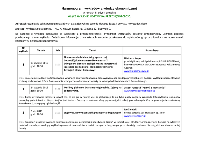 Harmonogram wykładów z wiedzy ekonomicznej w ramach III edycji projektu WŁĄCZ MYŚLENIE. POSTAW NA PRZEDSIĘBIORCZOŚĆ. Adresaci: uczniowie szkół ponadgimnazjalnych działających na terenie Nowego Sącza i powiatu nowosądeckiego Miejsce: Wyższa Szkoła Biznesu – NLU w Nowym Sączu, ul. Zielona 27, budynek C. Do każdego z wykładu planowane są warsztaty z przedsiębiorczości. Przedmiot warsztatów zostanie przedstawiony uczniom podczas powiązanego z nim wykładu. Dodatkowo informacja o warsztatach zostanie przekazana do opiekunów grup uczniowskich na adres e-mail zgłoszony w deklaracji uczestnictwa. Nr wykładu 1 Termin 10 stycznia 2015 godz. 10.30 Sala 010C Temat Finansowanie działalności gospodarczej. Co zrobić jak nie mam środków na start? Dźwignie w Biznesie, czyli jak można inwestować i zarabiać bez kapitału i zdolności kredytowej Czym jest alfabet finansowy? Prowadzący Wojciech Krupa przedsiębiorca, założyciel fundacji KLUB BIZNESOWY, firmy HARMONICA STUDIO oraz Agencji Reklamowej Apeiron www.klubbiznesowy.pl Opis: Znalezienie środków na finansowanie własnego pomysłu stanowi nie lada wyzwanie dla każdego przedsiębiorcy. Podczas wykładu zaprezentowane zostaną podstawowe źródła finansowania wzbogacone o komentarz oparty na własnych doświadczeniach Prowadzącego. 2 24 stycznia 2015 godz. 10.30 010C Myślimy globalnie. Działamy też globalnie. Żyjemy na Zespół Fundacji "Pomyśl o Przyszłości" Sądecczyźnie. www.pomysloprzyszlosci.org Opis: Każdy użytkownik Internetu (nawet ten, co nie gra w Rust'a) wie, że globalizacja to nie tylko pusty slogan w Wikipedii. Intensyfikacja stosunków pomiędzy podmiotami z różnych krajów jest faktem. Dotyczy to zarówno sfery prywatnej jak i relacji gospodarczych. Czy na pewno jesteś świadomy konsekwencji jakie płyną z globalizacji? 3 7 luty 2015 godz. 10.30 010C Logistyka. Nowy Sącz Mekką transportu drogowego? Jan Załubski Prezes Zarządu ZET Transport Sp. z o.o. www.zettransport.pl Opis: Transport drogowy wymaga dobrego planowania, organizacji i koordynacji działań w ramach całej struktury organizacyjnej. Bazując na własnych doświadczeniach prowadzący wykład wprowadzi uczestników w świat transportu drogowego, przedstawiając zarówno historię jak i współczesność tej branży. 010C 4 Ludzie w firmach Część I: Jak szukać pracy - rekrutacja okiem pracodawcy Marcin Gródek właściciel firmy BetaSI www.betasi.com Ludzie w firmach Część II: Motywowanie Wiesław Pióro Członek Zarządu firmy WIŚNIOWSKI, www.wisniowski.pl Członek Zarządu Powiatu Nowosądeckiego 7 marca 2015 godz. 10.30 010C Opis: W I części wykładu przedstawione zostanie spojrzenie na rynek pracy w regionie oczami przedsiębiorcy z grupy MŚP. Poruszony zostanie temat problemów bezrobotnych ze znalezieniem pracy oraz pracodawców ze znalezieniem pracowników. Omówione zostaną najczęstsze błędy popełniane przez potencjalnych pracowników. Podczas zajęć zostanie przedstawiony subiektywny poradnik pracodawcy dla osób szukających pracy. Część II wykładu zostanie poświęcona relacjom przedsiębiorcy - pracownicy. Szczególna uwaga zostanie poświęcona kwestiom motywowania do pracy. 5 21 marca 2015 godz. 10.30 010C Openminder. Czy boimy się myśleć? dr Michał Jasieński prof. Wyższej Szkoły Biznesu–NLU w Nowym Sączu www.inko.wsb-nlu.edu.pl, http://bmireinvent.com/t Opis: Czy kreatywności można się nauczyć? Pomimo tego, że nie rozumiemy mechanizmów sterujących kreatywnością młodej pisarki Doroty Masłowskiej lub starszego kompozytora Krzysztofa Pendereckiego, wierzymy, że istnieją sposoby, żeby “otworzyć klapki” w głowie. Niestety, nasze szkoły (od podstawowych do wyższych) nie mogą łatwo przełknąć pigułki rozluźniającej myślenie i zachęcającej uczniów do tworzenia; zamiast tego, programy edukacyjne są przywiązane do zapamiętywanych przez uczniów faktów i terminologii. Wszystko, czego nie da się zapamiętać i wyrecytować przy tablicy, jest podejrzane, a to oznacza, że każda okazja uczenia się o nowatorskim myśleniu jest cenna, nawet jeżeli przychodzi później niż w przedszkolu. Na przykład, na jednym z wykładów cyklu "Włącz myślenie. Postaw na przedsiębiorczość.”. * Harmonogram może ulec zmianie. Organizatorzy projektu: Urząd Miasta Nowego Sącza Starostwo Powiatowe w Nowym Sączu Sądecka Izba Gospodarcza Wyższa Szkoła Biznesu – NLU w Nowym Sączu Fundacja „Pomyśl o Przyszłości” Stowarzyszenie na Rzecz Integracji Środowisk Akademickich „ORION” w Nowym Sączu Więcej informacji na www.nowysacz.pl/wlacz-myslenie