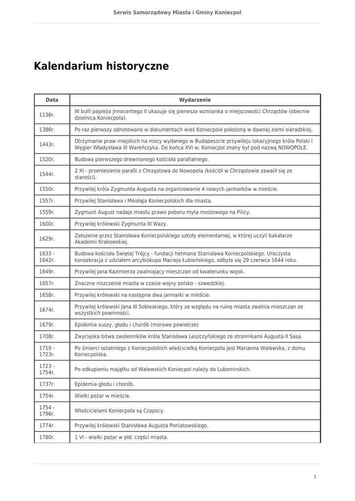 Serwis Samorządowy Miasta i Gminy Koniecpol Kalendarium historyczne Data Wydarzenie 1136r. W bulli papieża Jnnocentego II ukazuje się pierwsza wzmianka o miejscowości Chrząstów (obecnie dzielnica Koniecpola). 1386r. Po raz pierwszy odnotowano w dokumentach wieś Koniecpole położoną w dawnej ziemi sieradzkiej. 1443r. Otrzymanie praw miejskich na mocy wydanego w Budapeszcie przywileju lokacyjnego króla Polski i Węgier Władysława III Wareńczyka. Do końca XVI w. Koniecpol znany był pod nazwą NOWOPOLE. 1520r. Budowa pierwszego drewnianego kościoła parafialnego. 1544r. 2 XI - przeniesienie parafii z Chrząstowa do Nowopola (kościół w Chrząstowie zawalił się ze starości). 1550r. Przywilej króla Zygmunta Augusta na organizowanie 4 nowych jarmarków w mieście. 1557r. Przywilej Stanisława i Mikołąja Koniecpolskich dla miasta. 1559r. Zygmunt August nadaje miastu prawo poboru myta mostowego na Pilicy. 1600r. Przywilej królewski Zygmunta III Wazy. 1629r. Założenie przez Stanisława Koniecpolskiego szkoły elementarnej, w której uczyli bakałarze Akademii Krakowskiej. 1633 1642r. Budowa kościoła Świętej Trójcy - fundacji hetmana Stanisława Koniecpolskiego. Uroczysta konsekracja z udziałem arcybiskupa Macieja Łubieńskiego, odbyła się 29 czerwca 1644 roku. 1649r. Przywilej Jana Kazimierza zwalniający mieszczan od kwaterunku wojsk. 1657r. Znaczne niszczenie miasta w czasie wojny polsko - szwedzkiej. 1658r. Przywilej królewski na następne dwa jarmarki w mieście. 1674r. Przywilej królewski Jana III Sobieskiego, który ze względu na ruinę miasta zwalnia mieszczan ze wszystkich powinności. 1679r. Epidemia suszy, głodu i chorób (morowe powietrze) 1708r. Zwycięska bitwa zwolenników króla Stanisława Leszczyńskiego ze stronnikami Augusta II Sasa. 1719 1723r. Po śmierci ostatniego z Koniecpolskich właścicielką Koniecpola jest Marianna Walewska, z domu Koniecpolska. 1723 1754r. Po odkupieniu majątku od Walewskich Koniecpol należy do Lubomirskich. 1737r. Epidemia głodu i chorób. 1754r. Wielki pożar w mieście. 1754 1796r. Właścicielami Koniecpola są Czapscy. 1774r. Przywilej królewski Stanisława Augusta Poniatowskiego. 1780r. 1 VI - wielki pożar w płd. części miasta. 1 Serwis Samorządowy Miasta i Gminy Koniecpol 1793r. Po II rozbiorze Polski, Koniecpol znalazł się w zaborze pruskim. 1794r. 5 VI - przechodzące oddziały pruskie obrabowały Koniecpol i okoliczne wioski. 1795r. Po III rozbiorze Chrząstów włączono do zaboru austriackiego. Granicę między zaborami stanowiła Pilica. Tzw. "Komora" to pozostałość po komorach celnych. 1796 1945r. Koniecpol znajduje się w rękach Potockich. 1828r. W mieście były 143 domy, w tym 41 murowanych oraz 1556 mieszkańców, w tym 1066 Polaków i 490 Żydów. 1828r. Budowa kaplicy grobowej p.w. św. Izydora fundacji Janiny Potockiej. 1833r. Uruchomiono pierwszą w Królestwie Polskim pudlingarnię (zakład oczyszczania surówki). 1834 1879r. Przy zbiegu dzisiejszych ulic Kościelnej, Partyzantów i Chrząstowskiej działał szpital miejski pod wezwaniem św. Joanny, w którym leczyli się powstańcy 1863r. 1841r. C. K. Norwid namalował portret konny hetmana Koniecpolskiego znajdujący się obecnie w kościele św. Trójcy. 1863r. Udział oddziałów Oksińskiego i Chmieleńskiego w bitwach powstańczych na terenie Koniecpola i okolic. 1866r. Miasto liczy 1893 mieszkańców. 1870r. Zniesienie praw miejskich, przemianowanie na osadę. 1879r. Pożar w płd. wsch. części miasta, spłonął m.in. szpital p.w. św. Joanny. 1822r. Dokonano poważnej regulacji założenia miejskiego, wymieniając jednocześnie zabudowę drewnianą na budowle z cegły i kamienia. 1904 1911r. Wybudowanie linii kolejowej Kielce - Koniecpol - Częstochowa. 1927r. Koniecpol odzyskał prawa miejskie. Pierwszym burmistrzem reaktywowanego miasta został Władysław Sikorski. 1932r. Powstała w mieście Szkoła Podstawowa. 1939r. 3 IX - do miasta wkroczyły oddziały niemieckie. 1939 1945r. W czasie okupacji zginęło ok. 50% mieszkańców. 1942r. 5 X - Niemcy wywieźli z Koniecpola do obozu zagłady w Treblince całą liczącą ok. 1000 osób ludność żydowską i tam wymordowali. 1945r. 16 I - Wyzwolenie Koniecpola i okolic. 1945r. 1 IX - Otwarto Gimnazjum Koedukacyjne, istniało do 1957r. 1947r. Utworzono w mieście Bibliotekę Publiczną. 1947r. 1 IX - Uruchomiono średnie Studium Handlowe, w 1950r. zamienione na Zasadniczą Szkołę Metalową. 1948r. Utworzono Gminną Spółdzielnię "Samopomoc Chłopska". 1953r. 22 VII - Uruchomiono Koniecpolskie Zakłady Płyt Pilśniowych - duży zakład wykorzystujący drewno odpadowe. 2 Serwis Samorządowy Miasta i Gminy Koniecpol 1956 1959r. Odbudowa Zamku Koniecpolskich (obecnie siedziba Ośrodka Kultury, Sportu i Rekreacji) 1957r. 1 IX - rozpoczęło działalność Liceum Ogólnokształcące. 1960r. Rozporządzenie Rady Ministrów z grudnia 1959r. połączono Chrząstów z Koniecpolem oraz wyłączono powiększone miasto z powiatu radomszczańskiego w woj. łódzkim i przyłączono do powiatu włoszczowskeigo w woj. kieleckim. 1961r. Powstała Spółdzielnia Pracy Wyrobów Metalowych i Różnych "Zryw". 1963 1964r. Budowa kąpieliska. 1965 1968r. Budowa stadionu sportowego. 1967r. Oddano do użytku Szkołą Podstawową nr.1 tzw. Tysiąclatkę. 1970 1973r. Budowa oczyszczalni ścieków przemysłowych. 1971r. 28 XII - oddano do eksploatacji linię kolejową Kozłów - Koniecpol. 1973r. 1 I - uchwałą Woj. Rady Narodowej w Kielcach z dnia 8 XII 1972r. utworzono gminę Koniecpol. 1973r. Uruchomiono Zakłady Remontowo - Montażowe, utworzono Bank Spółdzielczy. 1973 1974r. Elektryfikacja linii kolejowej. 1974r. Oddano do użytku Miejską Przychodnię Rejonową. 1975r. Powstała Spółdzielnia Kółek Rolniczych. 1975r. 1 VI - w wyniku zmian terytorialnych w kraju, Koniecpol wszedł w skład nowego województwa częstochowskiego. 1976r. 1 IX - otworzono 4 - letnie Liceum Rolnic