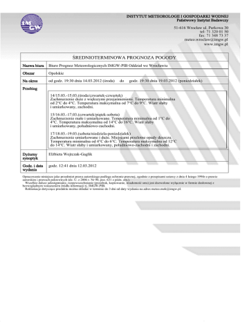 INSTYTUT METEOROLOGII I GOSPODARKI WODNEJ Państwowy Instytut Badawczy 51-616 Wrocław ul. Parkowa 30 tel: 71 320 01 50 fax: 71 348 73 37 [email protected] www.imgw.pl ŚREDNIOTERMINOWA PROGNOZA POGODY Nazwa biura Biuro Prognoz Meteorologicznych IMGW-PIB Oddział we Wrocławiu Obszar Opolskie Na okres od godz. 19:30 dnia 14.03.2012 (środa) do godz. 19:30 dnia 19.03.2012 (poniedziałek) Przebieg 14/15.03.-15.03.(środa/czwartek-czwartek) Zachmurzenie duże z większymi przejaśnieniami. Temperatura minimalna od 2°C do 4°C. Temperatura maksymalna od 7°C do 9°C. Wiatr słaby i umiarkowany, zachodni. 15/16.03.-17.03.(czwartek/piątek-sobota) Zachmurzenie małe i umiarkowane. Temperatura minimalna od 1°C do 4°C. Temperatura maksymalna od 14°C do 16°C. Wiatr słaby i umiarkowany, południowo-zachodni. 17/18.03.-19.03.(sobota/niedziela-poniedziałek) Zachmurzenie umiarkowane i duże. Miejscami przelotne opady deszczu. Temperatura minimalna od 4°C do 6°C. Temperatura maksymalna od 12°C do 14°C. Wiatr słaby i umiarkowany, południowo-zachodni i zachodni. Dyżurny synoptyk Elżbieta Wojtczak-Gaglik Godz. i data wydania godz. 12:41 dnia 12.03.2012 Opracowanie niniejsze jako przedmiot prawa autorskiego podlega ochronie prawnej, zgodnie z przepisami ustawy z dnia 4 lutego 1994r o prawie autorskim i prawach pokrewnych (dz. U. z 2006 r. Nr 90, poz. 631 z późn. zm.). Wszelkie dalsze udostępnianie, rozpowszechnianie (przedruk, kopiowanie, wiadomość sms) jest dozwolone wyłącznie w formie dosłownej z bezwzględnym wskazaniem źródła informacji tj. IMGW-PIB. Reklamacje dotyczące produktu można składać w terminie do 3 dni od daty wydania na adres [email protected].