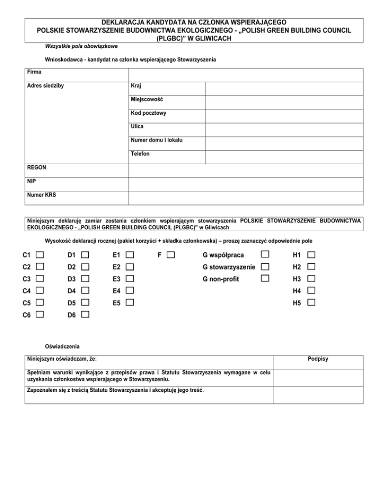 DEKLARACJA KANDYDATA NA CZŁONKA WSPIERAJĄCEGO POLSKIE STOWARZYSZENIE BUDOWNICTWA EKOLOGICZNEGO - „POLISH GREEN BUILDING COUNCIL (PLGBC)” W GLIWICACH Wszystkie pola obowiązkowe Wnioskodawca - kandydat na członka wspierającego Stowarzyszenia Firma Adres siedziby Kraj Miejscowość Kod pocztowy Ulica Numer domu i lokalu Telefon REGON NIP Numer KRS Niniejszym deklaruję zamiar zostania członkiem wspierającym stowarzyszenia POLSKIE STOWARZYSZENIE BUDOWNICTWA EKOLOGICZNEGO - „POLISH GREEN BUILDING COUNCIL (PLGBC)” w Gliwicach Wysokość deklaracji rocznej (pakiet korzyści + składka członkowska) – proszę zaznaczyć odpowiednie pole C1 D1 E1 C2 D2 C3 F G współpraca H1 E2 G stowarzyszenie H2 D3 E3 G non-profit H3 C4 D4 E4 H4 C5 D5 E5 H5 C6 D6 Oświadczenia Niniejszym oświadczam, że: Spełniam warunki wynikające z przepisów prawa i Statutu Stowarzyszenia wymagane w celu uzyskania członkostwa wspierającego w Stowarzyszeniu. Zapoznałem się z treścią Statutu Stowarzyszenia i akceptuję jego treść. Podpisy Wyrażam zgodę na przetwarzanie danych osobowych poniższych pracowników firmy (nazwa firmy) _______________________________________________________________________: Imię i nazwisko Adres e-mail przez Polskie Stowarzyszenie Budownictwa Ekologicznego Polish Green Building Council PLGBC z siedzibą w Gliwicach, 44-100, ul. Konarskiego 18C/2-11A, w celu korzystania z prowadzonej przez PLGBC usługi Newslettera oraz innych treści o charakterze reklamowym i informacyjnym. Niniejszym oświadczam, iż posiadam dostęp do treści tych danych osobowych i możliwości ich zmiany. Jednocześnie jestem świadom/świadoma, iż niniejsza zgoda na przetwarzanie danych osobowych może być w każdym czasie odwołana, co będzie równoznaczne z usunięciem ww. adresów e-mail z listy mailingowej usługi Newslettera oraz innych treści o charakterze reklamowym i informacyjnym. Wnoszę o doręczanie wszelkiej korespondencji na adres poczty elektronicznej: Poparcie dwóch członków Stowarzyszenia Członek Stowarzyszenia Data Podpis wnioskodawcy potwierdzający fakt złożenia wniosku Podpis członka Stowarzyszenia potwierdzający udzielenie poparcia kandydaturze Kandydata Miejscowość Imię i nazwisko Podpis