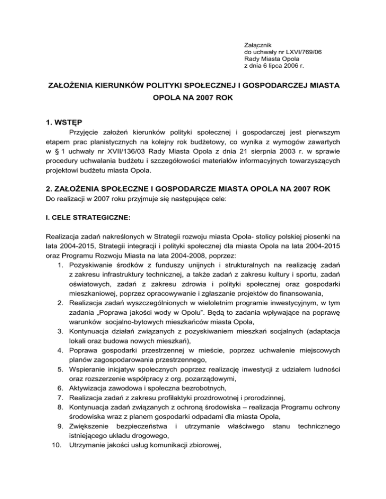Załącznik do uchwały nr LXVI/769/06 Rady Miasta Opola z dnia 6 lipca 2006 r. ZAŁOśENIA KIERUNKÓW POLITYKI SPOŁECZNEJ I GOSPODARCZEJ MIASTA OPOLA NA 2007 ROK 1. WSTĘP Przyjęcie załoŜeń kierunków polityki społecznej i gospodarczej jest pierwszym etapem prac planistycznych na kolejny rok budŜetowy, co wynika z wymogów zawartych w § 1 uchwały nr XVII/136/03 Rady Miasta Opola z dnia 21 sierpnia 2003 r. w sprawie procedury uchwalania budŜetu i szczegółowości materiałów informacyjnych towarzyszących projektowi budŜetu miasta Opola. 2. ZAŁOśENIA SPOŁECZNE I GOSPODARCZE MIASTA OPOLA NA 2007 ROK Do realizacji w 2007 roku przyjmuje się następujące cele: I. CELE STRATEGICZNE: Realizacja zadań nakreślonych w Strategii rozwoju miasta Opola- stolicy polskiej piosenki na lata 2004-2015, Strategii integracji i polityki społecznej dla miasta Opola na lata 2004-2015 oraz Programu Rozwoju Miasta na lata 2004-2008, poprzez: 1. Pozyskiwanie środków z funduszy unijnych i strukturalnych na realizację zadań z zakresu infrastruktury technicznej, a takŜe zadań z zakresu kultury i sportu, zadań oświatowych, zadań z zakresu zdrowia i polityki społecznej oraz gospodarki mieszkaniowej, poprzez opracowywanie i zgłaszanie projektów do finansowania, 2. Realizacja zadań wyszczególnionych w wieloletnim programie inwestycyjnym, w tym zadania „Poprawa jakości wody w Opolu”. Będą to zadania wpływające na poprawę warunków socjalno-bytowych mieszkańców miasta Opola, 3. Kontynuacja działań związanych z pozyskiwaniem mieszkań socjalnych (adaptacja lokali oraz budowa nowych mieszkań), 4. Poprawa gospodarki przestrzennej w mieście, poprzez uchwalenie miejscowych planów zagospodarowania przestrzennego, 5. Wspieranie inicjatyw społecznych poprzez realizację inwestycji z udziałem ludności oraz rozszerzenie współpracy z org. pozarządowymi, 6. Aktywizacja zawodowa i społeczna bezrobotnych, 7. Realizacja zadań z zakresu profilaktyki prozdrowotnej i prorodzinnej, 8. Kontynuacja zadań związanych z ochroną środowiska – realizacja Programu ochrony środowiska wraz z planem gospodarki odpadami dla miasta Opola, 9. Zwiększenie bezpieczeństwa i utrzymanie właściwego stanu technicznego istniejącego układu drogowego, 10. Utrzymanie jakości usług komunikacji zbiorowej, 11. 12. 13. 14. Realizacja zadań z zakresu kultury i sportu na poziomie wydatków 2006 roku, Realizowanie zadań wynikających z ustawy o systemie oświaty, Kontynuacja zadań związanych z usprawnieniem funkcjonowania Urzędu Miasta, Poszukiwanie inwestorów w obszarze gospodarki, turystyki i usług. Realizacja powyŜszych celów strategicznych wymagać będzie osiągnięcia następujących celów szczegółowych: SFERA INWESTYCYJNA – ROZWÓJ MIASTA A. TRANSPORT I ŁĄCZNOŚĆ Kontynuacja przebudowy układu komunikacyjnego miasta, w tym: I. Realizacja zadań ujętych w uchwalonym „Wieloletnim programie inwestycyjnym na lata 2004-2007” tj.: a) przebudowa wiaduktu i układu komunikacyjnego oraz remont wiaduktu Ŝelbetowego w ciągu ul. Reymonta w Opolu, II. Podjęcie nowych zadań w ramach moŜliwości finansowych miasta w zakresie remontów oraz przebudowy ulic, placów i skrzyŜowań. B. GOSPODARKA MIESZKANIOWA Realizacja zadań w zakresie zarządzania mieniem komunalnym: Kontynuacja budowy mieszkań socjalnych i adaptacja istniejących zasobów mieszkaniowych na mieszkania socjalne. C. ADMINISTRACJA PUBLICZNA Kontynuowanie zadania ujętego w uchwalonym „Wieloletnim programie inwestycyjnym na lata 2004-2007”: a) Zakup i wdroŜenie zintegrowanego systemu zarządzania miastem – etap I system finansowo-księgowy, planowanie i obsługa budŜetu, pełna obsługa podatków oraz ewidencja. D. OŚWIATA I WYCHOWANIE Realizacja zadania ujętego w uchwalonym „Wieloletnim programie inwestycyjnym na lata 2004-2007” tj.: a) kontynuacja termomodernizacji obiektów oświatowych. E. GOSPODARKA KOMUNALNA i OCHRONA ŚRODOWISKA I. Realizacja zadań ujętych w uchwalonym „Wieloletnim programie inwestycyjnym na lata 2004-2007”, tj.: 2 a) uzbrojenie terenów w rejonie ulicy Lwowskiej (zadanie planowane do realizacji w ramach obligacji komunalnych), b) uzbrojenie terenów w rejonie ulicy Arki BoŜka w Opolu. II. Kontynuowanie zadań realizowanych w 2006 r.: Budowa i modernizacja: dróg, sieci kanalizacyjnej, wodociągowej i gazowej bezpośrednio oraz z udziałem ludności, celem poprawy warunków Ŝycia mieszkańców, w tym z zadań ujętych w „Wieloletnim programie inwestycyjnym na lata 2004-2007”: a) realizacja budowy kanalizacji sanitarnej w ramach programu ISPA „POPRAWA JAKOŚCI WODY W OPOLU” z udziałem Funduszu Spójności, b) uzbrojenie terenów w rejonie obwodnicy północnej - ulicy Północnej w Opolu. III. Podjęcie nowych zadań w ramach moŜliwości finansowych miasta w zakresie branŜy wod.- kan. i oświetlenia (budowy niezbędnej kanalizacji deszczowej i sanitarnej oraz przebudowy istniejącego oświetlenia na ulicach miasta). F. KULTURA I OCHRONA DZIEDZICTWA NARODOWEGO Realizacja zadań ujętych w uchwalonym „Wieloletnim programie inwestycyjnym na lata 2004-2007” tj.: a) budowa budynku zaplecza technicznego z salą prób Opolskiego Teatru Lalki i Aktora im. A. Smolki w Opolu, wraz z rozbiórką istniejącego budynku zaplecza technicznego w Opolu, b) utworzenie Narodowego Centrum Polskiej Piosenki w Opolu. G. KULTURA FIZYCZNA I SPORT a) przebudowa hali sportowej „Okrąglak”, b) przebudowa stadionu miejskiego przy ul.Oleskiej. H. OCHRONA ŚRODOWISKA a) dalsza rozbudowa Ogrodu Zoologicznego, b) urządzanie nowych terenów zielonych. PowyŜsza lista wskazuje na zadania inwestycyjne zawarte w WPI i uznane za strategiczne oraz o istotnym znaczeniu dla miasta Opola. W trakcie prac nad budŜetem miasta Opola na 2007 r. w miarę posiadanych środków, wykaz ten moŜe zostać uzupełniony o zadania uznane za waŜne, związane głównie z budową infrastruktury technicznej.