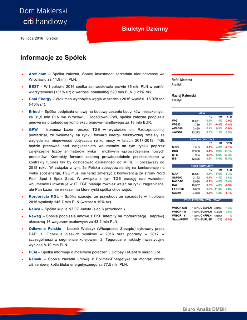 Biuletyn Dzienny 18 lipca 2016 | 6 stron Informacje ze Spółek Archicom – Spółka zależna, Space Investment sprzedała nieruchomość we Wrocławiu za 11.9 mln PLN. BEST – W I połowie 2016 spółka zainwestowała prawie 85 mln PLN w portfel wierzytelności (+31% r/r) o wartości nominalnej 520 mln PLN (+21% r/r). Coal Energy – Wolumen wydobycia węgla w czerwcu 2016 wyniósł 18.978 ton Rafał Materka Analityk Maciej Kałowski Analityk (-46% r/r). Erbud – Spółka podpisała umowę na budowę zespołu budynków mieszkalnych za 31,5 mln PLN we Wrocławiu. Dodatkowo GWI, spółka zależna podpisała umowę na przebudowę kompleksu biurowo-handlowego za 16 mln EUR. GPW – Ireneusz Łazor, prezes TGE w wywiadzie dla Rzeczpospolitej powiedział, że wolumeny na rynku forward energii elektrycznej zmalały ze względu na niepewność dotyczącą rynku mocy w latach 2017-2018. TGE będzie pracować nad zwiększeniem wolumenów na tym rynku poprzez zwiększenie liczby animatorów rynku i możliwym wprowadzeniem nowych produktów. Kontrakty forward zostaną prawdopodobnie przekształcone w GPW WIG WIG20 mWIG40 sWIG80 45,541 1,759 3,460 13,273 wolumenów i inwestuje w IT. TGE planuje również wejść na rynki zagraniczne, ale Pan Łazor nie wskazał, na które rynki spółka chce wejść. Korporacja KGL – Spółka szacuje, ze przychody ze sprzedaży w I połowie 2016 wyniosły 145,7 mln PLN (wzrost o 19% r/r). Neuca – Spółka kupiła NZOZ Judyta (sieć 6 przychodni). Newag – Spółka podpisała umowę z PKP Intercity na modernizację i naprawę okresową 16 wagonów osobowych za 43,2 mln PLN. YTD -2.0% -5.4% -3.0% 0.5% RYNKI WSCHODZĄCE MSCI BUX RTS ISE 114.3 27,066 964 82,825 kontrakty futures tak by dostosować działalności do MiFID II począwszy od 2018 roku. W związku z tym, że Polska zdecydowała się na konkurencję na rynku spot energii, TGE musi się teraz zmierzyć z konkurencją ze strony Nord Pool Spot i Epex Spot. W związku z tym TGE pracuję nad wzrostem 1D 1M 0.7% 1.4% 0.8% -0.8% 0.4% 0.9% 0.3% 1.1% 1D -0.1% -0.4% -0.9% 0.3% 1M YTD 4.8% -7.1% 2.8% 13.1% 5.9% 27.3% 8.6% 15.5% RYNKI ROZWINIĘTE DJIA S&P500 NASDAQ DAX FTSE100 CAC40 18,517 2,162 5,030 10,067 6,669 4,373 1D 1M 0.1% 5.0% -0.1% 4.4% -0.1% 4.0% 0.0% 4.8% 0.2% 11.8% -0.3% 4.8% YTD 6.3% 5.8% 0.4% -6.3% 6.8% -5.7% RYNEK PIENIĘŻNY I WALUTOWY WIBOR O/N WIBOR 1M WIBOR 1Y Stopa REPO 1.60% 1.65% 1.81% 1.50% USDPLN EURPLN CHFPLN EURUSD 4.0160 4.4321 4.0867 1.1036 1.3% 0.5% 1.1% -0.8% Odlewnie Polskie – Leszek Walczyk (Wiceprezes Zarządu) cytowany przez PAP: 1. Oczekuje płaskich wyników w 2016 oraz poprawy w 2017 w szczególności w segmencie kolejowym; 2. Tegoroczne nakłady inwestycyjne wyniosą 8-10 mln PLN. PEM – Spółka informuje o możliwym połączeniu Dotpay i eCard w sierpniu br. Remak – Spółka zawarła umowę z Polimex-Energetyka na montaż części ciśnieniowej kotła bloku energetycznego za 77,5 mln PLN. Biuro Analiz DMBH Biuletyn dzienny 18 lipca 2016 Transakcje BOŚ – FIPP FIZAN zarządzany przez TFI BGK objął 6 mln akcji firmy (podwyższając swój pakiet do 9,54%). Bowim – Konsorcjum Stali (podmiot blisko związany z Członkami Zarządu i Rady Nadzorczej) sprzedał 29,9 tys. akcji w cenie 11 PLN za udział. EC Będzin – Waldemar Organista, osoba blisko związana z Prezesem Zarządu nabył 101 tys. zwiększając swój udział w spółce do 21,85%. Kruk – Członek Zarządu sprzedał 2.982 akcji w cenie 209,83 PLN za udział. Prezes Zarządu zbył 32 tys. akcji w cenie 209 PLN za udział. MCI Capital – MCI Management (podmiot blisko związany z Członkami Zarządu) sprzedał 17,2 tys. akcji w cenie 10,95-11,00 PLN za udział. MOL – ING Groep NV zwiększyło swoje zaangażowanie w spółce do 5,1% głosów z 4,997%. TelForceOne – Członek Zarządu zbył 40,4 tys. akcji w cenie 3,10 PLN za udział. Wiceprezes Zarządu zbył 40,3 tys. akcji w cenie 3,10 PLN za udział Travelplanet.pl – Osoba blisko związana z Prezesem Zarządu kupiła 253.278 akcji w cenie 3,77 PLN za udział. Kalendarium Makro GUS – Wynagrodzenia w czerwcu (oczekiwane +4,8% r/r w stosunku do +4,1% r/r w maju). GUS – Zatrudnienie w czerwcu (oczekiwane +2,9% r/r w stosunku do +2,8% r/r w maju). Kalendarium Spółki Elektrobudowa – Ostatni dzień obrotu z prawem do dywidendy (4 PLN na akcję). Energa – Wypłata dywidendy (0,49 PLN na akcję). GPW – Ostatni dzień obrotu z prawem do dywidendy (2,36 PLN na akcję). Impel – Wypłata dywidendy (1 PLN na akcję). Izo-Blok – Publikacja raportu za rok 2015/2016. LiveChat Software – ZWZA. Orbis – Przyznanie prawa do dywidendy (1,5 PLN na akcję). Orion Investment – Ostatni dzień obrotu z prawem do dywidendy (1,9 PLN na akcję). PGNiG – Ostatni dzień obrotu z prawem do dywidendy (0,18 PLN na akcję). Seco/Warwick– Wypłata dywidendy (0,31 PLN na akcję). Serinus Energy – ZWZA. Biuletyn dzienny 18 lipca 2016 Oferta certyfikatów PKO Absolutnej Stopy Zwrotu Europa Wschód-Zachód – FIZ Informujemy, że od 4 do 29 lipca 2016 r. Dom Maklerski Banku Handlowego S.A. przyjmuje od inwestorów zapisy w ramach oferty publicznej Certyfikatów Inwestycyjnych PKO Absolutnej Stopy Zwrotu Europa Wschód-Zachód – FIZ. Harmonogram zapisów: Termin przyjmowania zapisów: od 4 do 29 lipca 2016 r. (włącznie) Cena emisyjna: 100 zł Minimalna wielkość zapisu: 100 certyfikatów Wykup certyfikatów kwartalnie Miejsce przyjmowania zapisów od inwestorów indywidualnych: Bezpośrednio: w Punkcie Obsługi Klientów DMBH w Warszawie przy ul. Senatorskiej 16 w punktach przyjmowania zleceń zlokalizowanych w wybranych oddziałach Citi Handlowy Telefonicznie: w Telecentrum DMBH Dodatkowe informacje: Dodatkowych informacji udzielą Państwu nasi pracownicy w dni robocze w godzinach 08:00 – 18:00 pod numerem telefonu +48 22 690 11 11, a także osobiście i telefonicznie w punktach przyjmujących zapisy w godzinach ich pracy. Wezwania AmRest – FCapital D